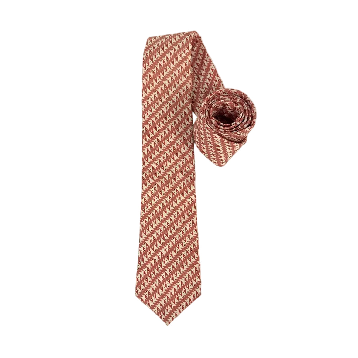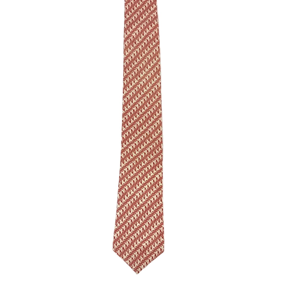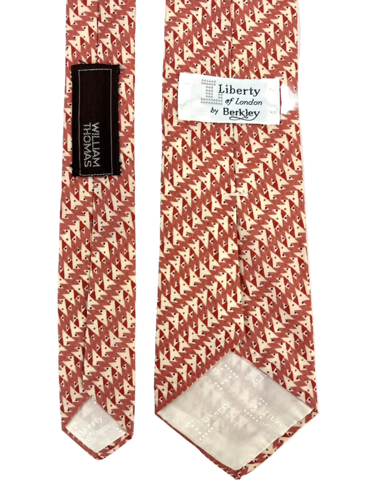 Fabulous vintage geometric tie by Liberty of London made of 100% cotton in England and in excellent vintage condition, with a William Thomas label as well. The angular pattern in soft re, salmon pink, white and maroon has a diagonal stripe.