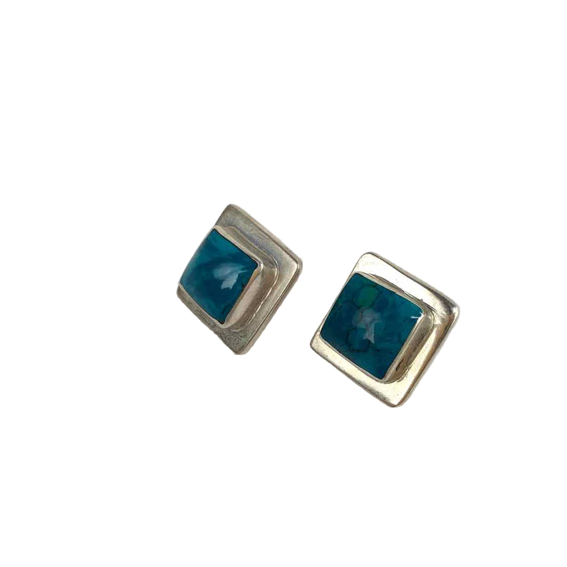 PAIR modern square stud earrings made of sterling silver and what looks like turquoise, with a deep rich color on the slightly rounded cabachons. Stamped .925 Mexico on the backs, with silver backs.