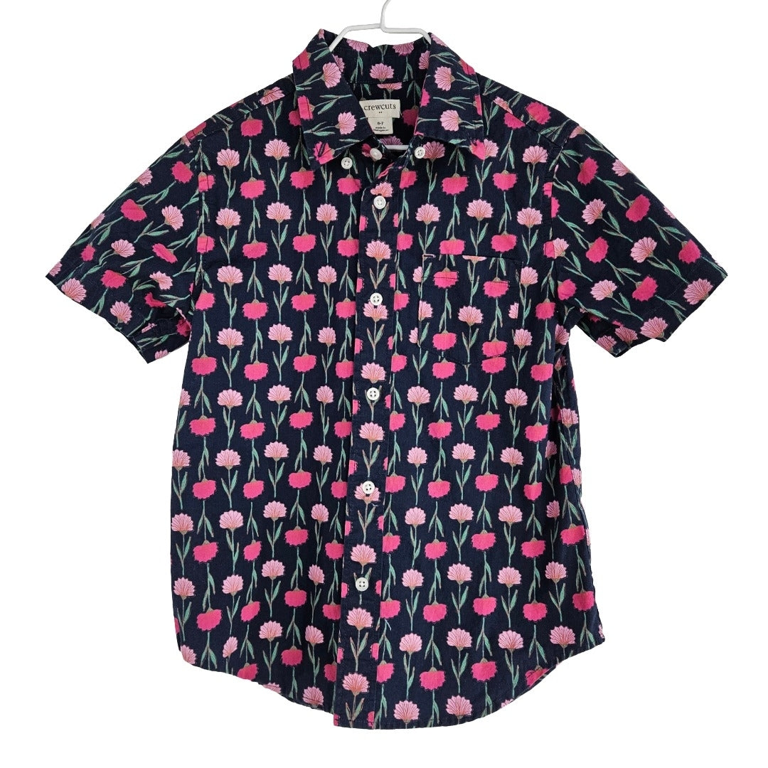 High quality boys short sleeve button up shirt with pink flower pattern on navy, in very good vintage condition. Made in Madagascar of 98% cotton and 2% elastane.