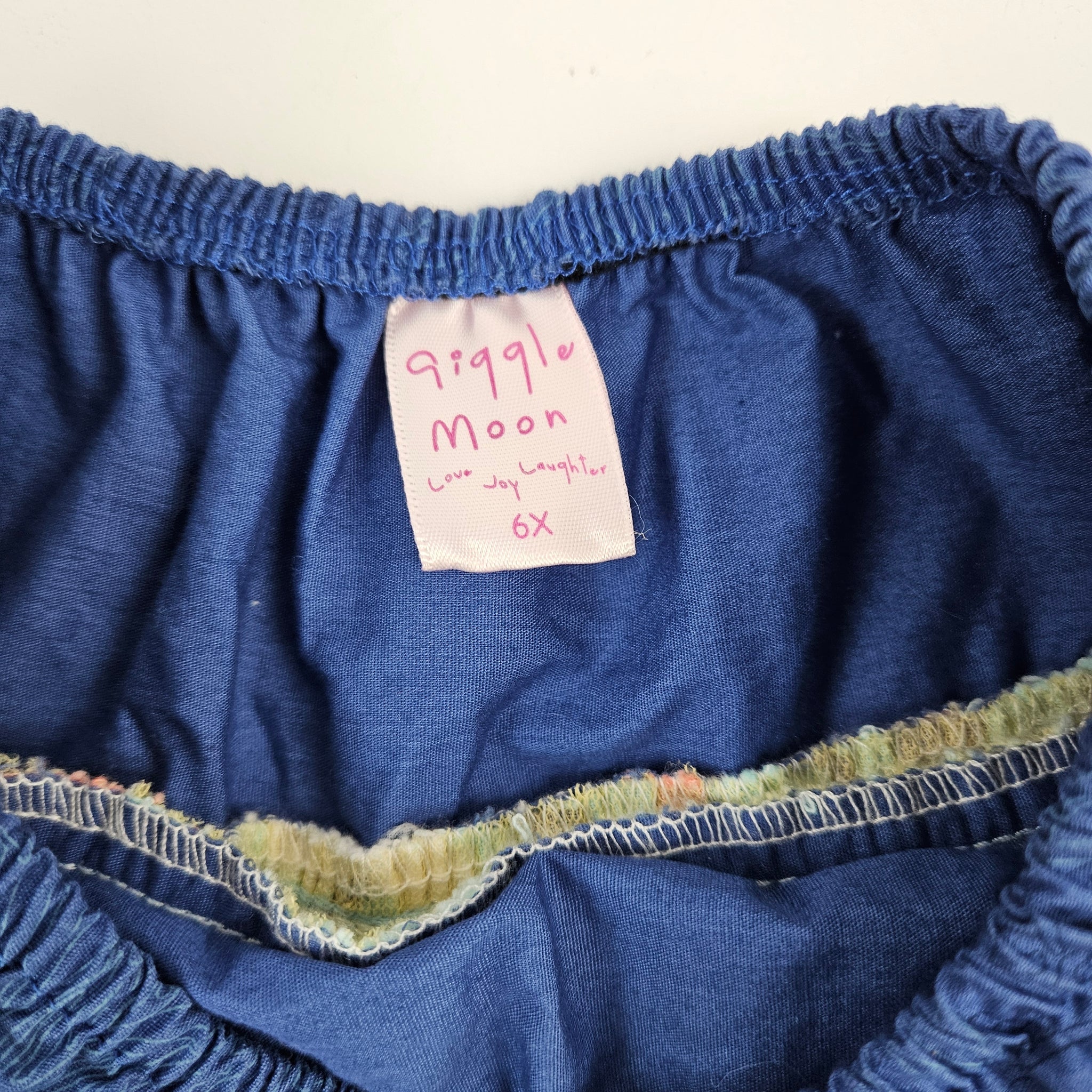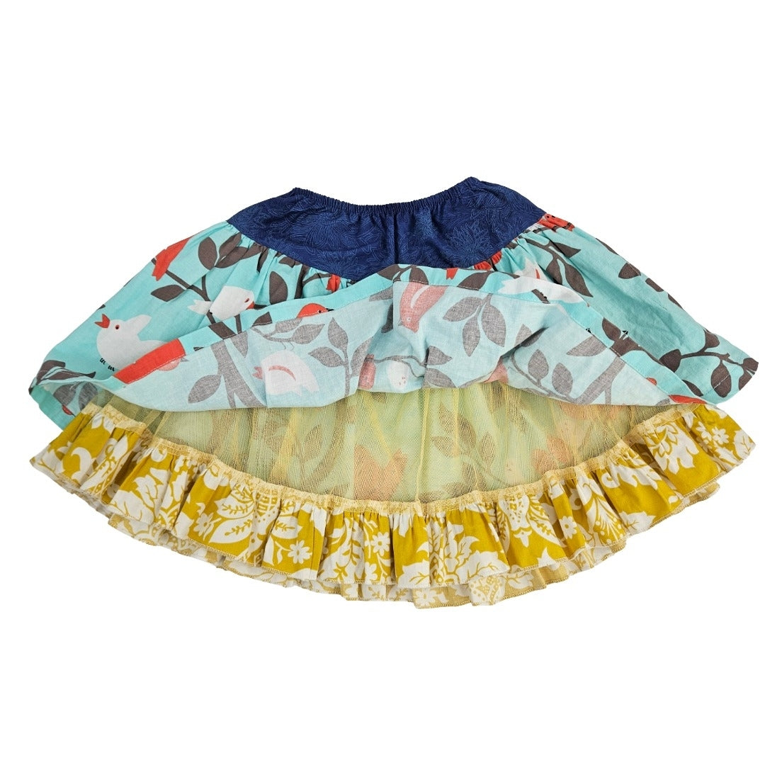 Fabulously eclectic double layer skirt by Giggle Moon. The waist is javy with fine line designs, the main fabric is a modern cartoon bird design on aqua, and the underskirt is mesh with a mustard and white floral trim. Excellent secondhand condition.