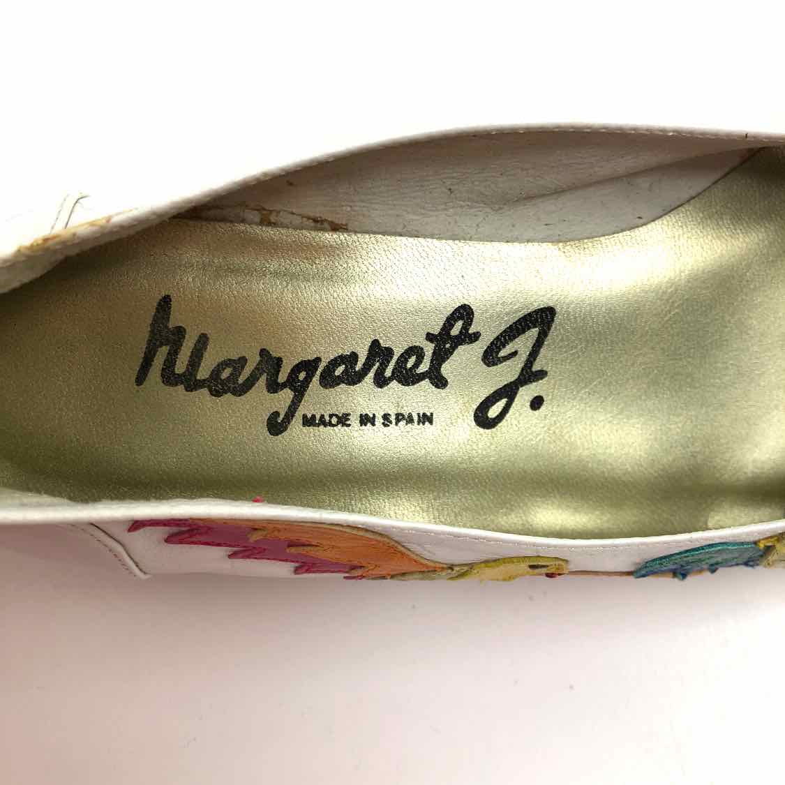 Timelessly chic Spanish leather espadrille wedge shoes by Margaret Jerrold in white leather with multicolor parrot birds with brass etes. In good vintage condition with some soiling on the soles and some yellowing on the glue.