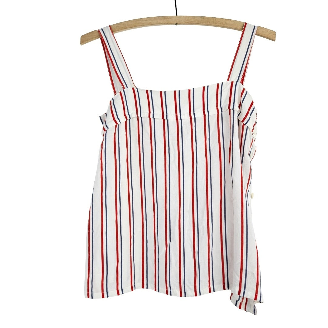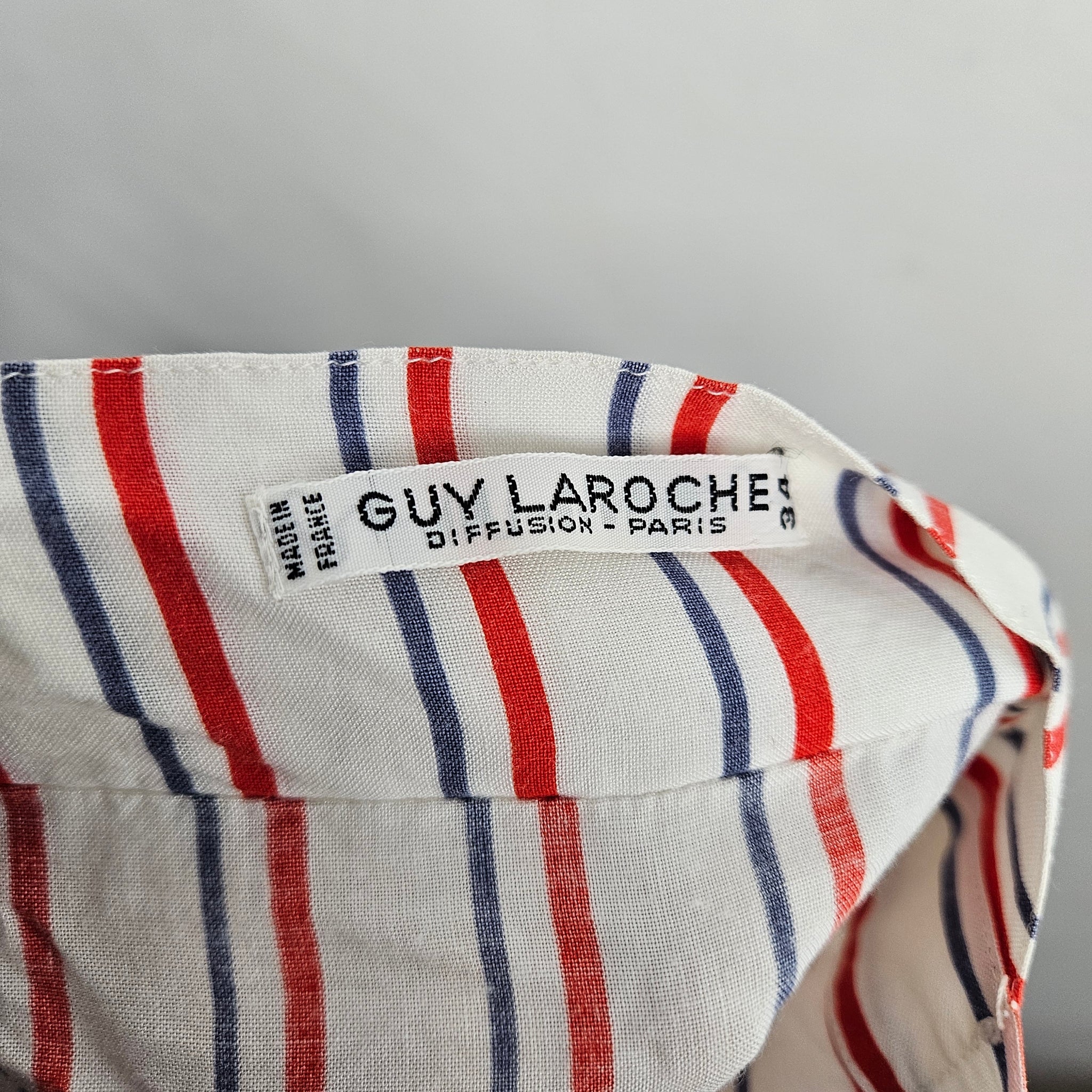 Fabulous sleeveless French blouse with red and blue stripes on breezy white fabric with buttons down one side, made in France by Guy Laroche. In very good vintage condition, but if you look closely you'll see one button has been replaced.