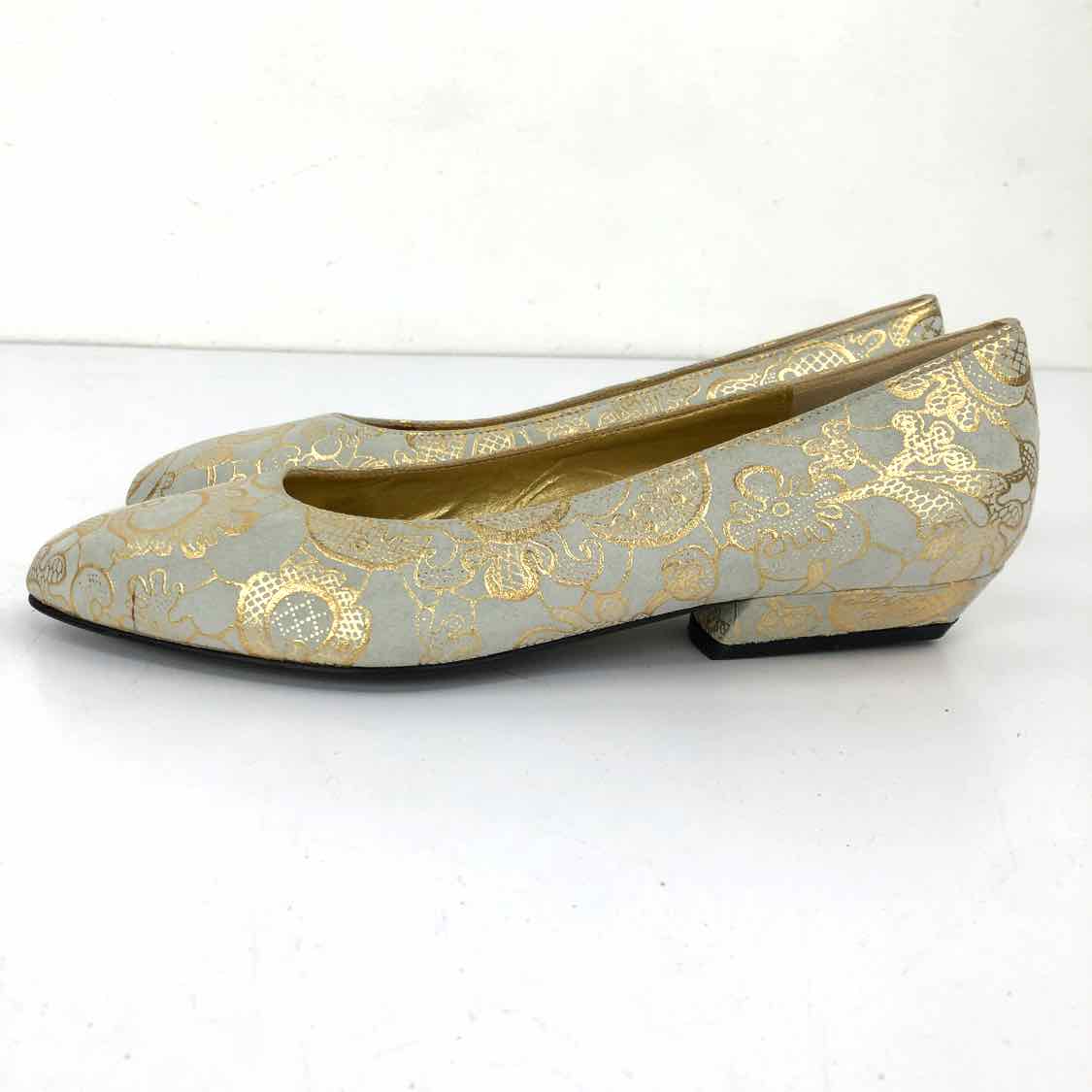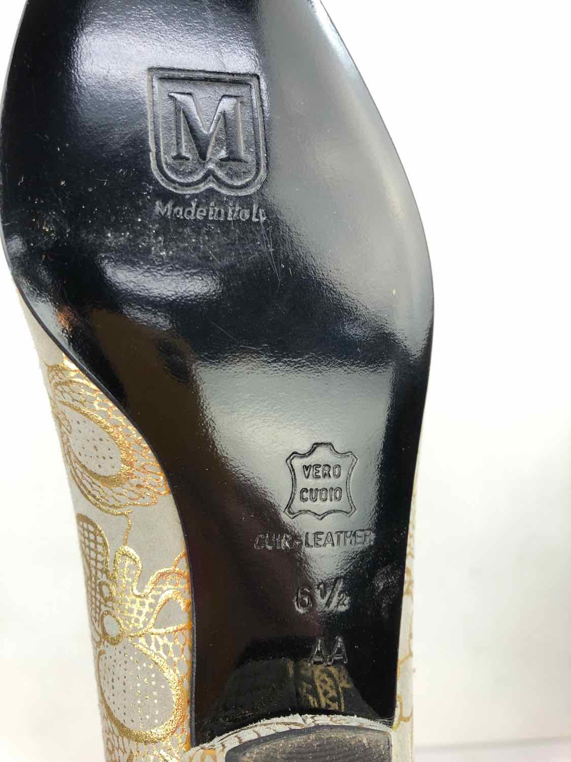 Gold & ivory Italian flats by designer Bruno Magli in a small and narrow size. Made of leather with abstract modern design in metallic gold. The soles look unused, and they are in very good vintage condition with a little heel narrowing from storage.