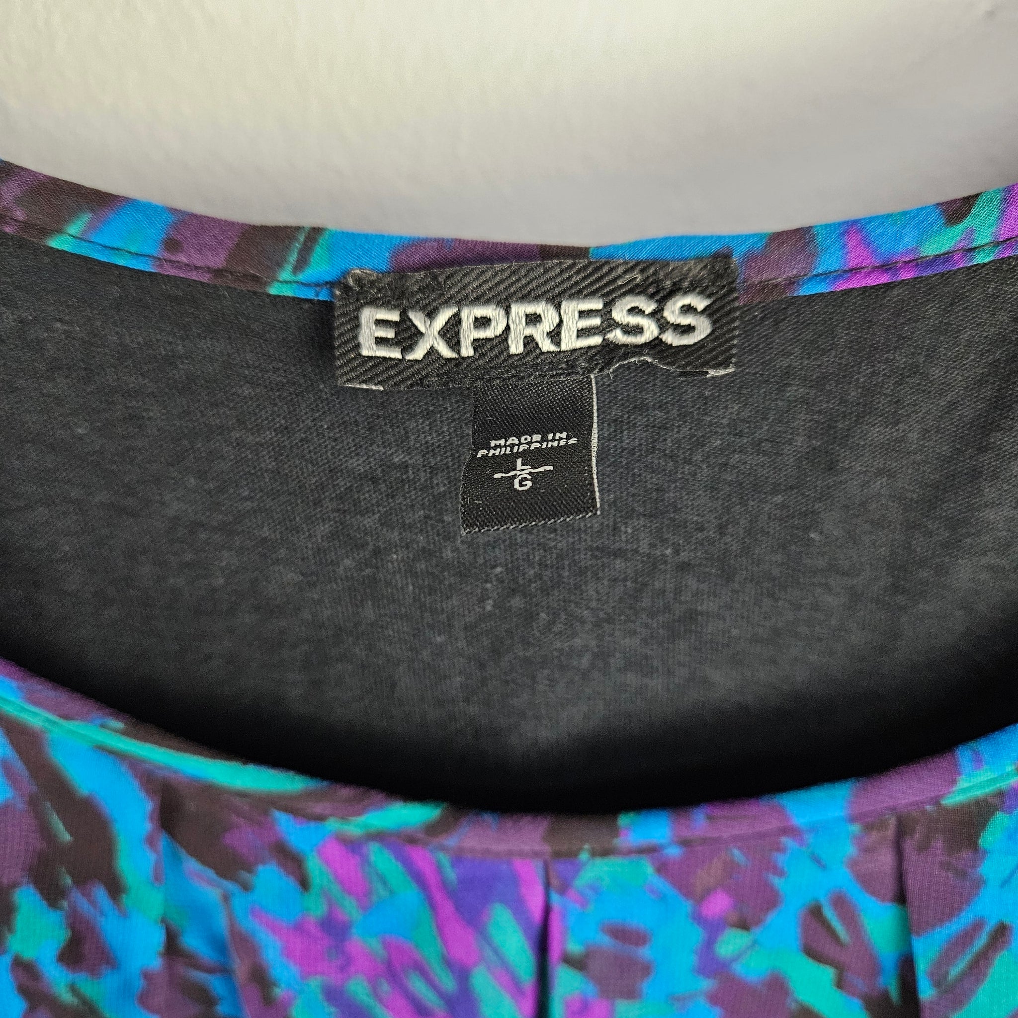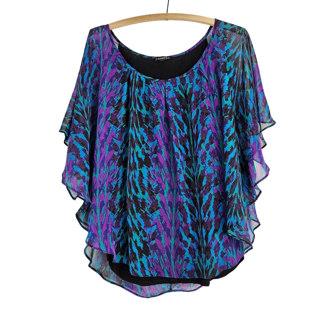 Flowy jewel toned blouse by Express with purple, blue, green & black sheer layers over a black tank underneath. In excellent secondhand condition, ladies size Large with some stretch to the cotton/modal undershirt. Overlay is 100% polyester.
