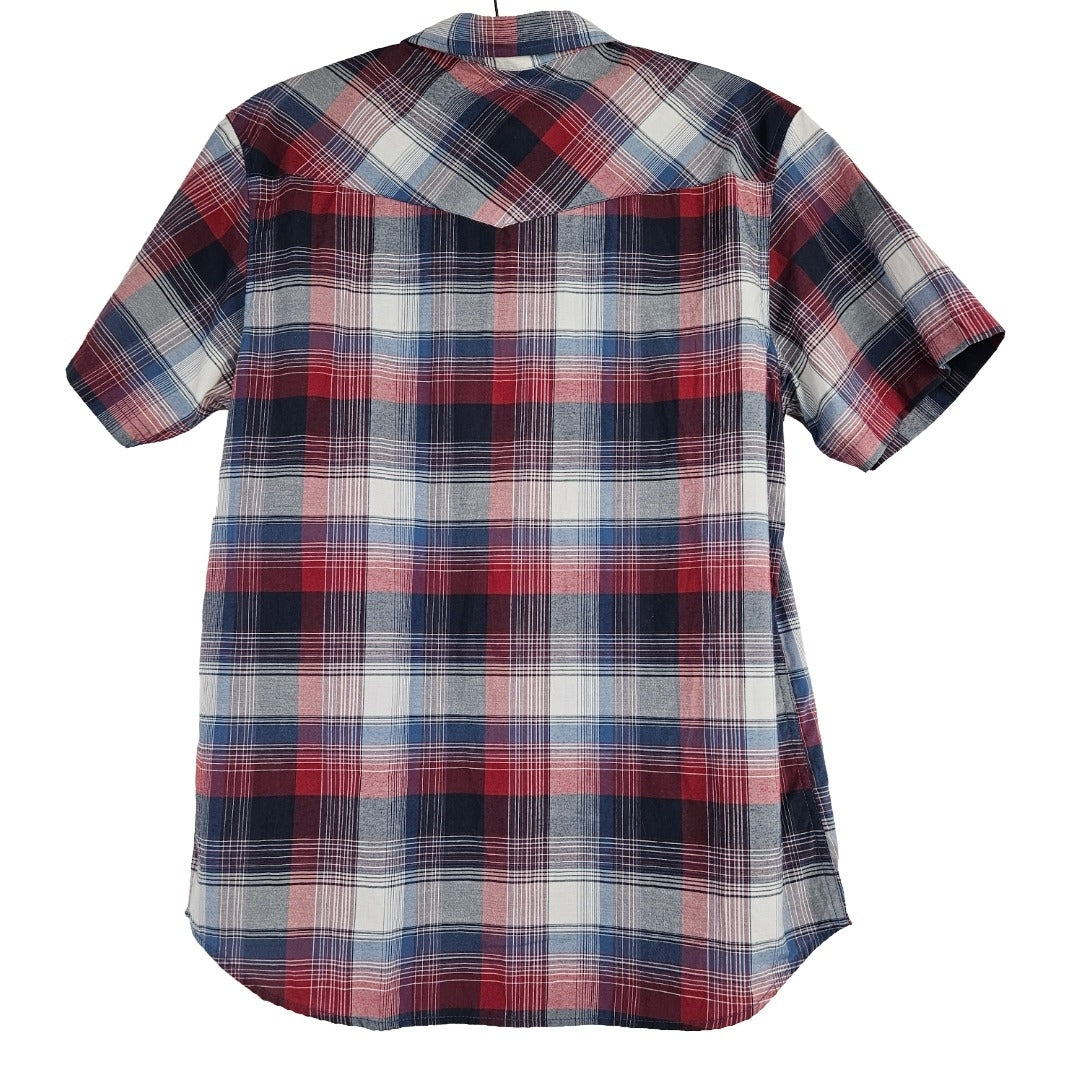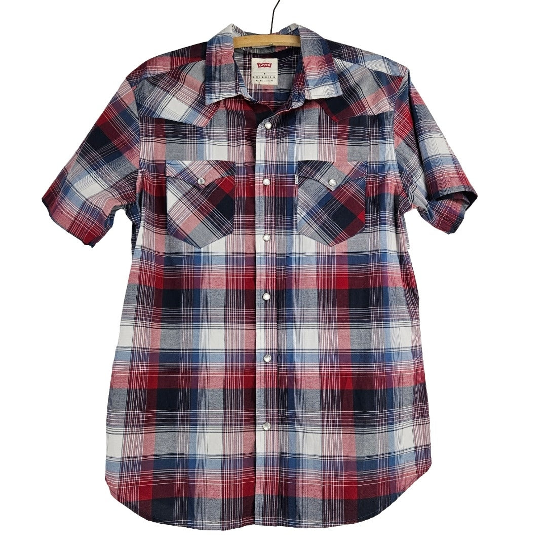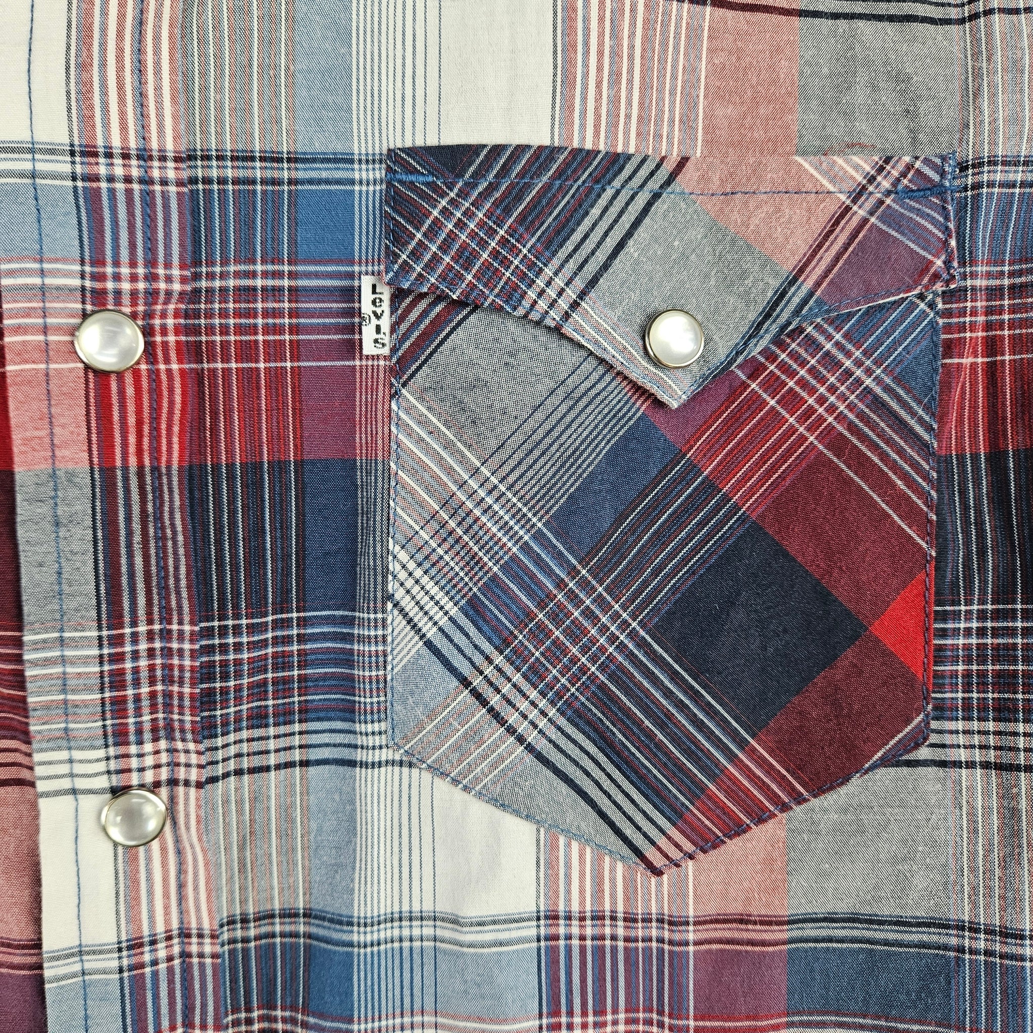 Levi's men's pearl snap Western shirt in red, white and blue plaid, in excellent secondhand condition and made in Egypt of 60% cotton, 40% polyester. Labeled Standard Fit.