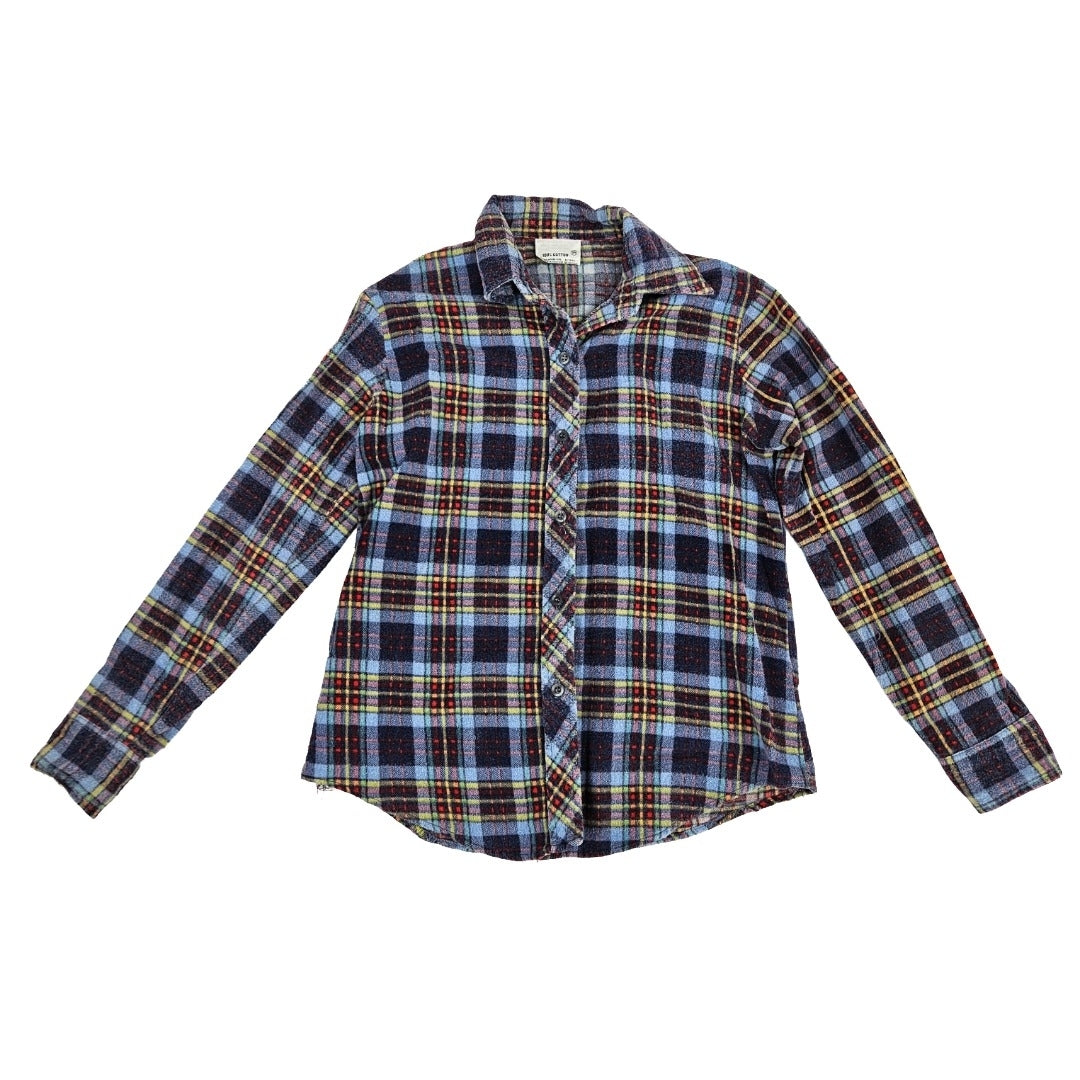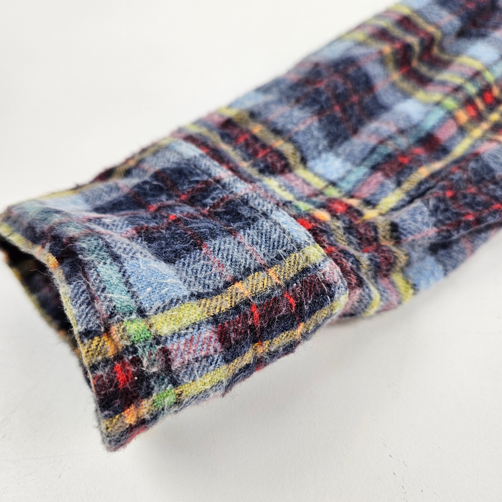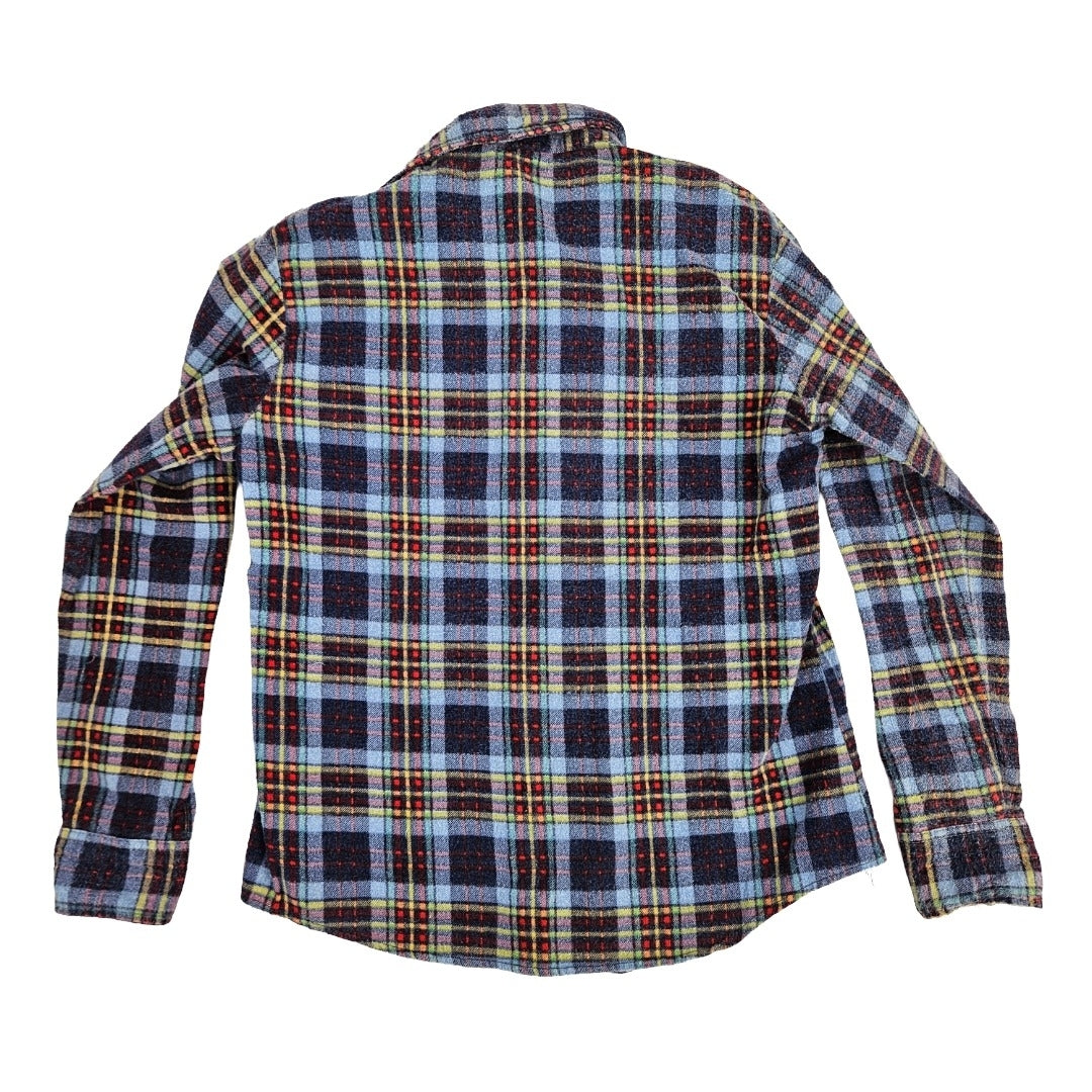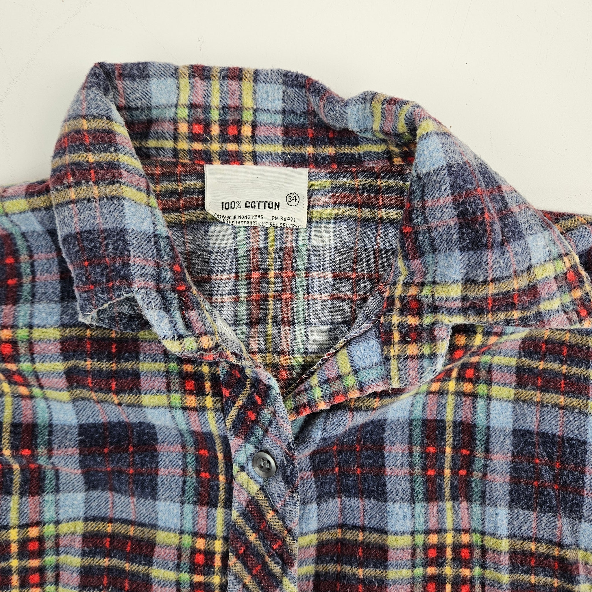 Soft vintage plaid long sleeve button up shirt made in Hong Kong of 100% cotton in blue with red and yellow accents. The size says 34, and looks like a women's XS or a child's size 10-12. In good vintage condition with some fuzziness from age.