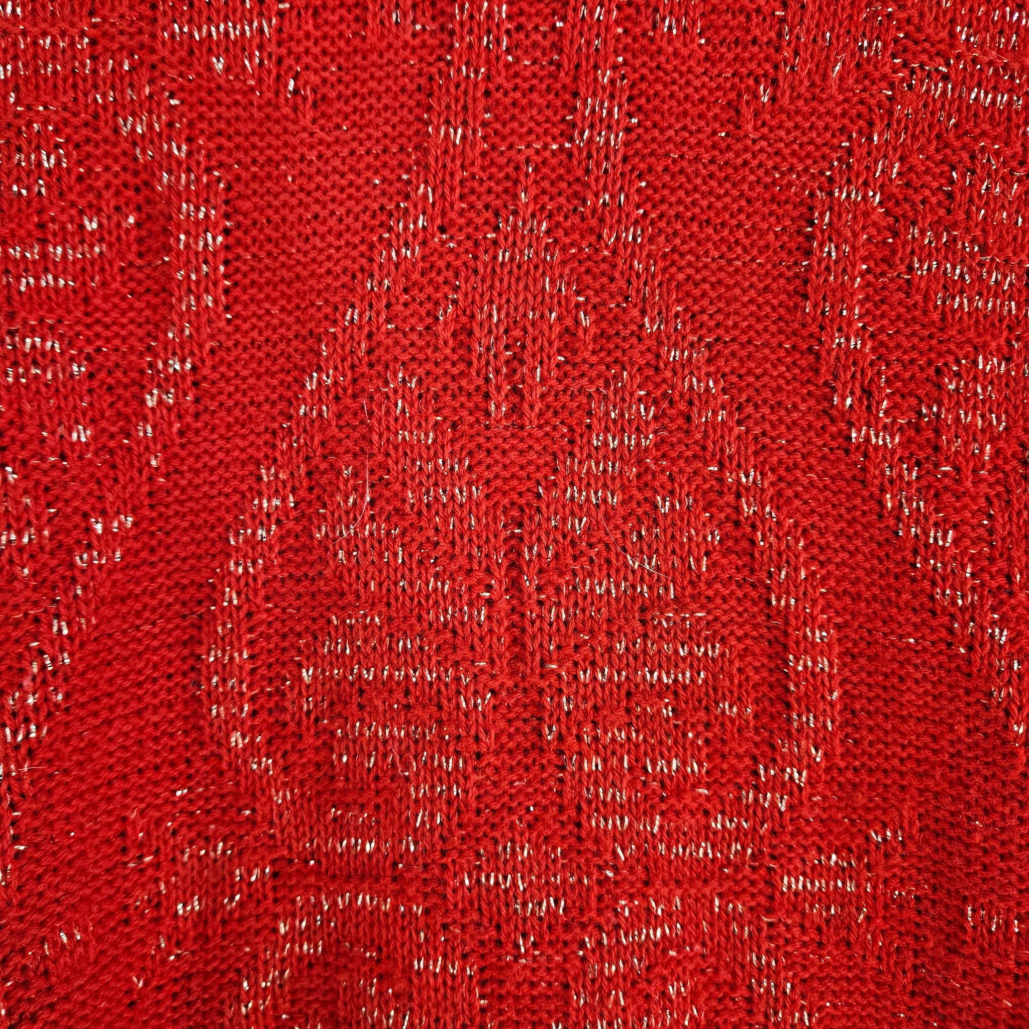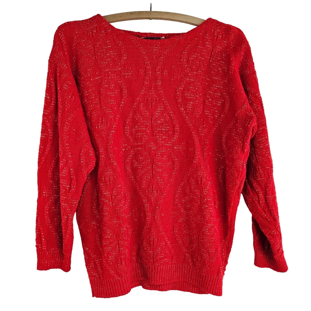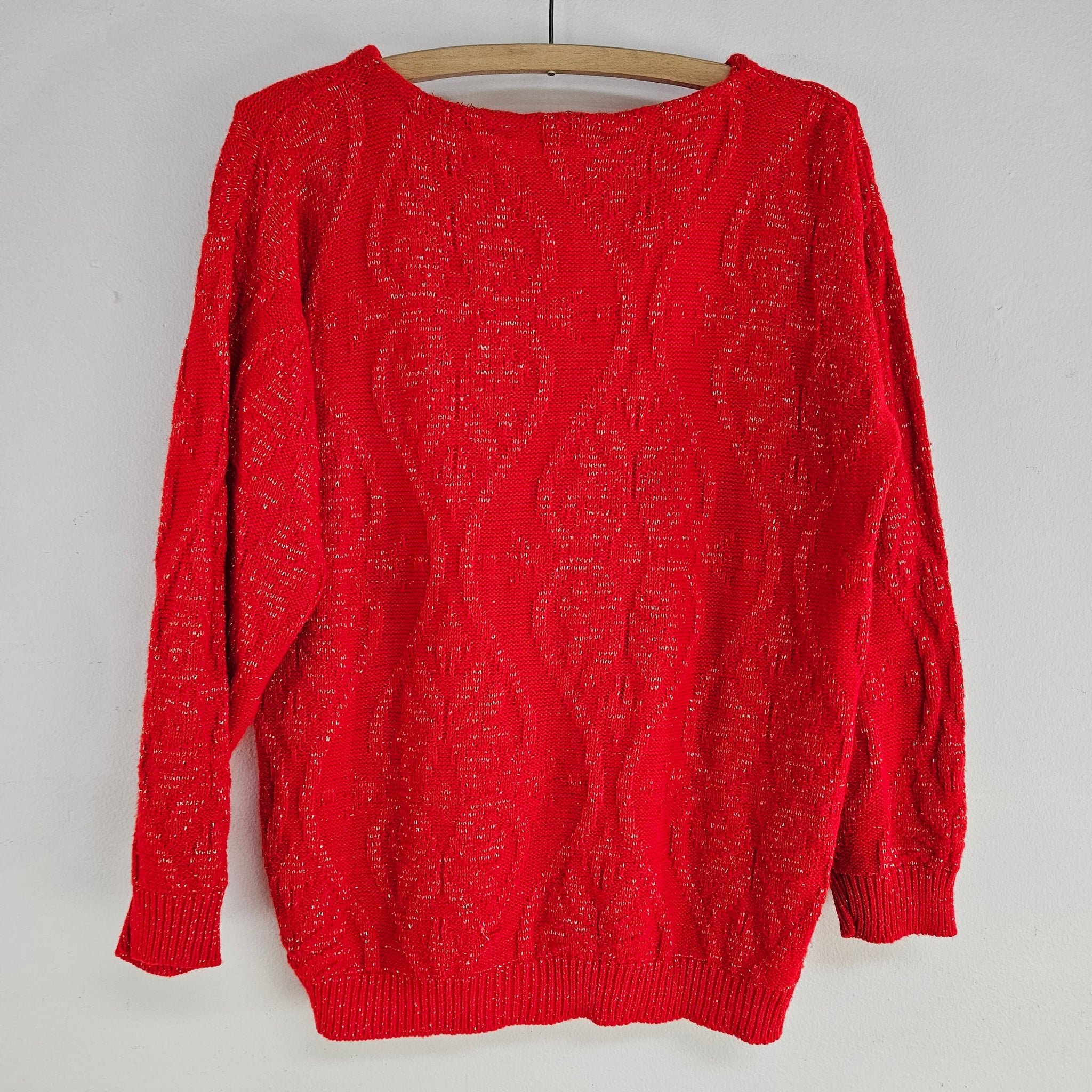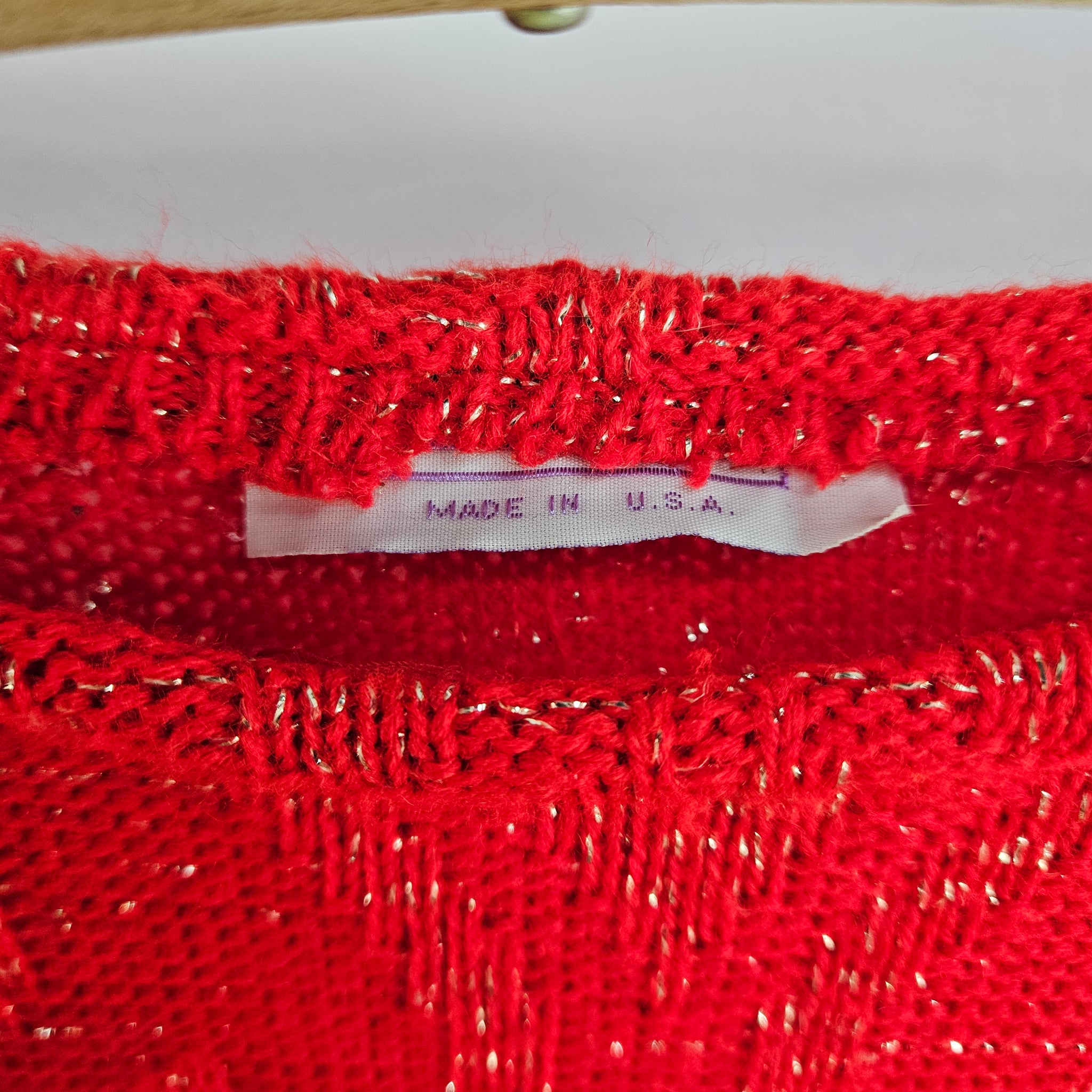 Bright red knitted sweater c. 1980s made in the USA by Arielle, with metallic silver thread and 3/4 sleeves. In excellent vintage condition and timelessly chic.