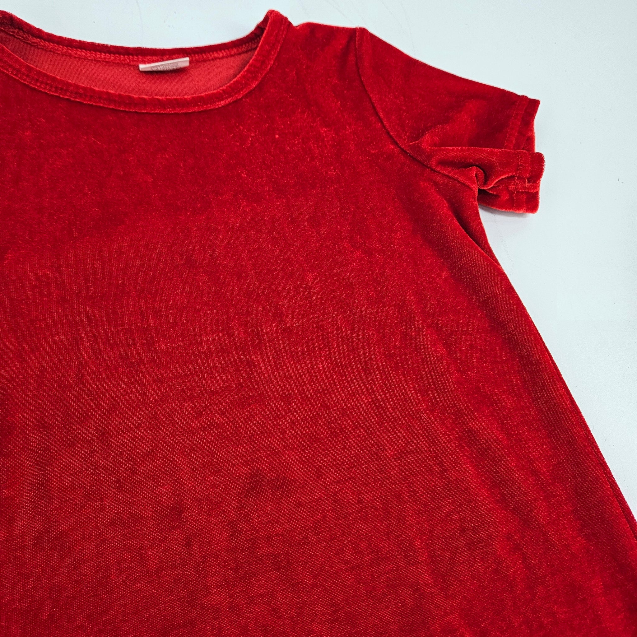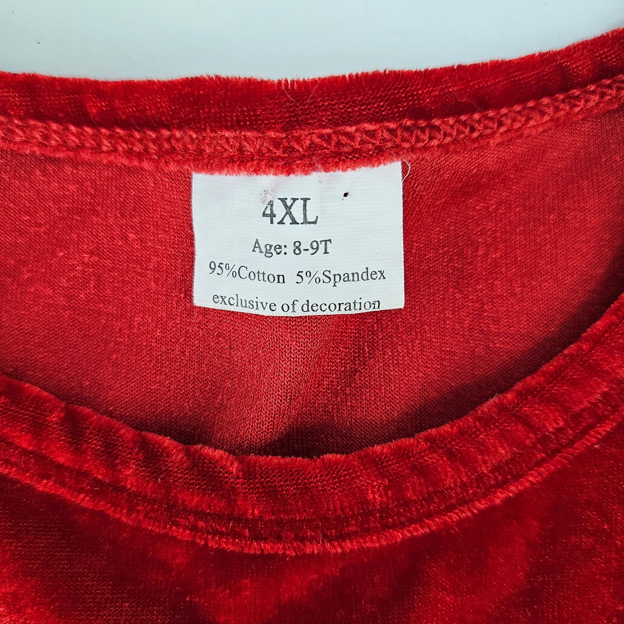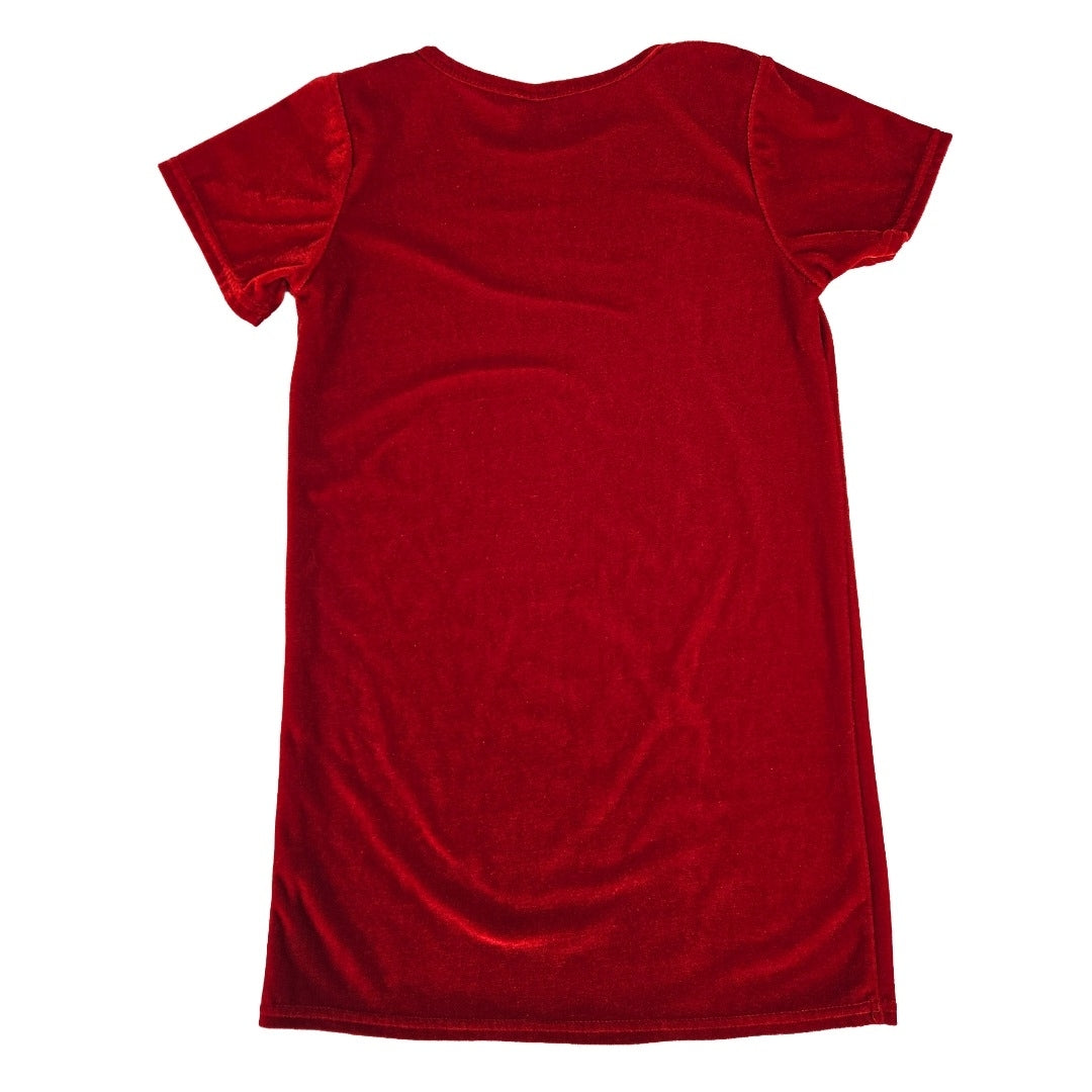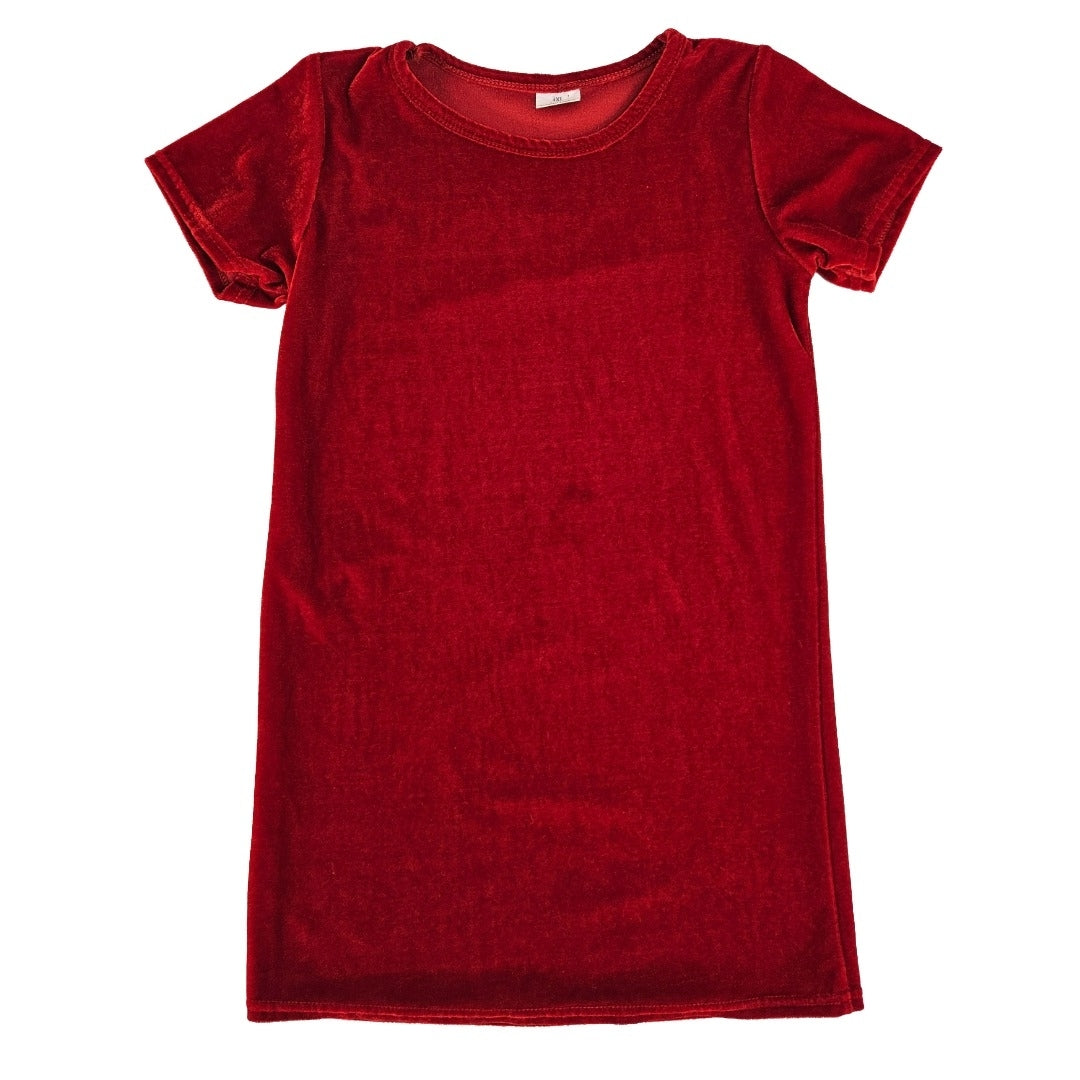 Red velvet girls mini dress with short sleeves, soft bright red velvet made of 95% cotton and 5% spandex. Marked 8-9T. Flat measurements: 26" long, 15" across armpits.