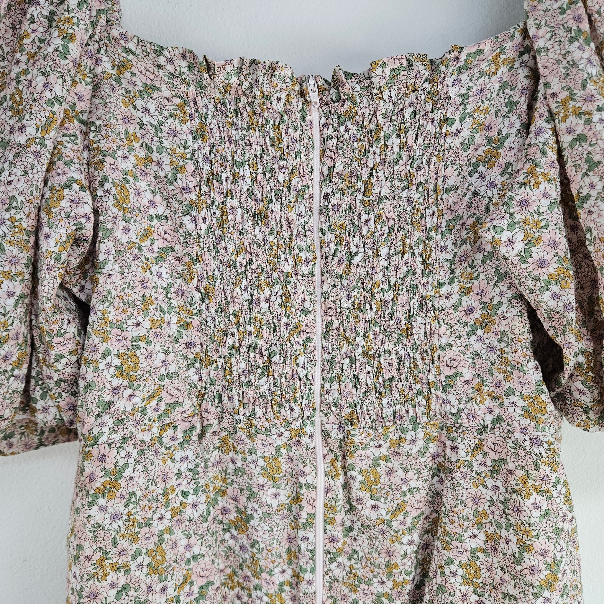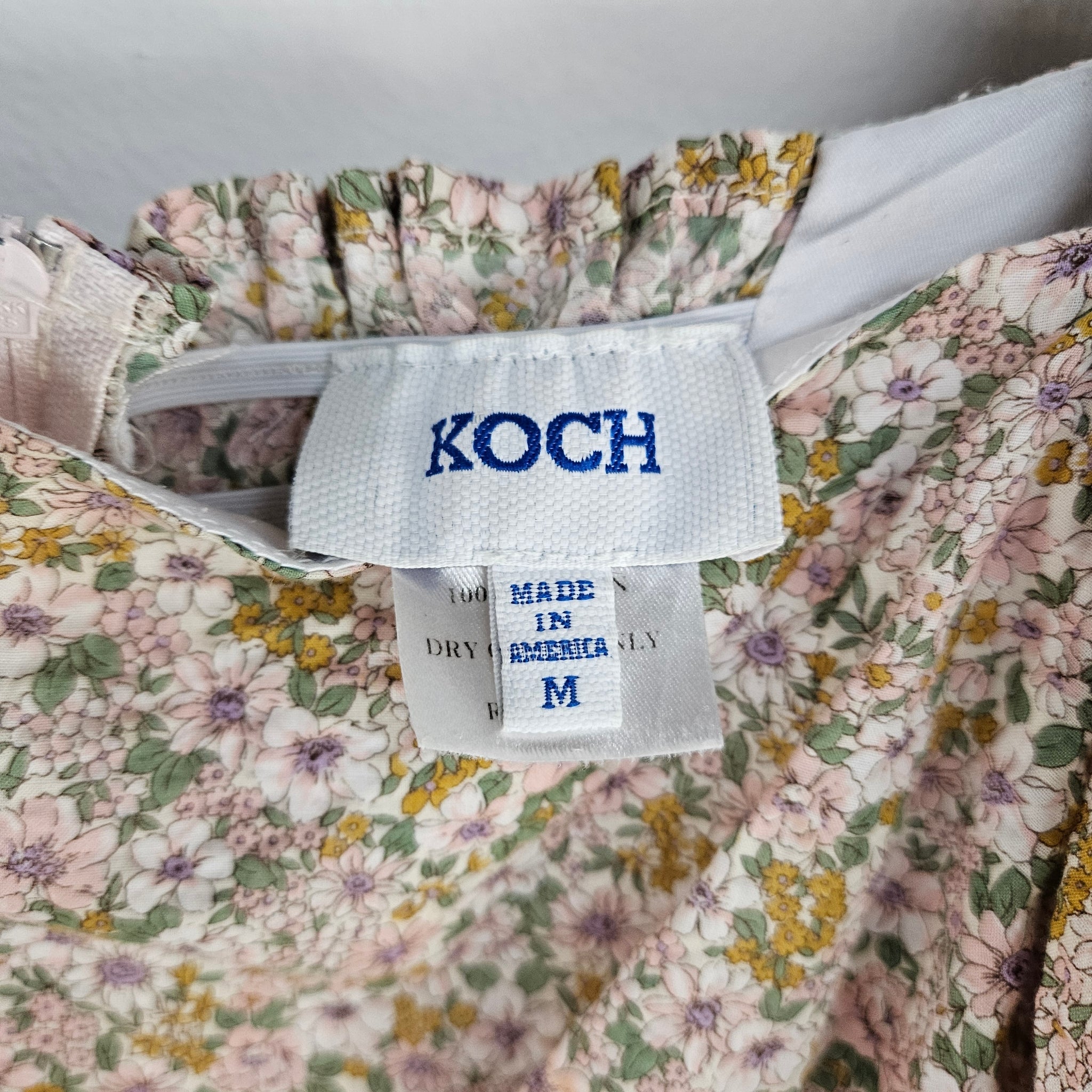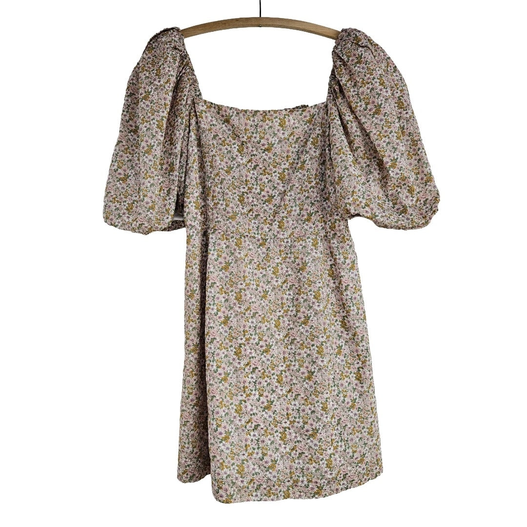 Neutral floral boutique ladies mini dress in lightweight and breathable 100% cotton, with large sleeves and delicate floral pattern, lined in white satin. Retails over $300, made in USA. In excellent secondhand condition. Dry clean only.