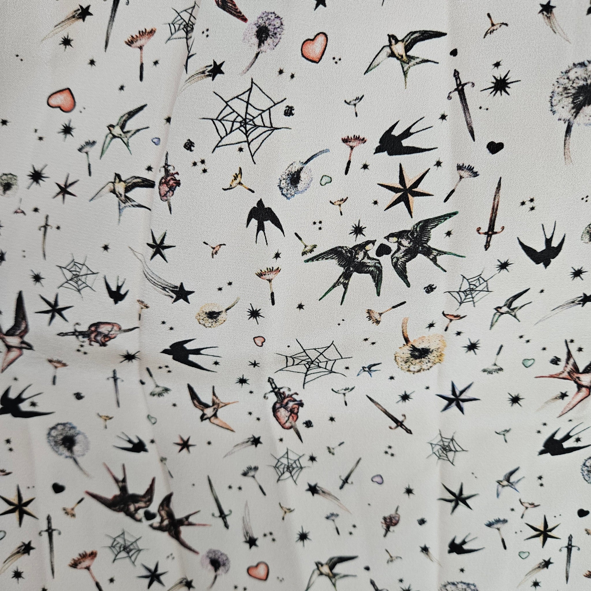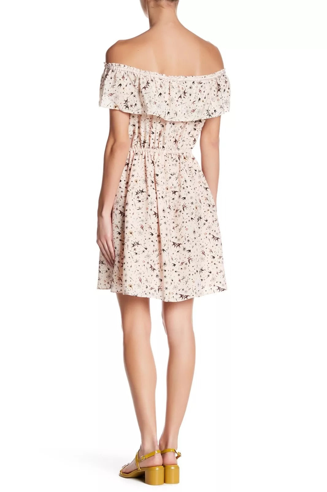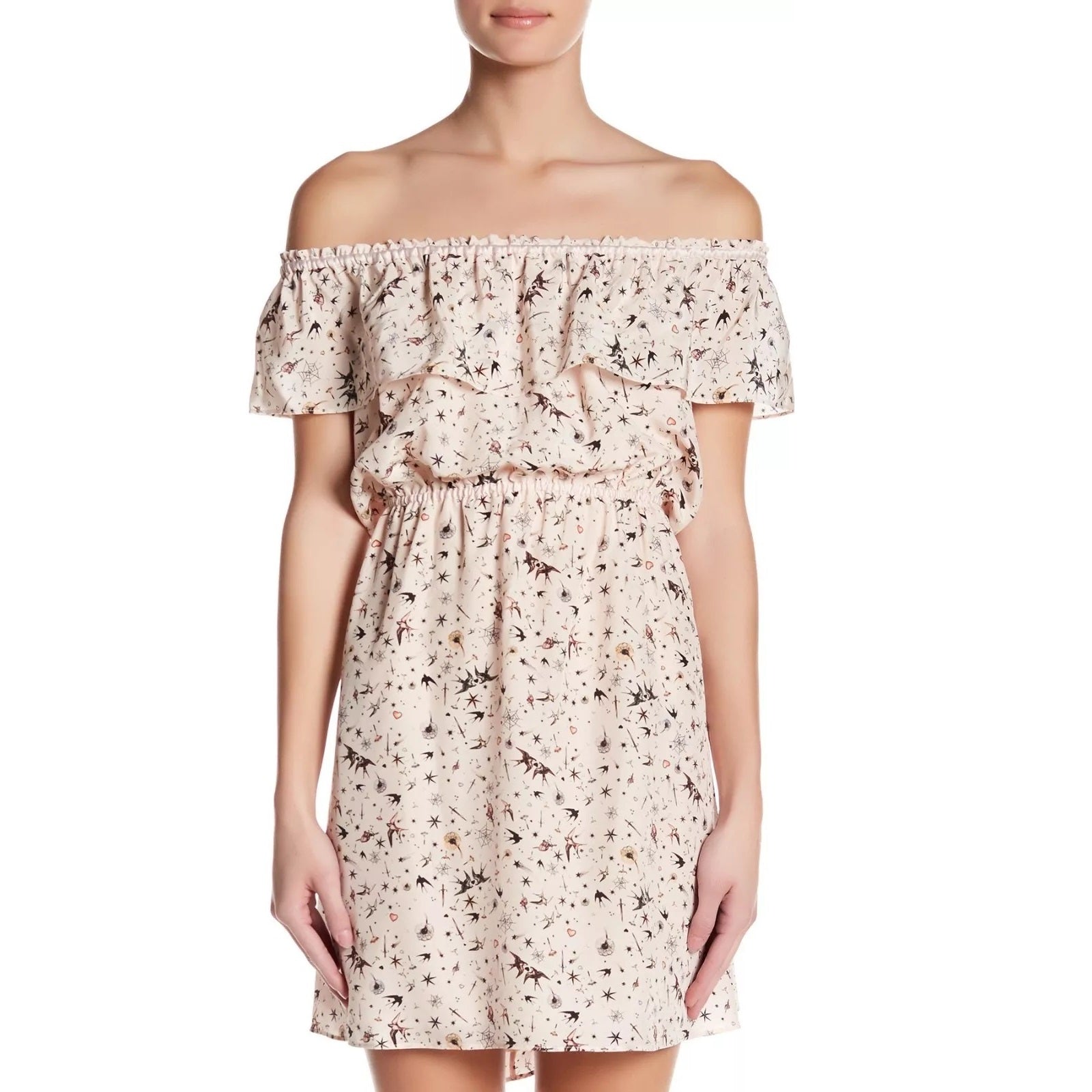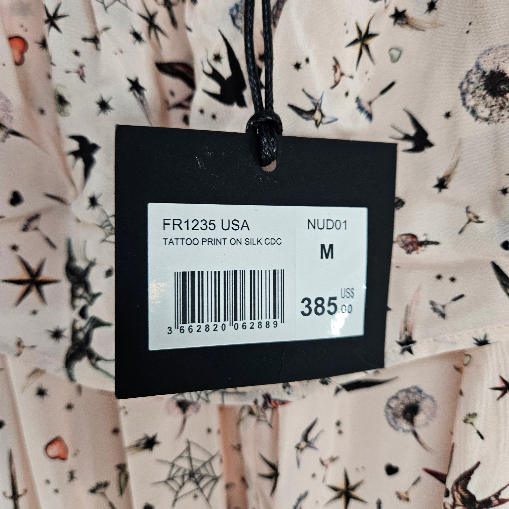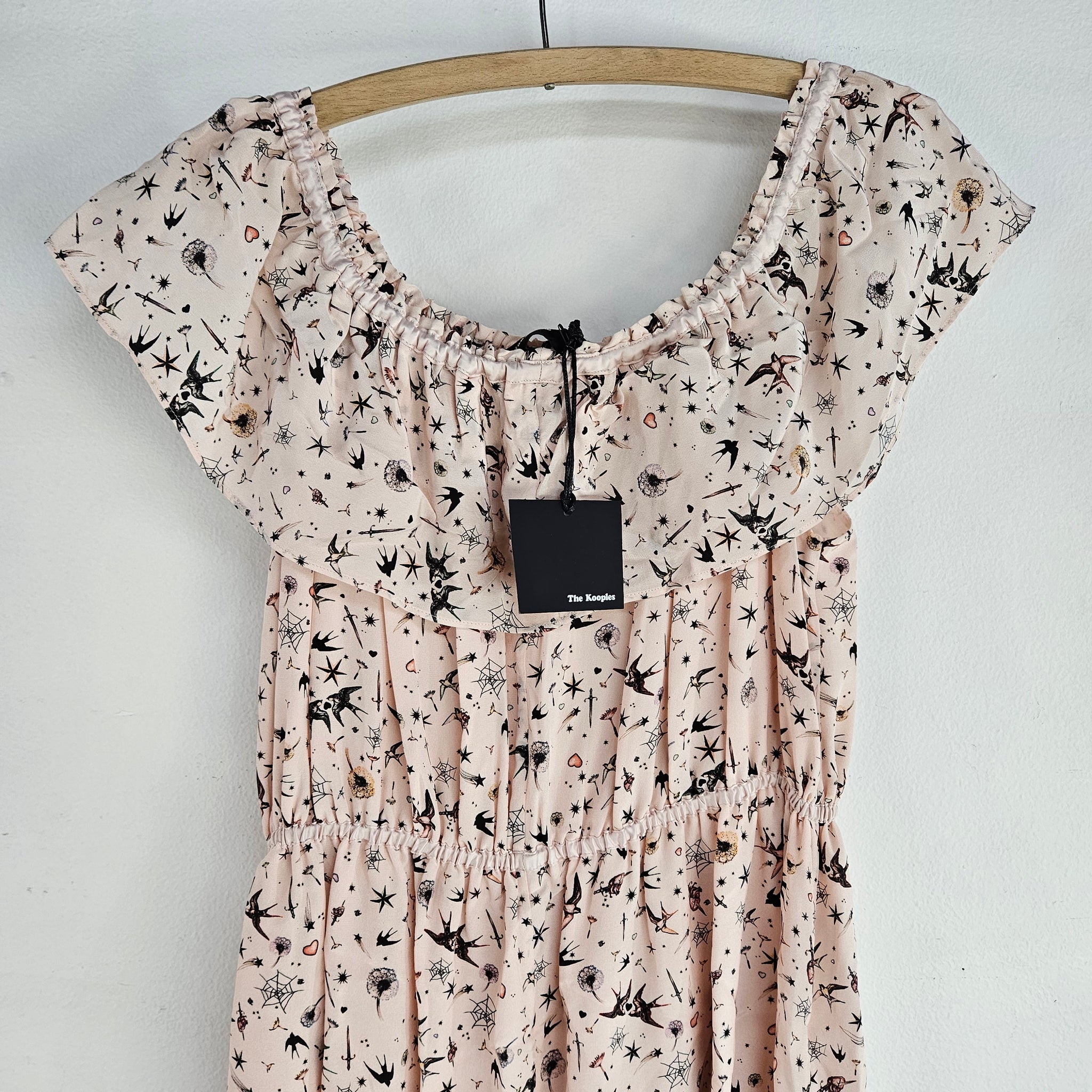 Pink Tattoo Print silk dress by The Kooples, new with tags. Retails #385. A ruffled off-the-shoulder neckline and thigh-grazing hem with shirring at the waist. Lined, dry clean only.