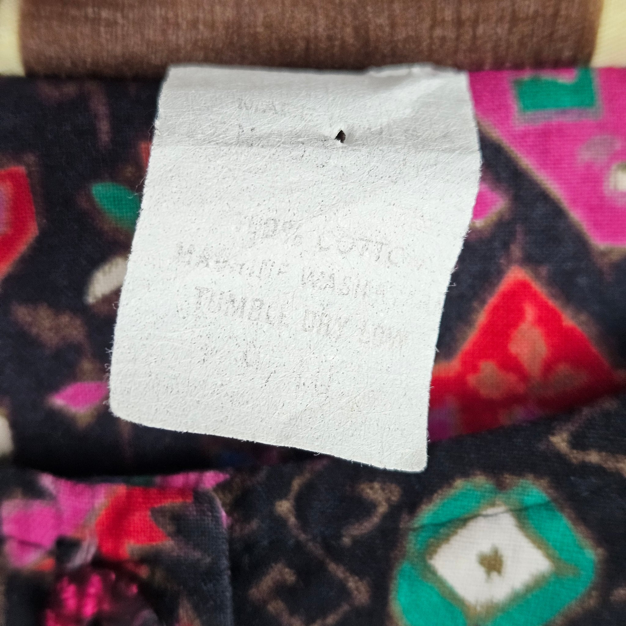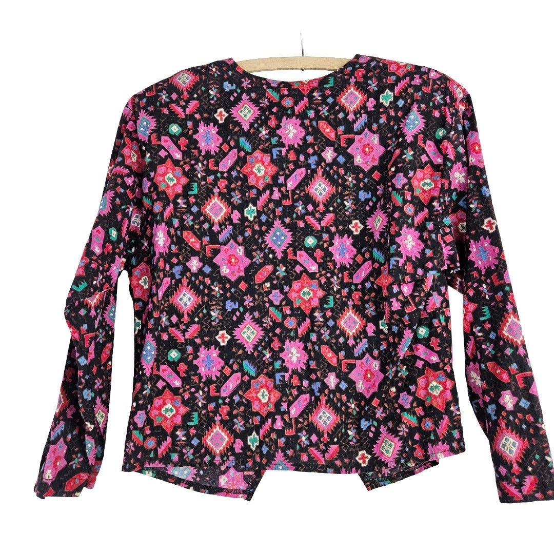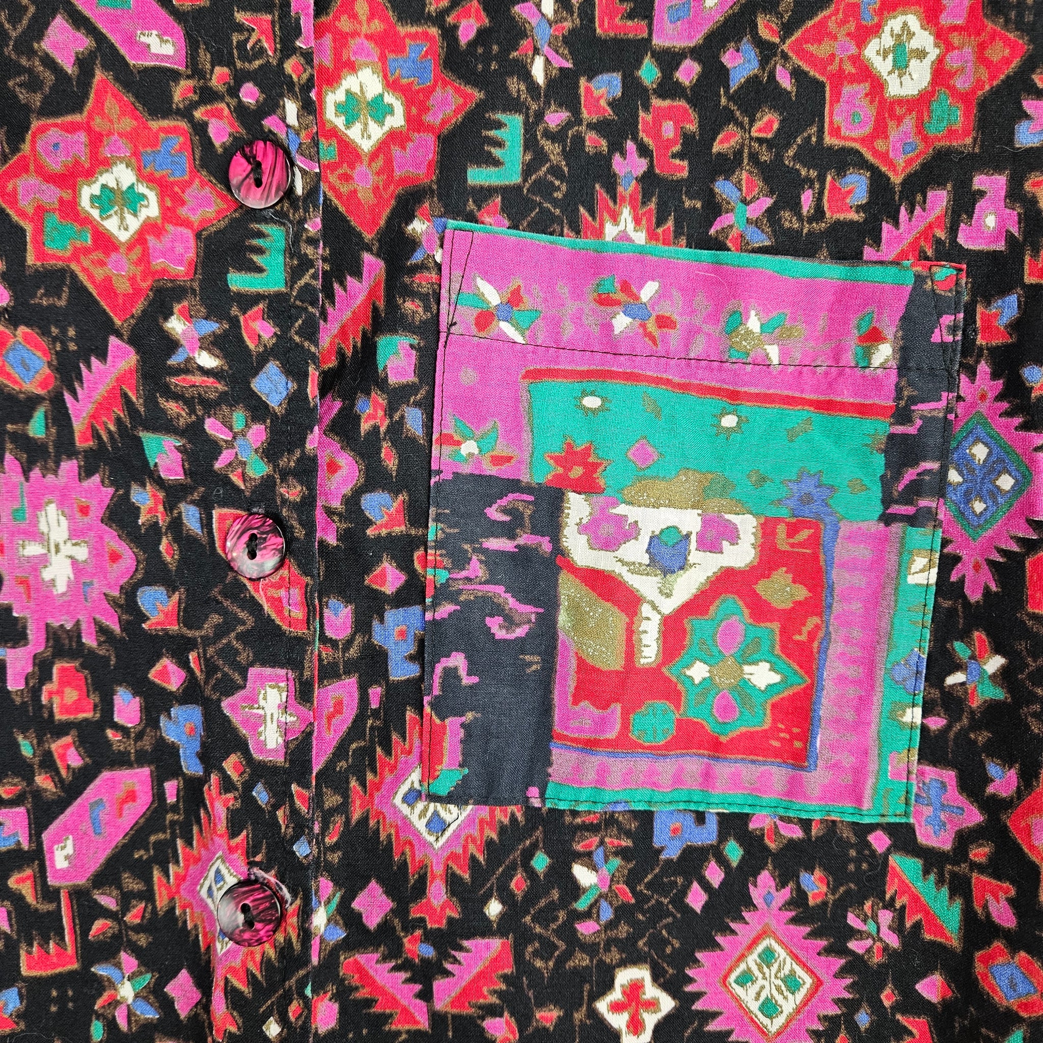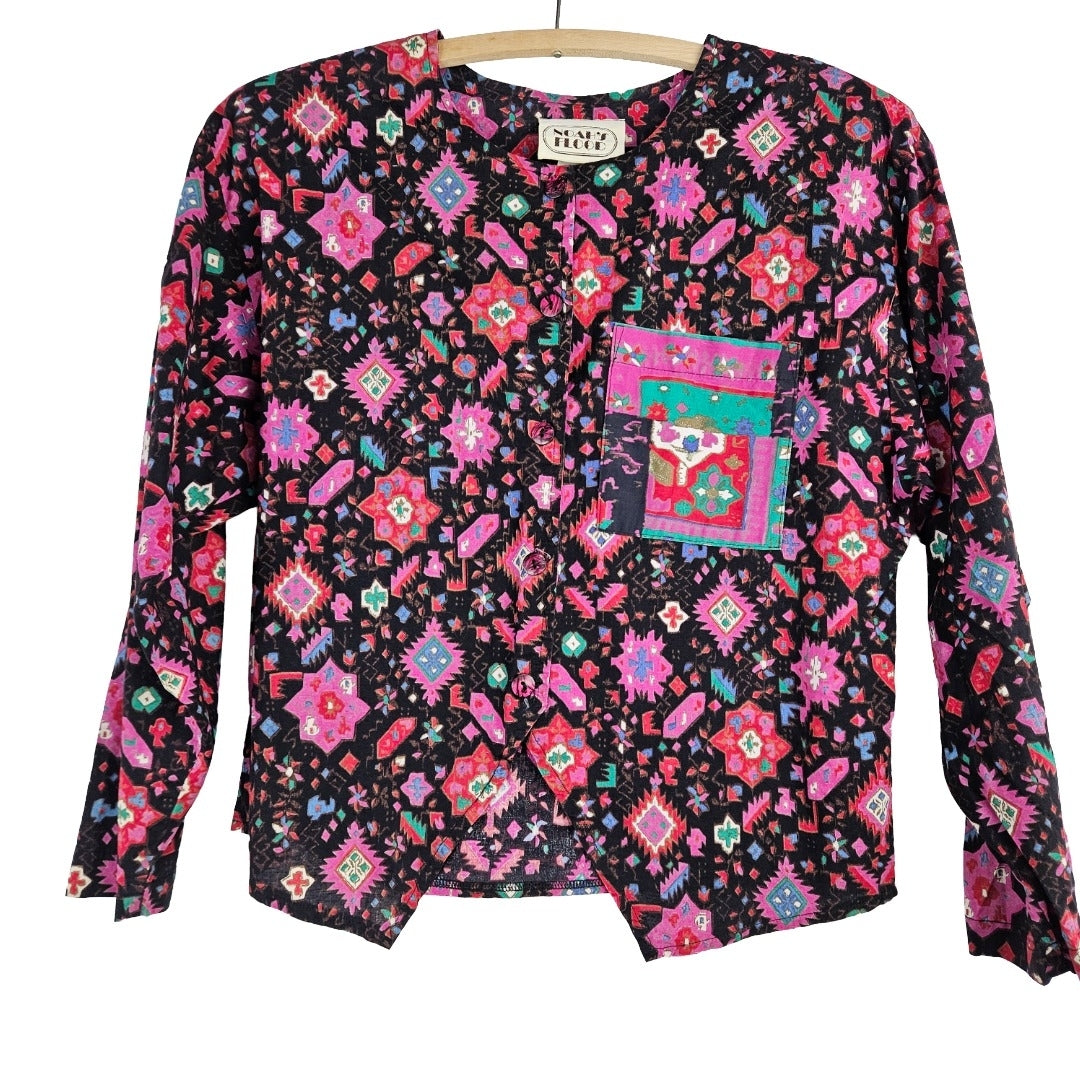 The bold pattern on this WEstern ladies crop top has red, pink, green and blue on black. Includes removable (velcro) shoulder pads and iridescent pink/black buttons. Very good vintage condition, made by Noah's Flood in the USA. Size 9/10.