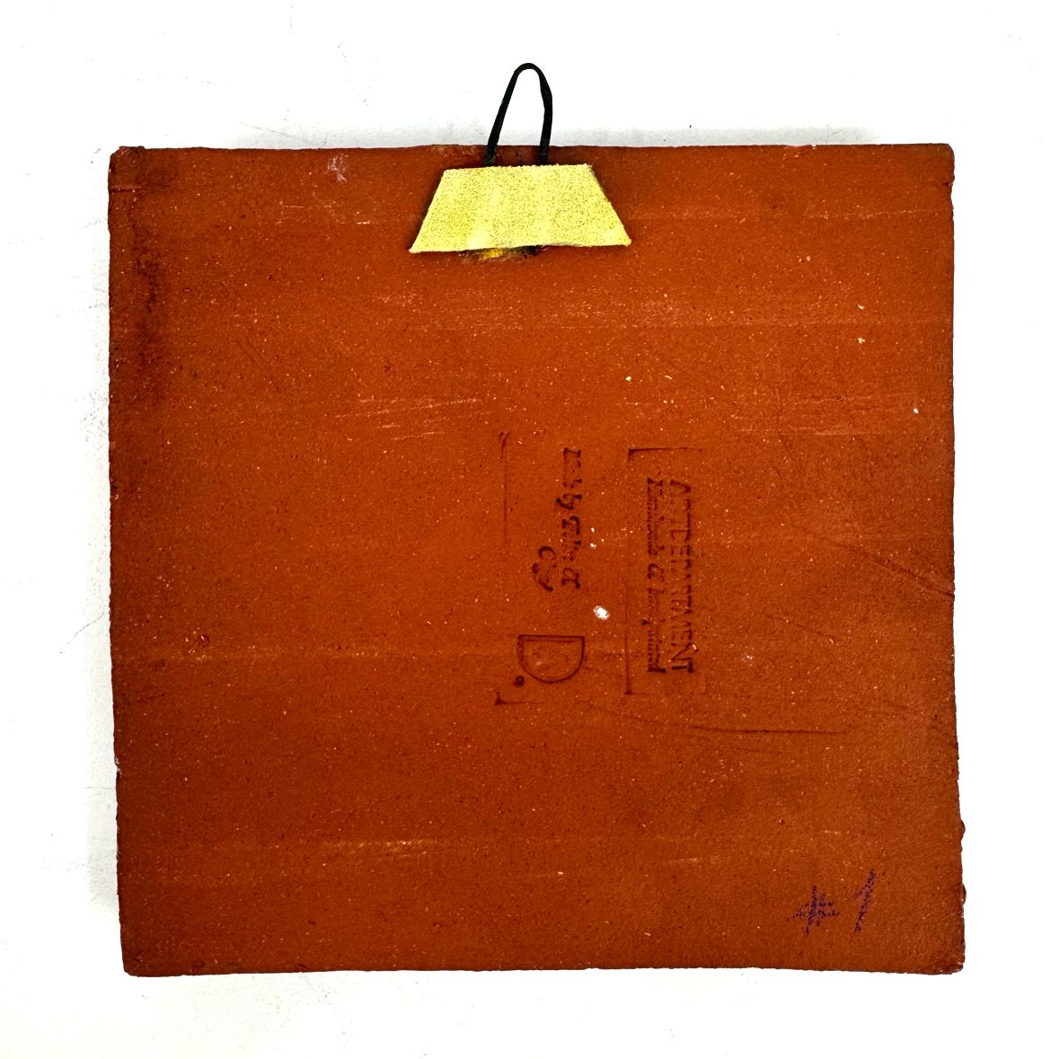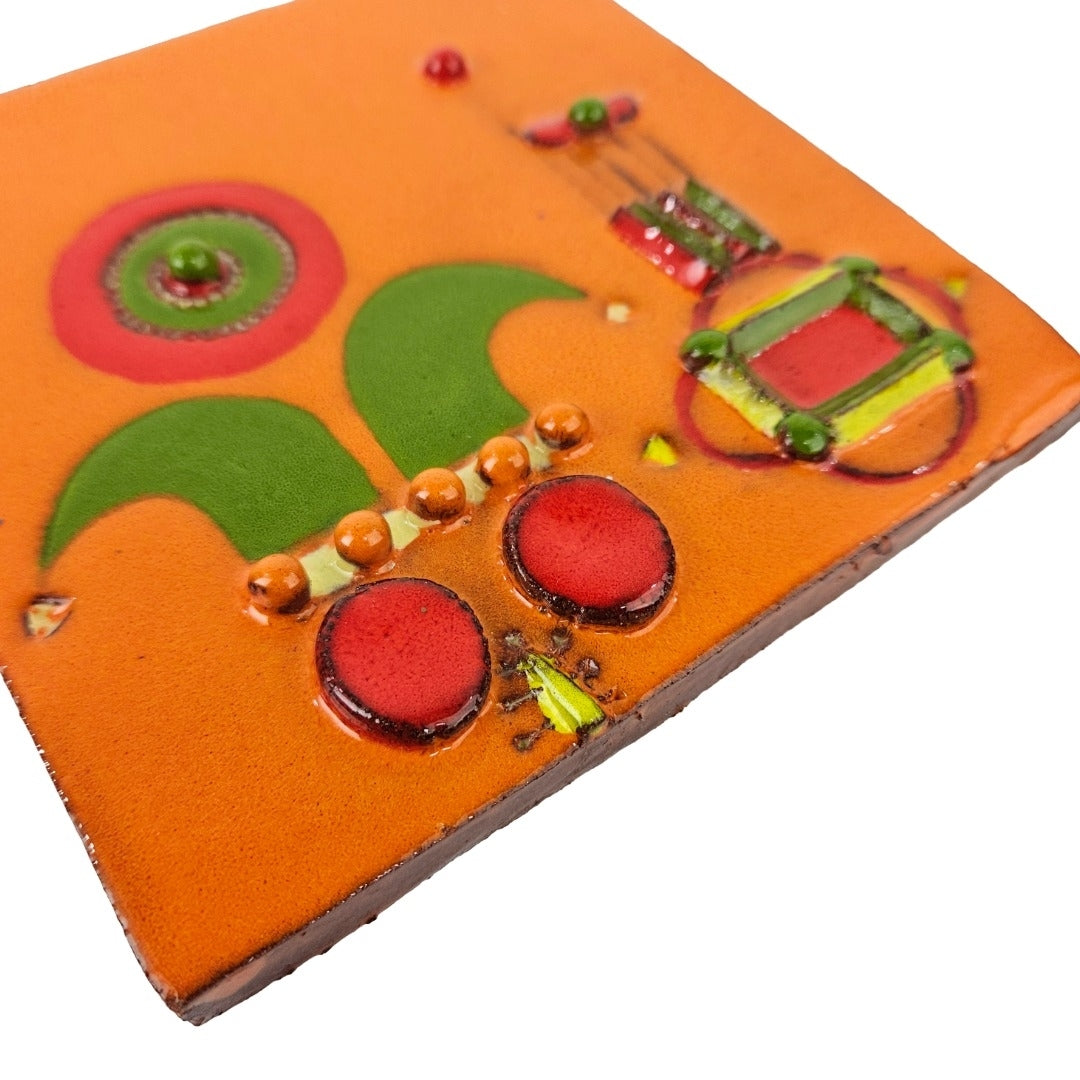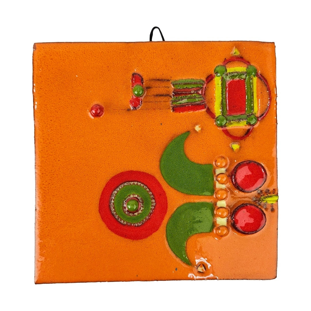 Modern art tile in orange with yellow, red and green accents, made by artists Felix Kniazev and Olga Julinska for Art Department Studio. Includes a hanger. In very good vintage condition with a small corner chip as shown.