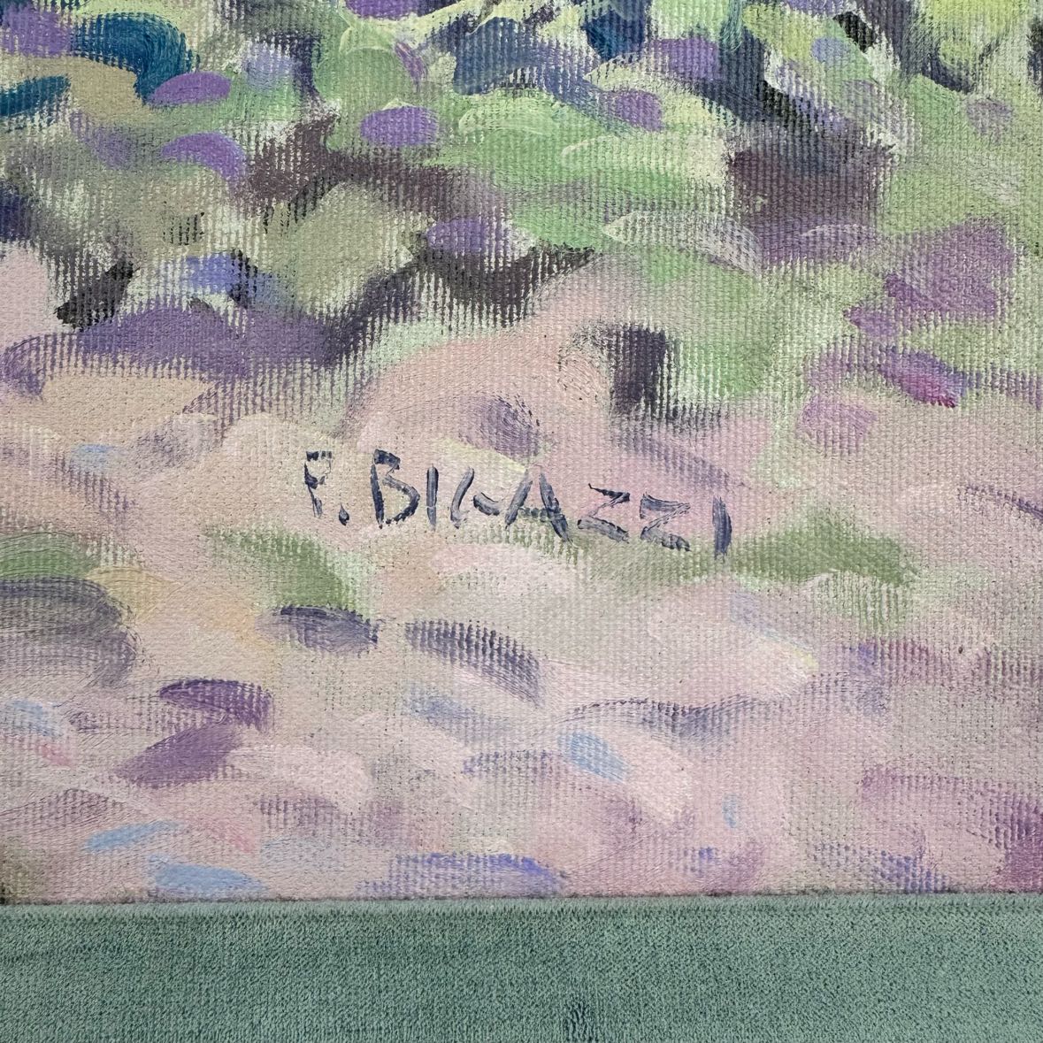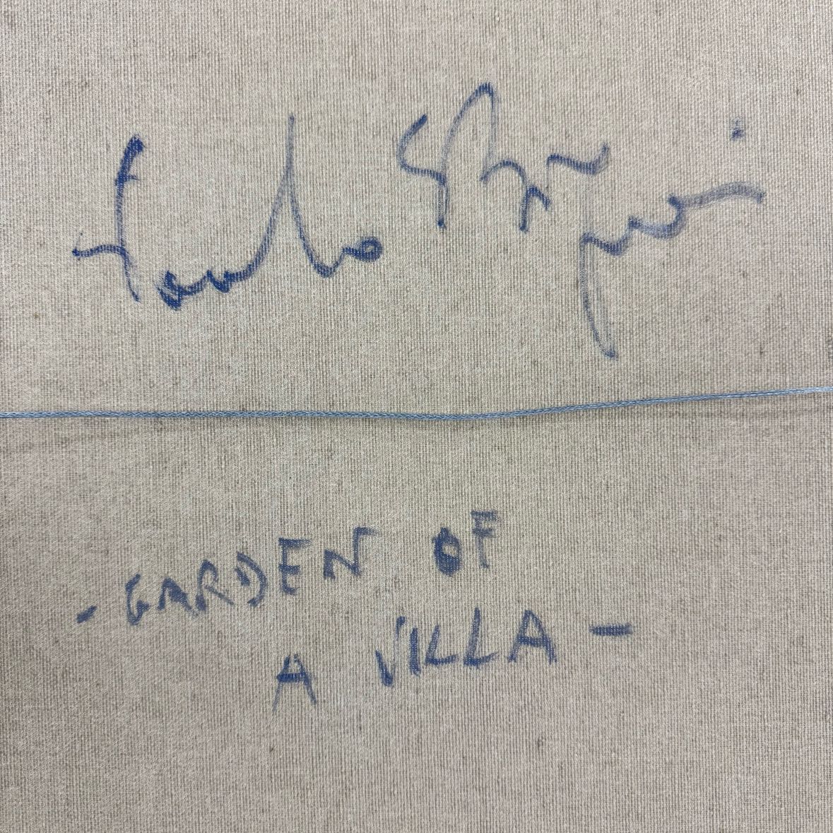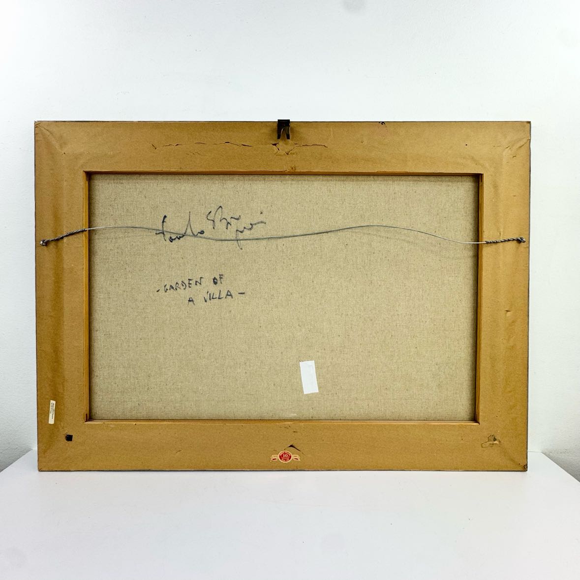 Framed "Garden of a Villa" landscape with bench and agave by artist Paolo Bigazzi. Has some imperfections on the velvet, and there is a 2" tear on the canvas that has been repaired and painted to match. See photos. Ready to hang with wire.