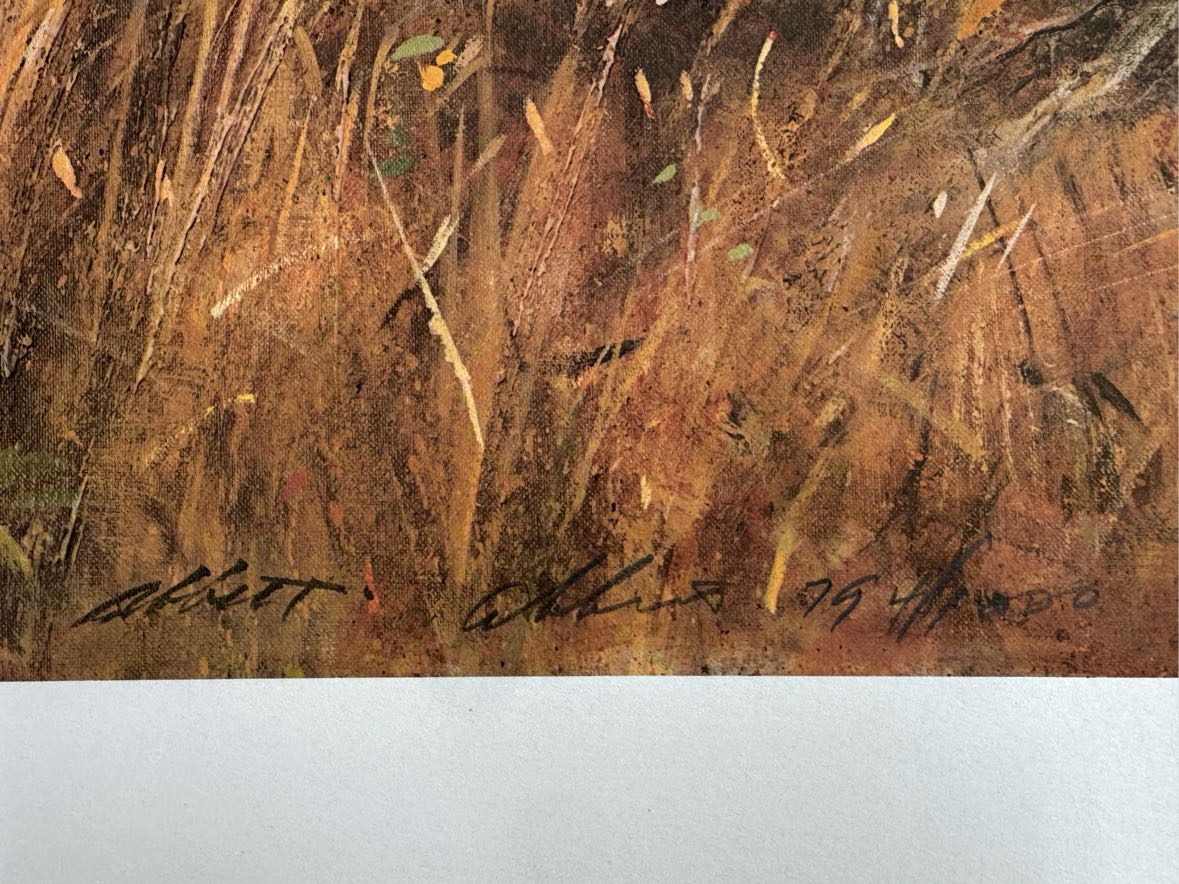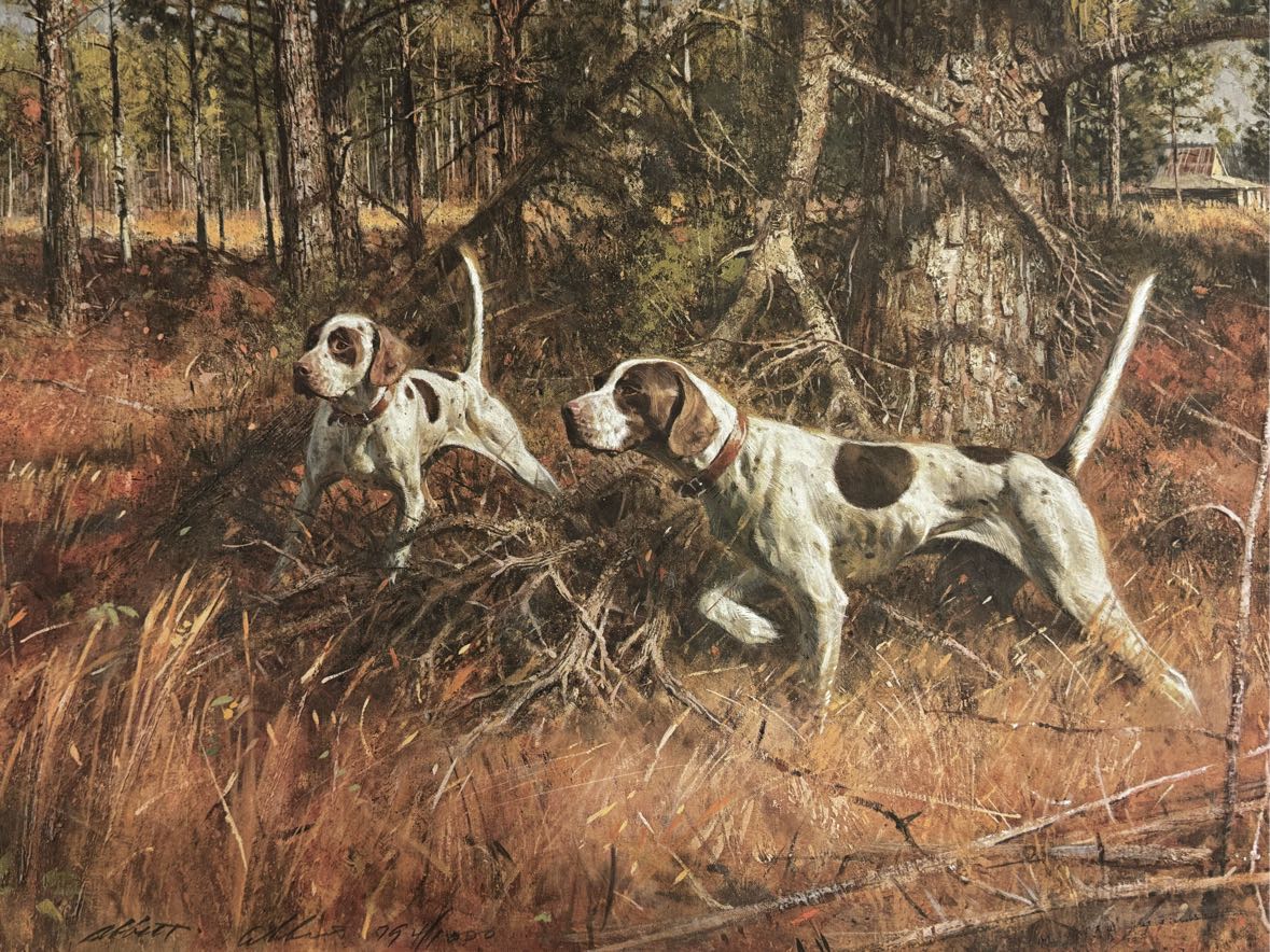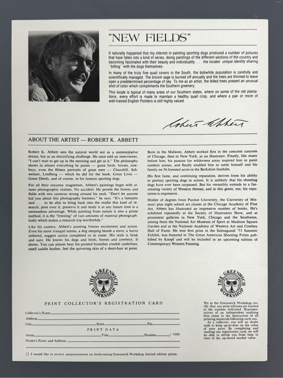 New Fields hunting dogs limited edition signed & numbered print by artist Robert K. Abbett. 794/1000 Printed in 1976 by The Greenwich Workshop in original folio with Certificate of Authenticity. Artwork size: 25"x 17.25" | The sale of this item benefits Fix West Texas in Midland, Texas.