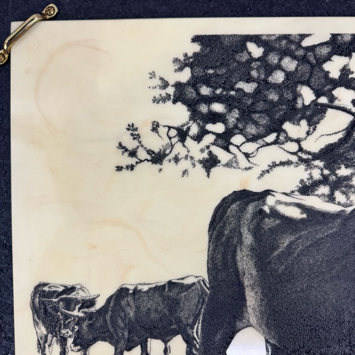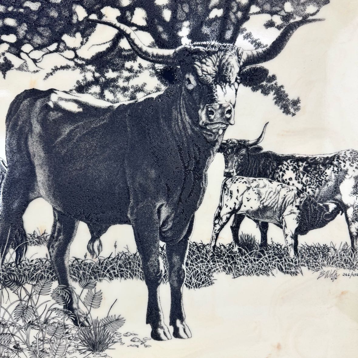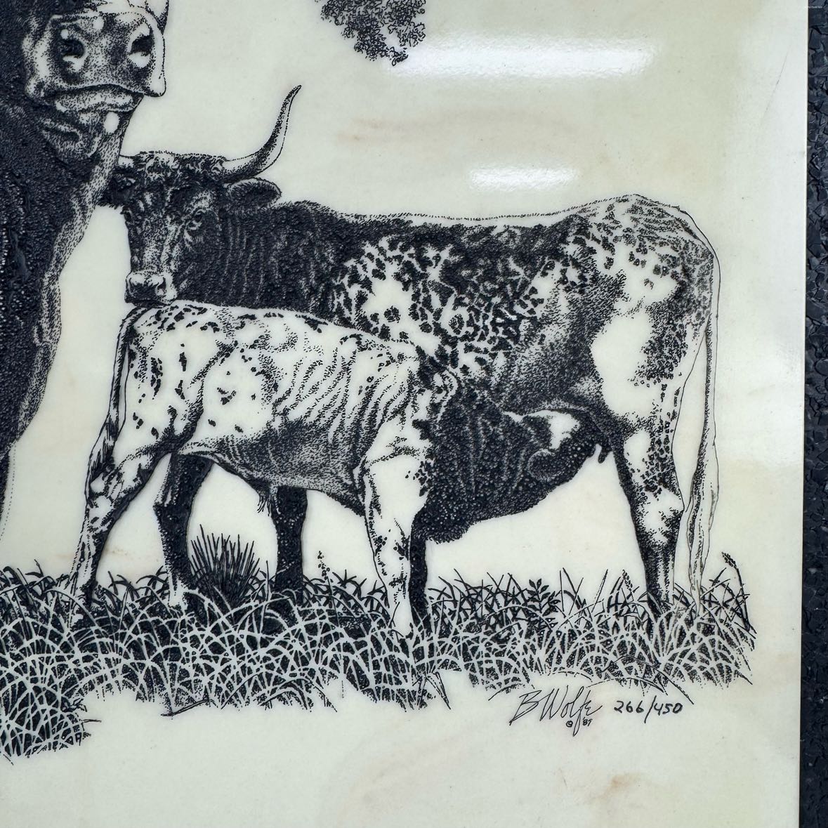 Longhorns and Cactus | professionally framed Native American portrait etched in black onto ivory colored marble by Texas-based artist Perry Bassel Wolfe (1932-2020). In excellent vintage condition. Comes with a certificate of authenticity.