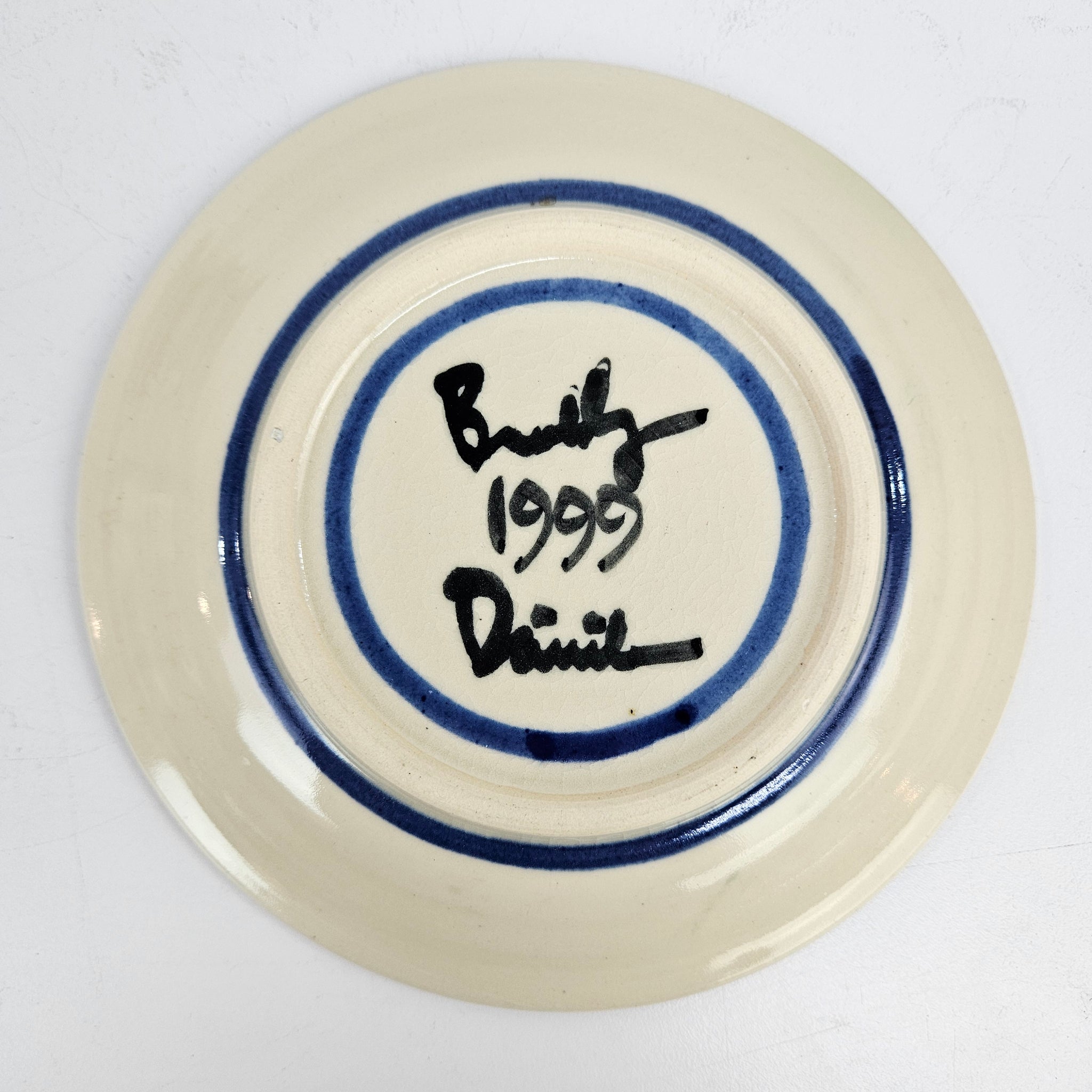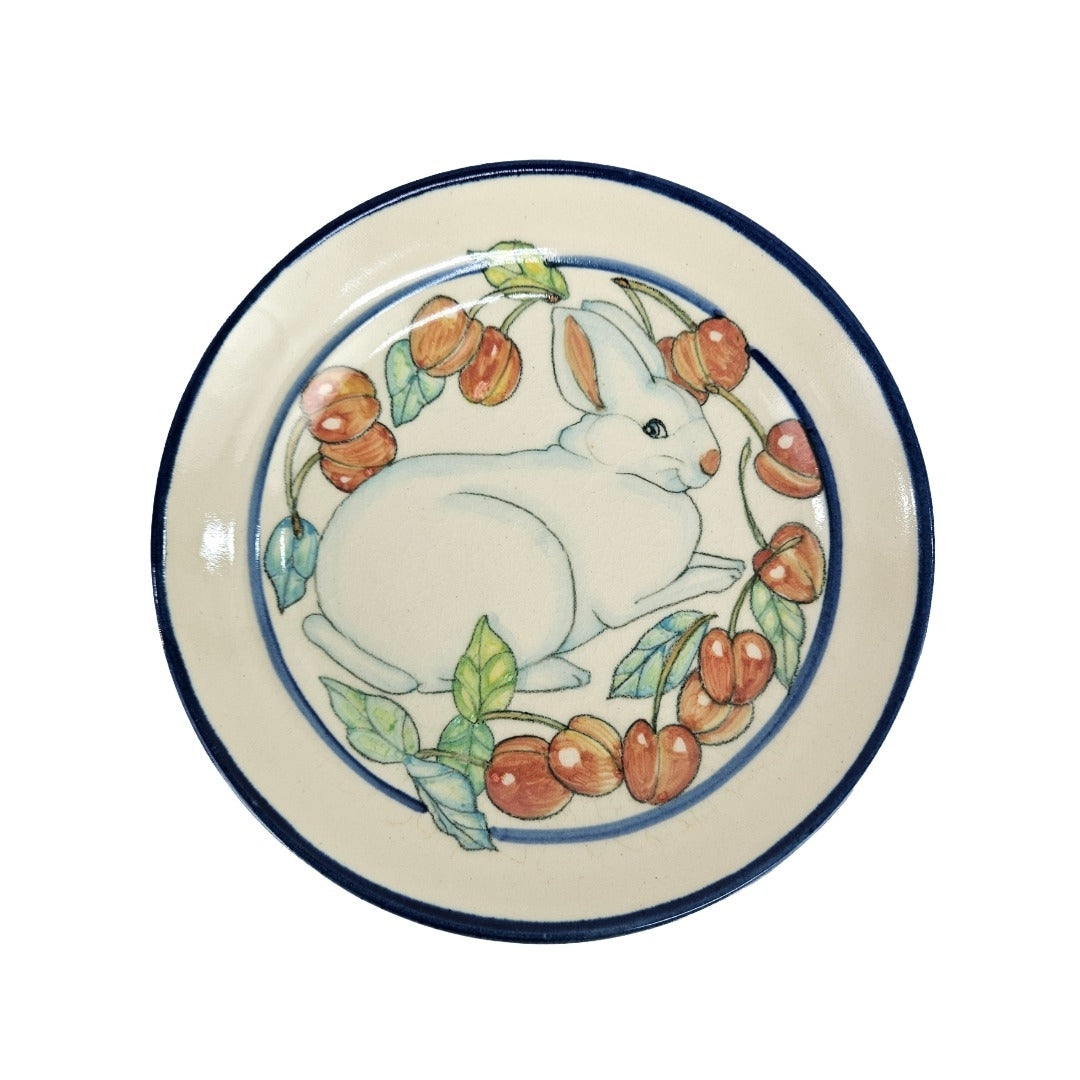 Handmade studio pottery plate with a rabbit by Santa Fe potter Bob Brodsky and painter Tina Davila. This smaller size bunny plate is perfect for a plate wall or serving, with the rabbit surrounded by fruit that look like cherries or peaches