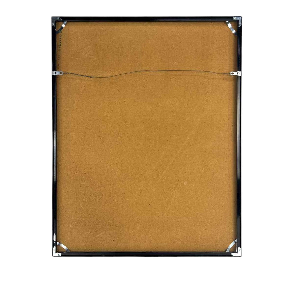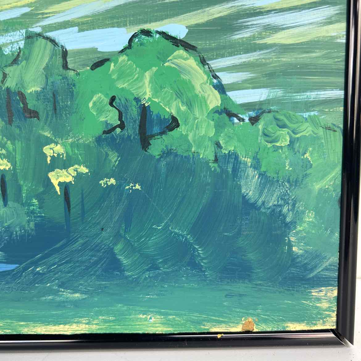 Original landscape painting on board, in the style of Van Gogh's Starry Night, framed in a modern black metal frame. Features a house on a river bank with flowers, plants and hills in the background. Ready to hang with a wire. Contact for shipping.