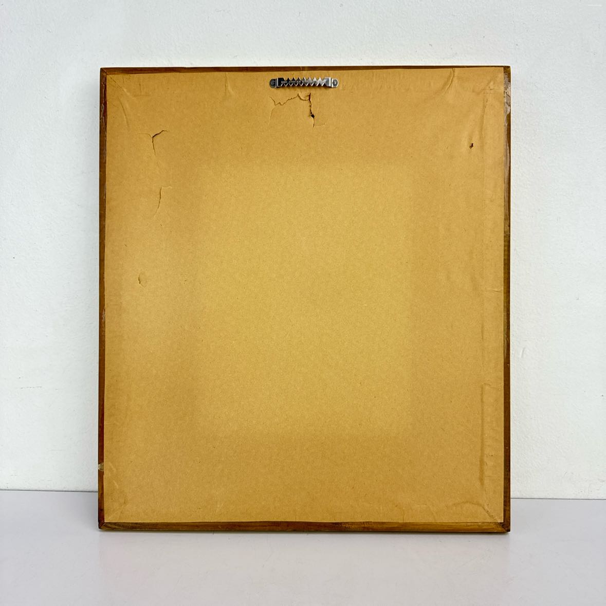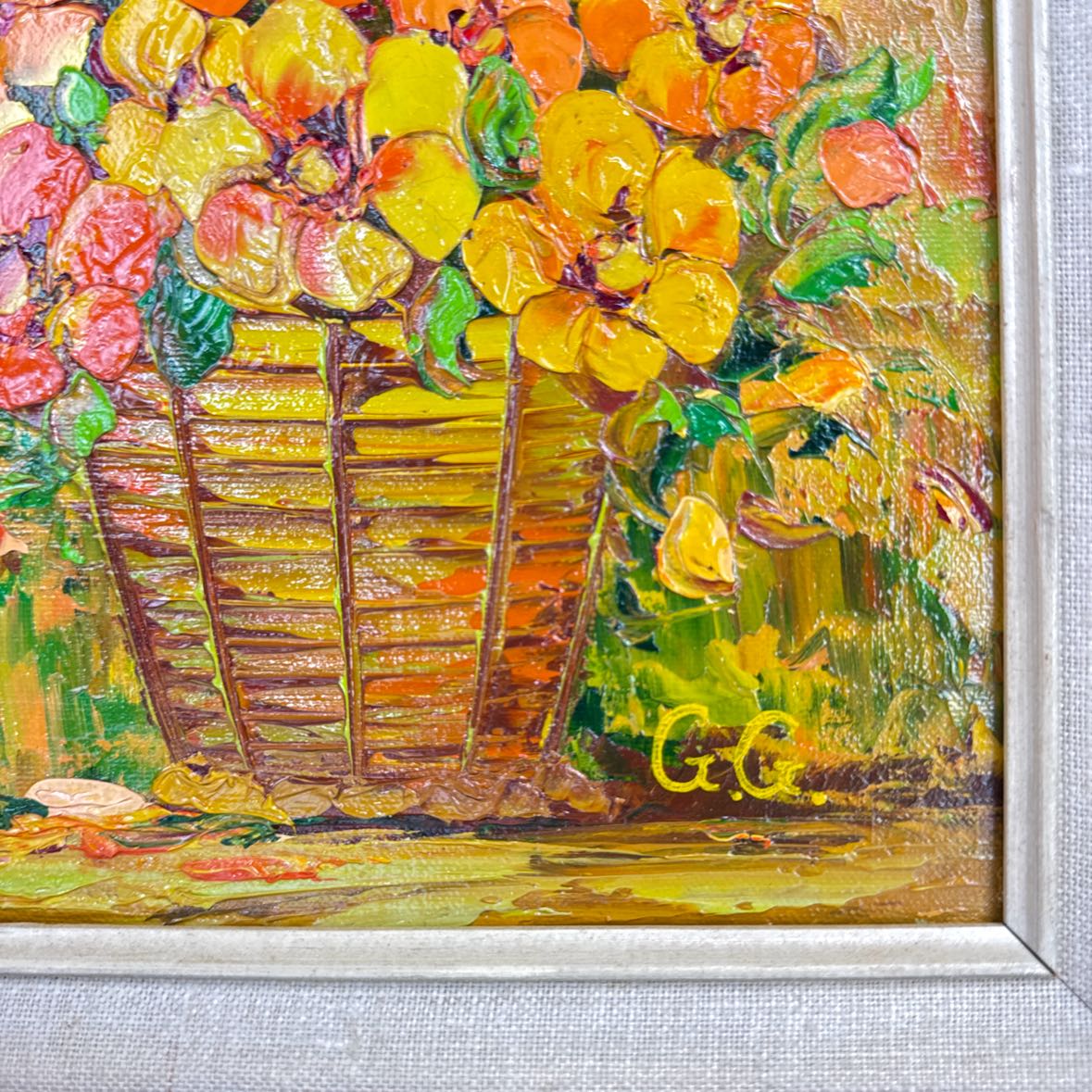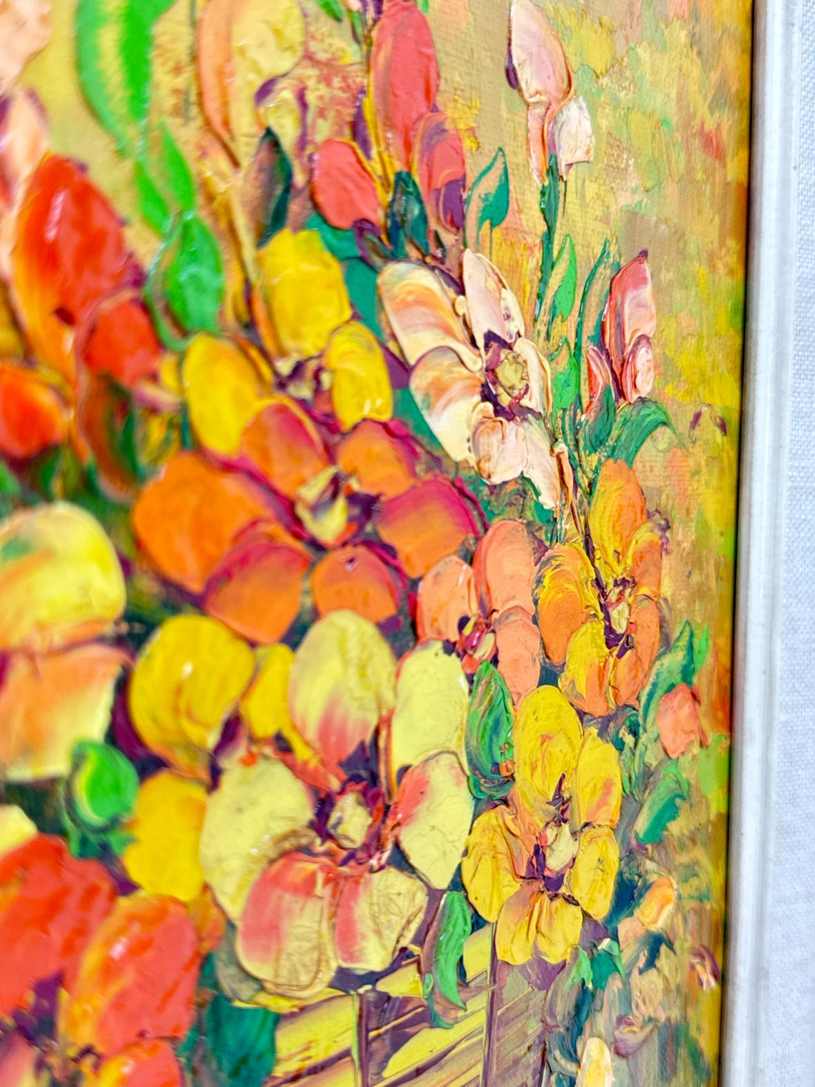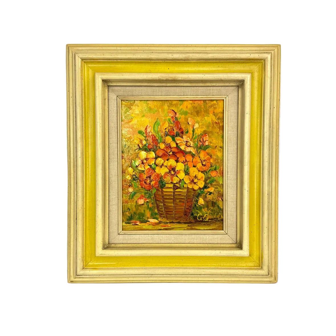 Adorable 1970s textural still life floral painting of yellow, orange and green flowers in a basket. The antiqued ivory and yellow wooden frame has a sawtooth hanger on the back. In excellent vintage condition with a couple of holes in the backing paper.