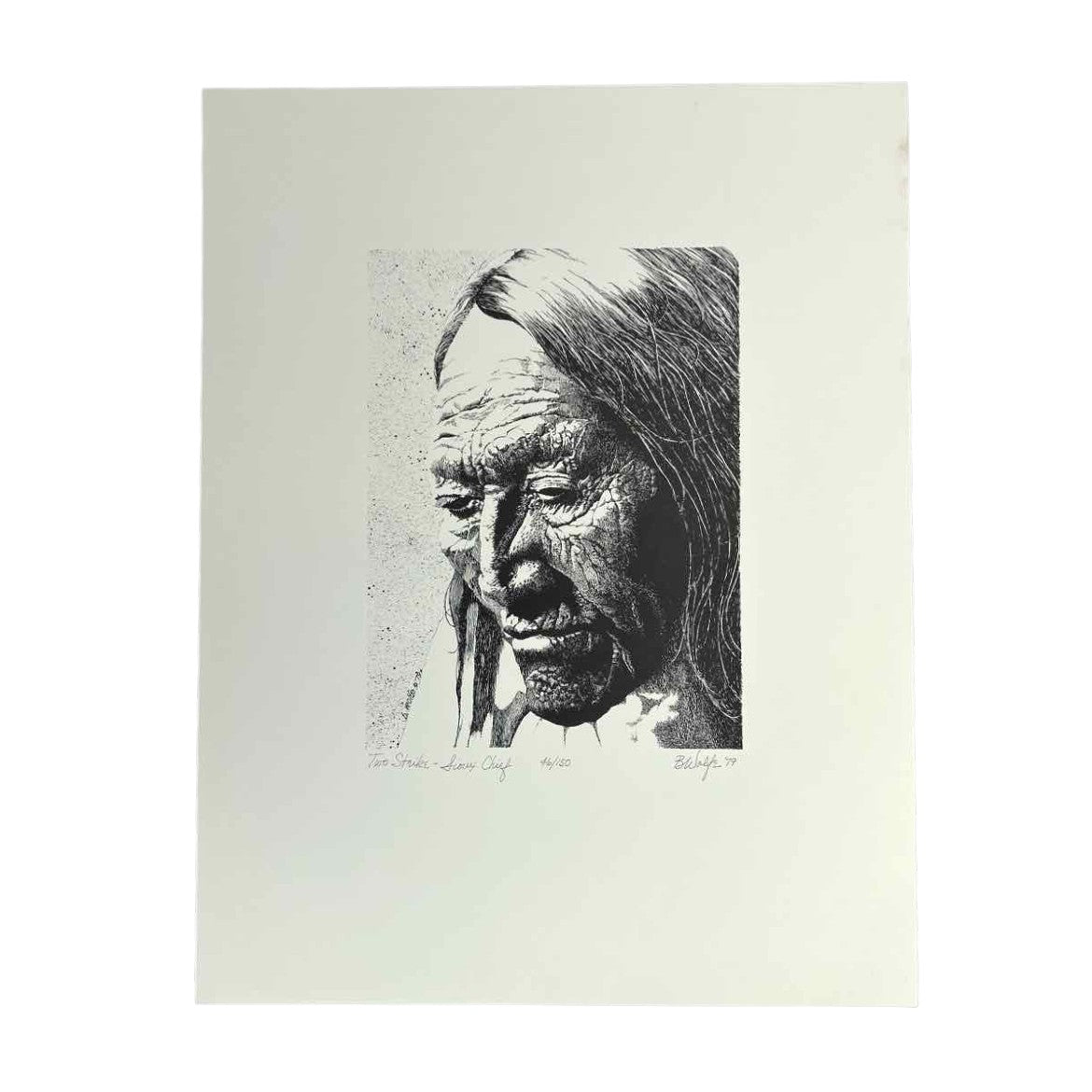 Two Strike - Sioux Chief | limited edition signed & numbered Native American portrait by Texas-based artist Perry Bassel Wolfe (1932-2020). In excellent vintage condition. Art measures 9x12. Contact for shipping - will ship in a tube.