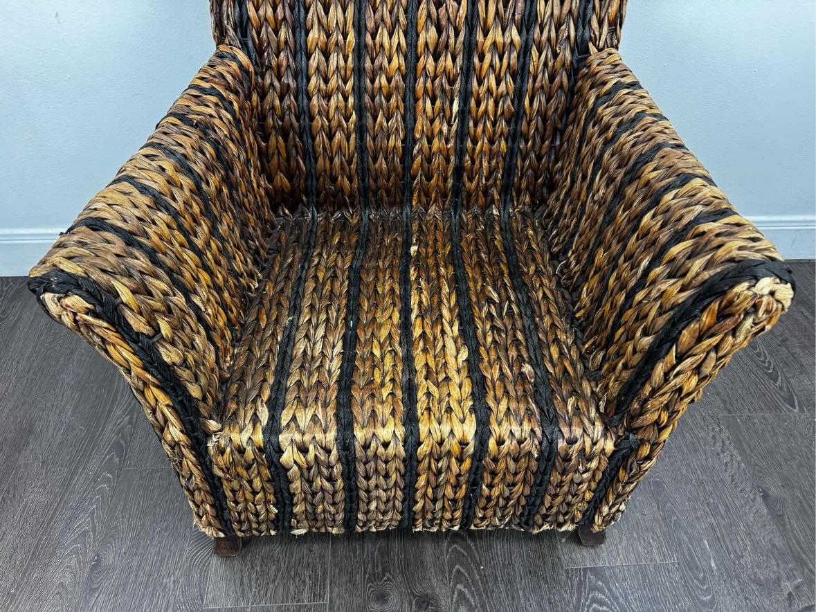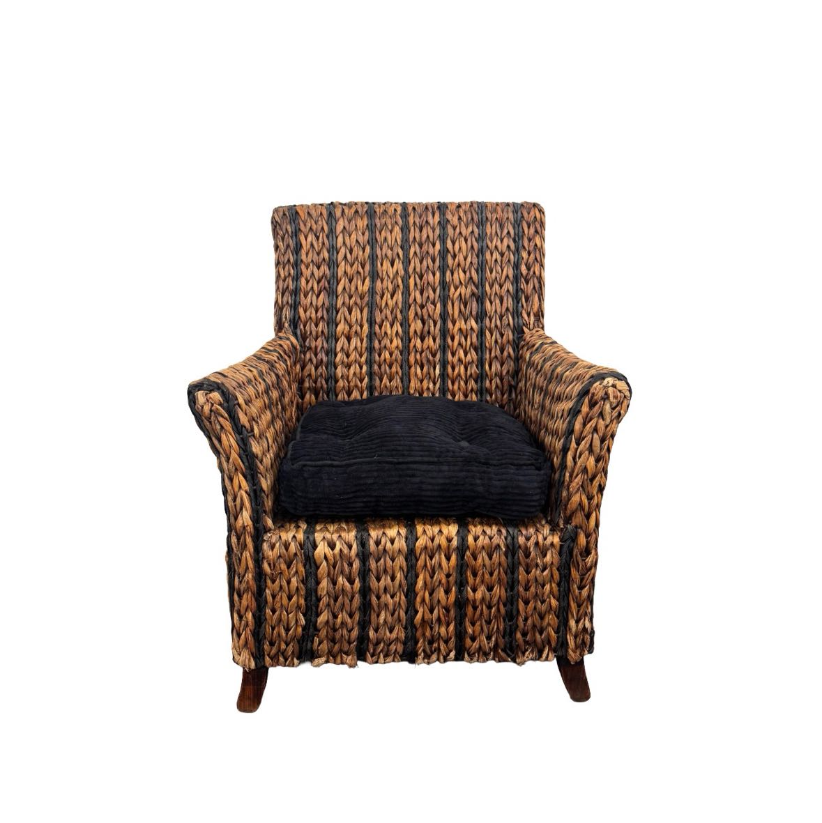 Sturdy woven seagrass chair with two tone stripes and wooden legs. It has a black tufted corduroy cushion. In good vintage condition with some light surface wear. See photos.
