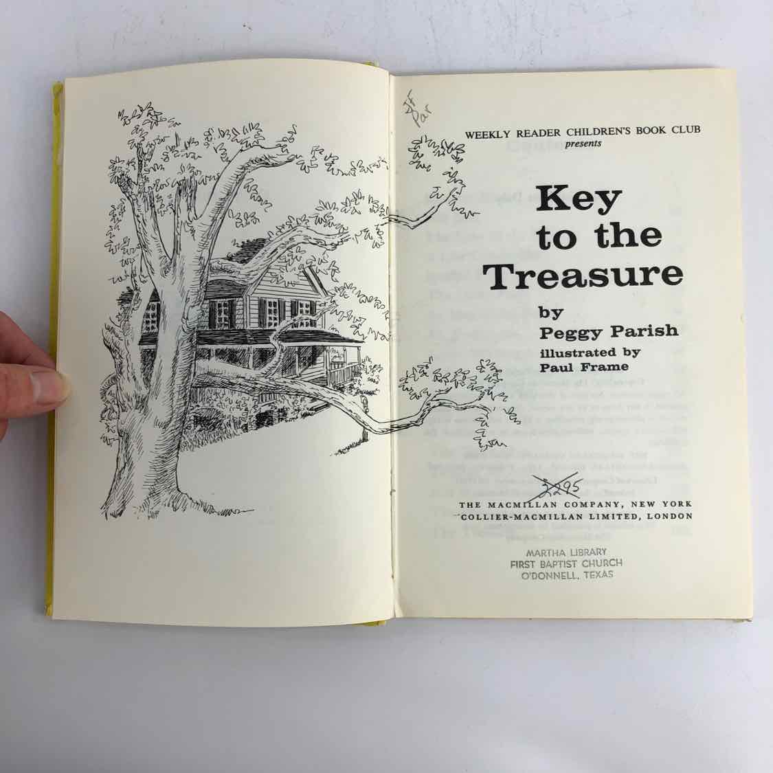 Hardback 1966 copy of Key to the Treasure, a large print children's novel with illustrated cover and illustrations throughout. In good vintage condition with cover wear, stamps from being in a church library, but still readable and nice looking.