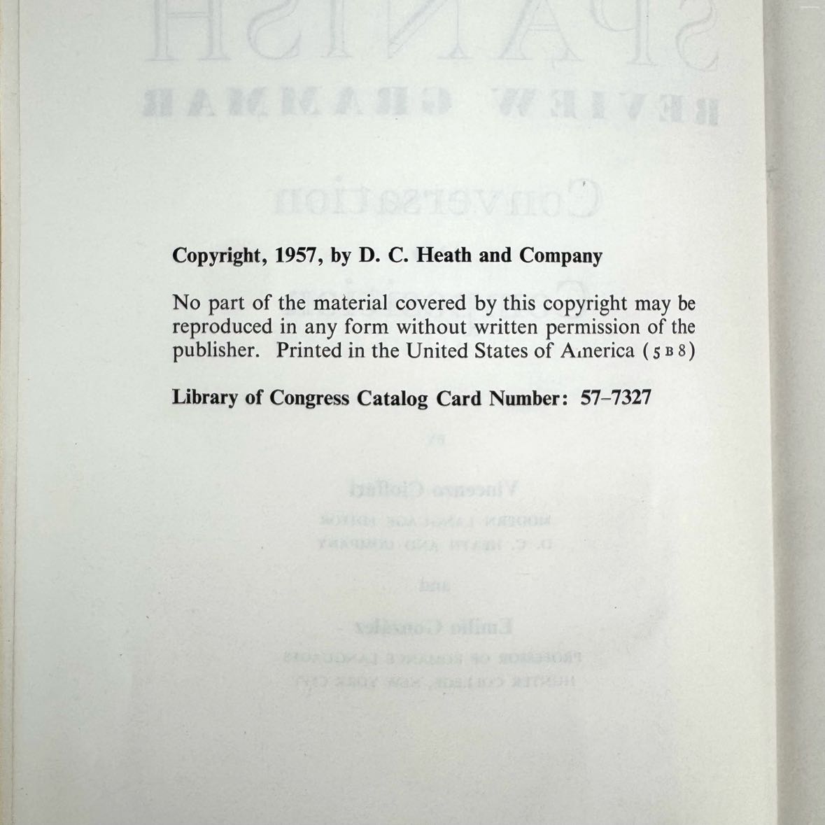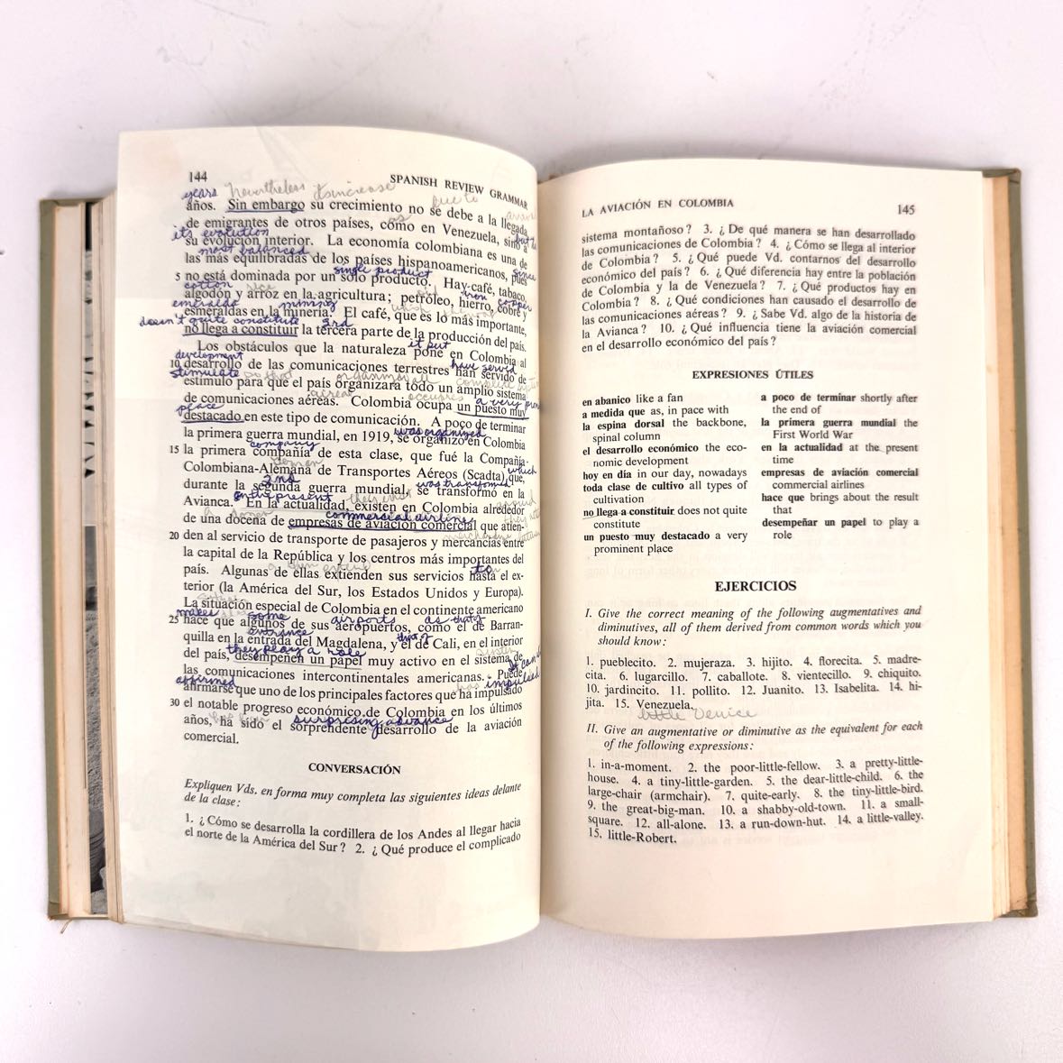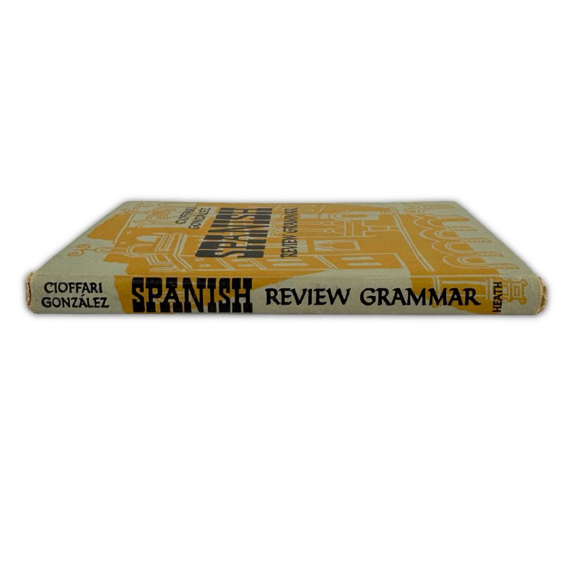 Spanish Review Grammar book by Cioffari Gonzalez, printed in 1957 with an illustrated cover. In fairly good vintage condition with some cover wear and pencil notations throughout.