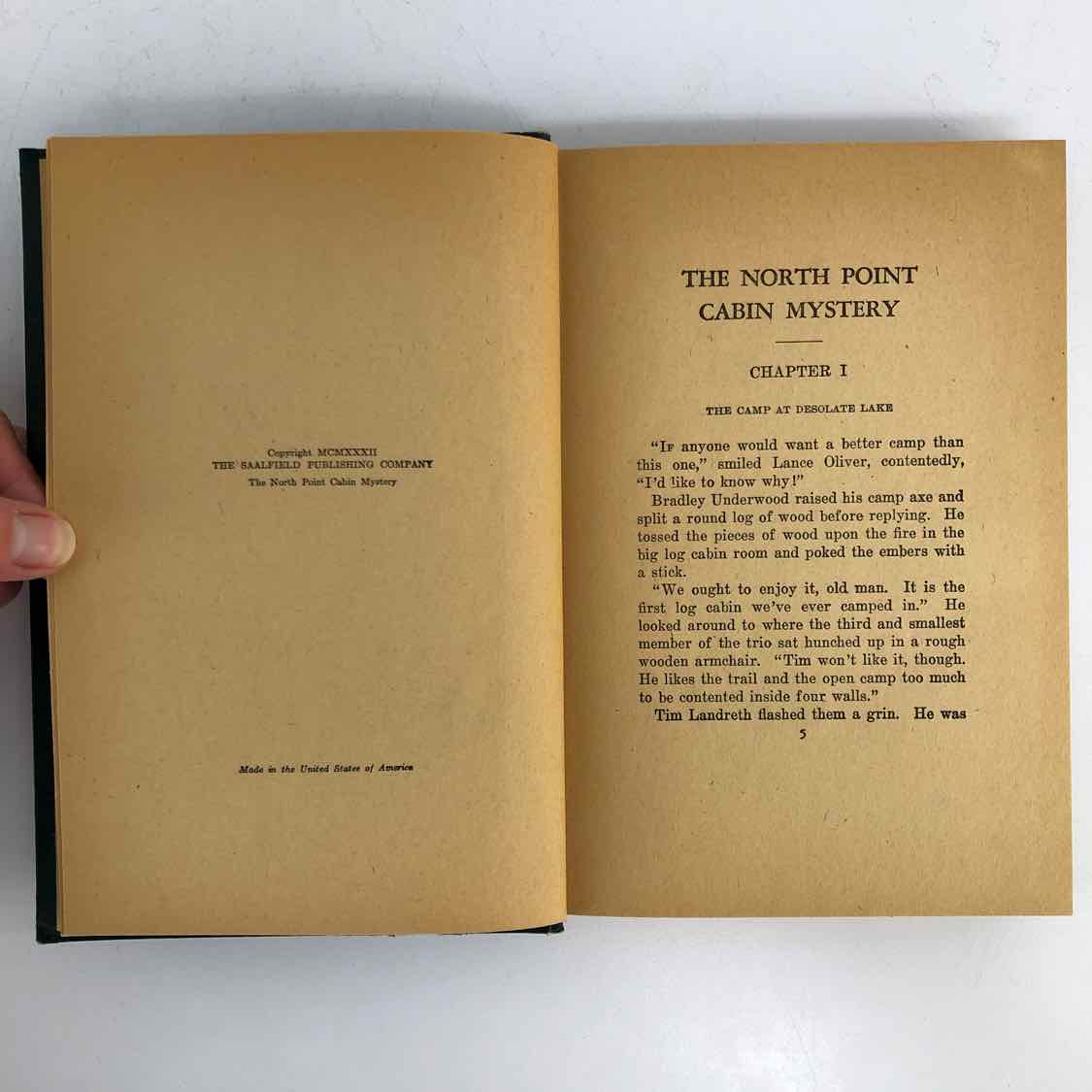 Hardback 1932 copy of The North Point Cabin Mystery by Capwell Wyckoff, in good vintage condition for its age with some light cover wear, no jacket, and pages that have become yellowed and somewhat brittle, though still readable.