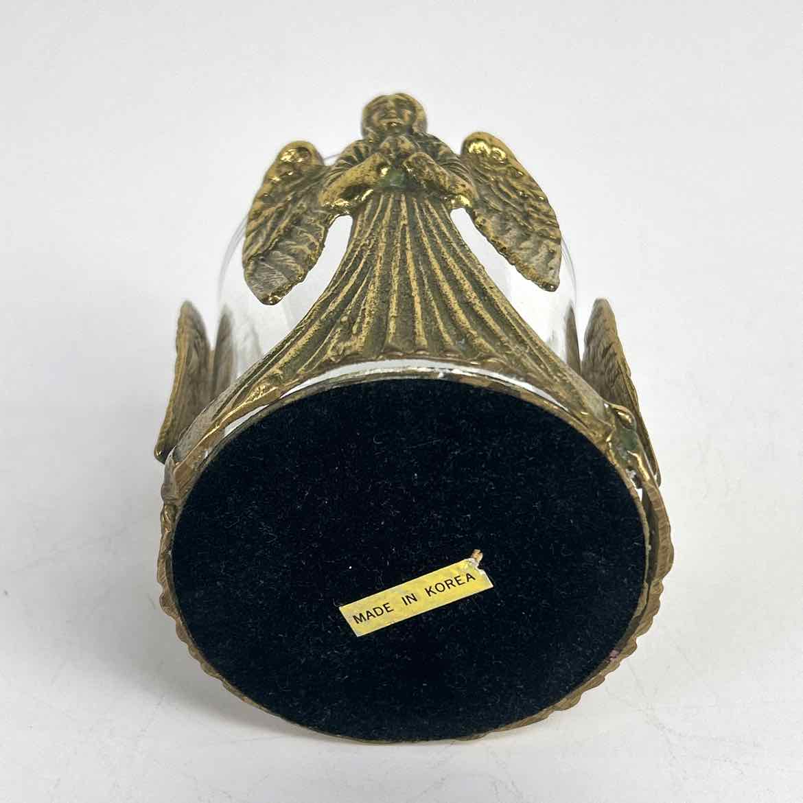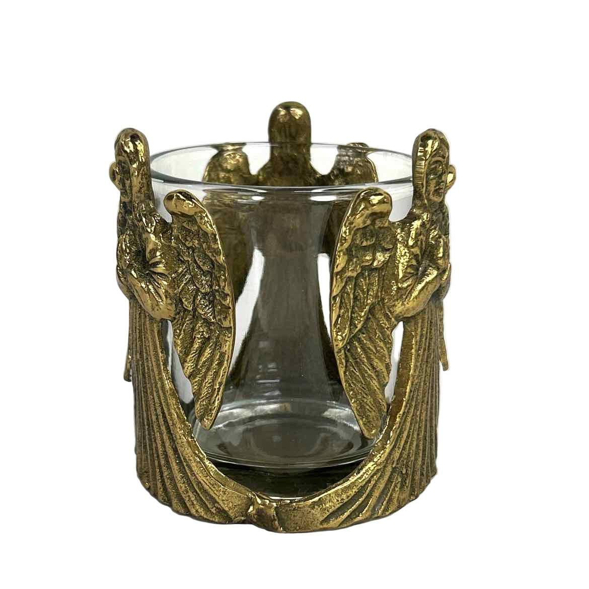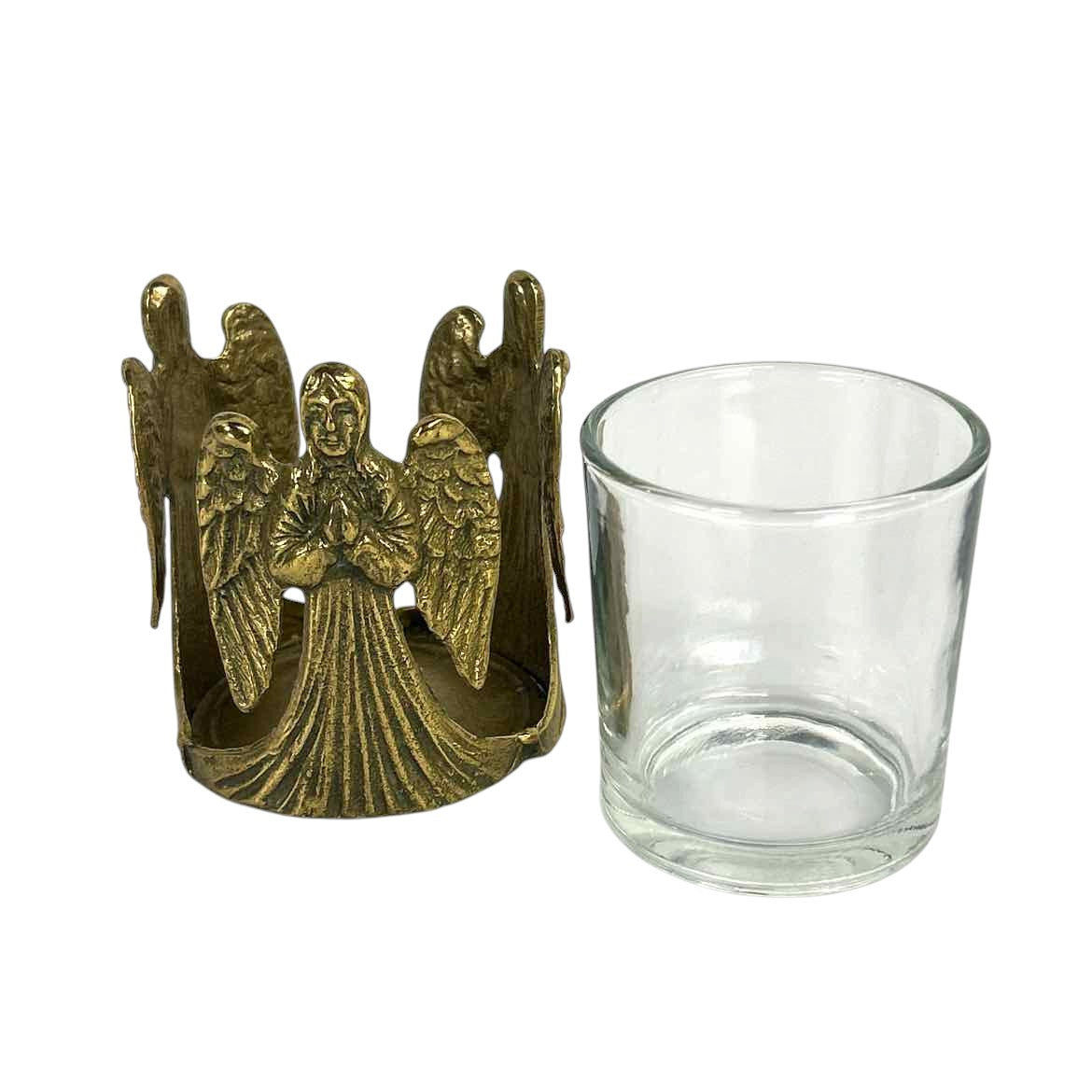 High quality brass angels candleholder with a glass votive cup. It would also look great for holding pens. In very good vintage condition.
