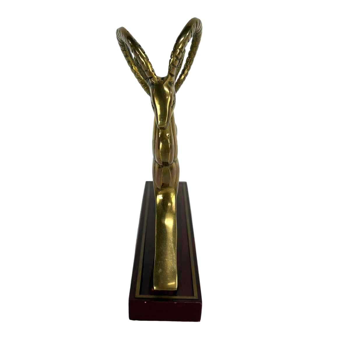 Modern brass antelope on a dark mahogany stain wooden base, in very good vintage condition with original brass patina. Made in Korea c. 1980s for San Pacific San Francisco.