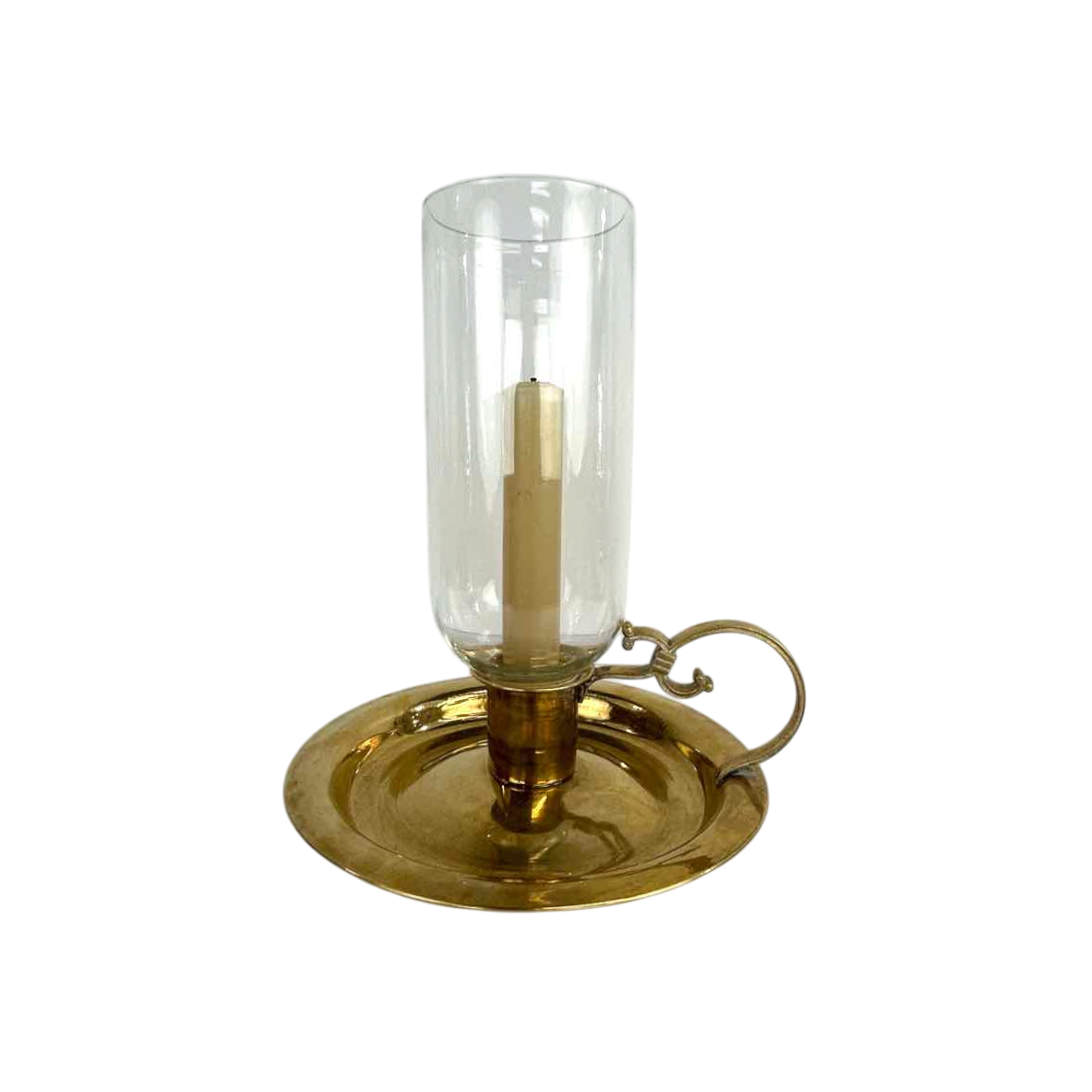 High quality solid brass candleholder with handle and a large glass hurricane shade, in excellent vintage condition. A timeless classic for a high end look.
