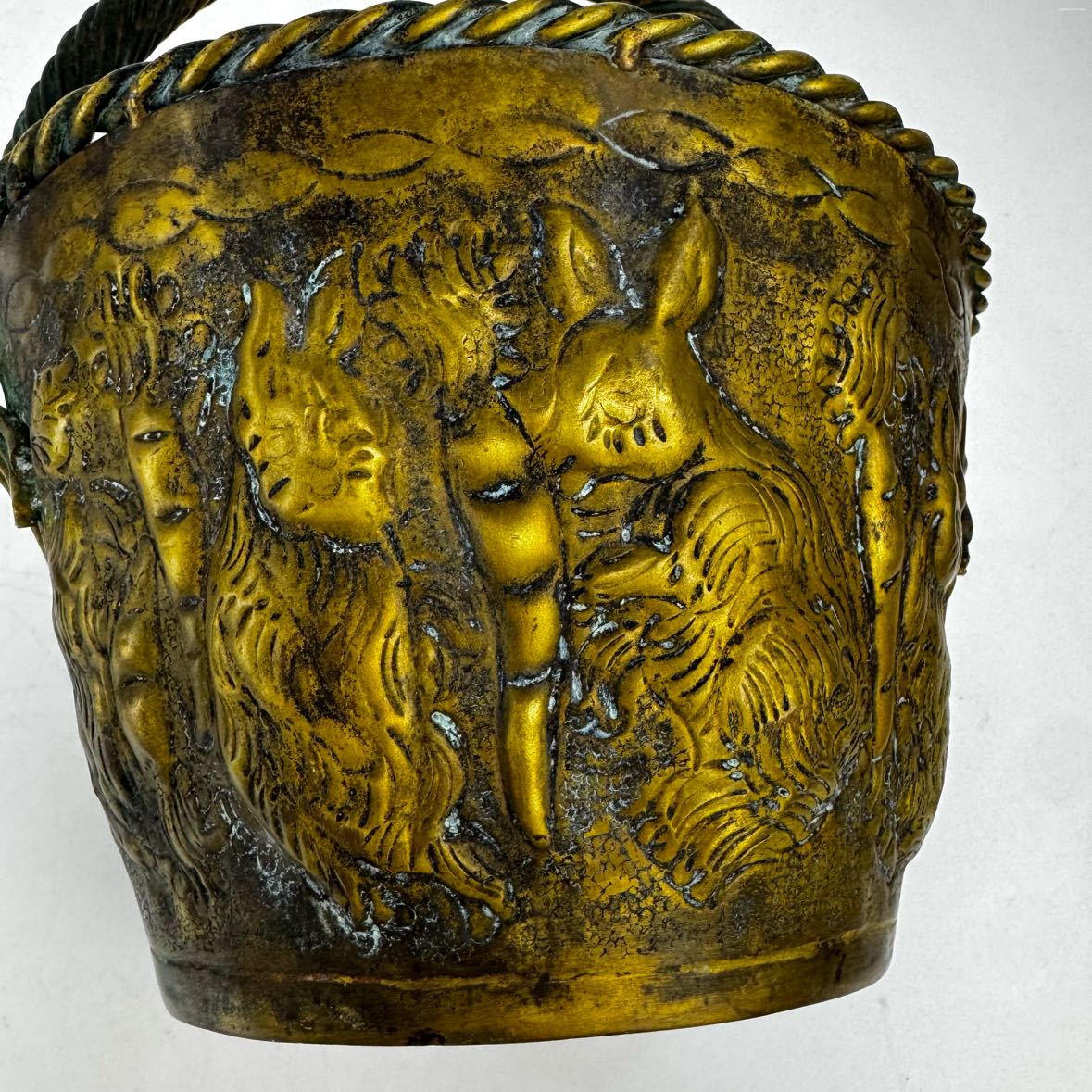 Heavy and nicely detailed brass Easter basket with rabbits and carrots embossed on the sides and a braided brass wire handle. In very good vintage condition with lots of nice patina and verigris on the inside as shown.