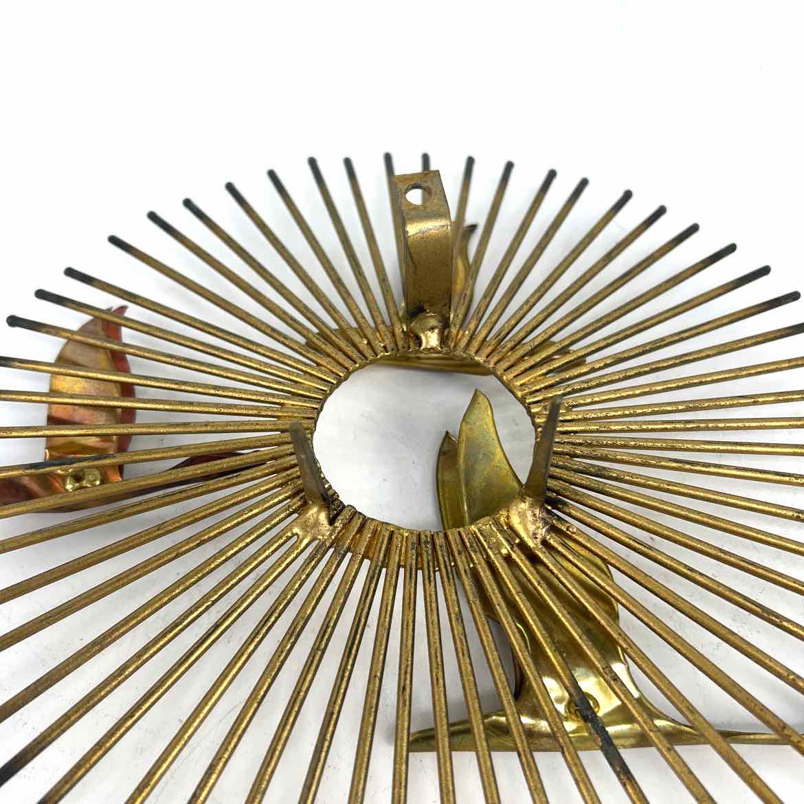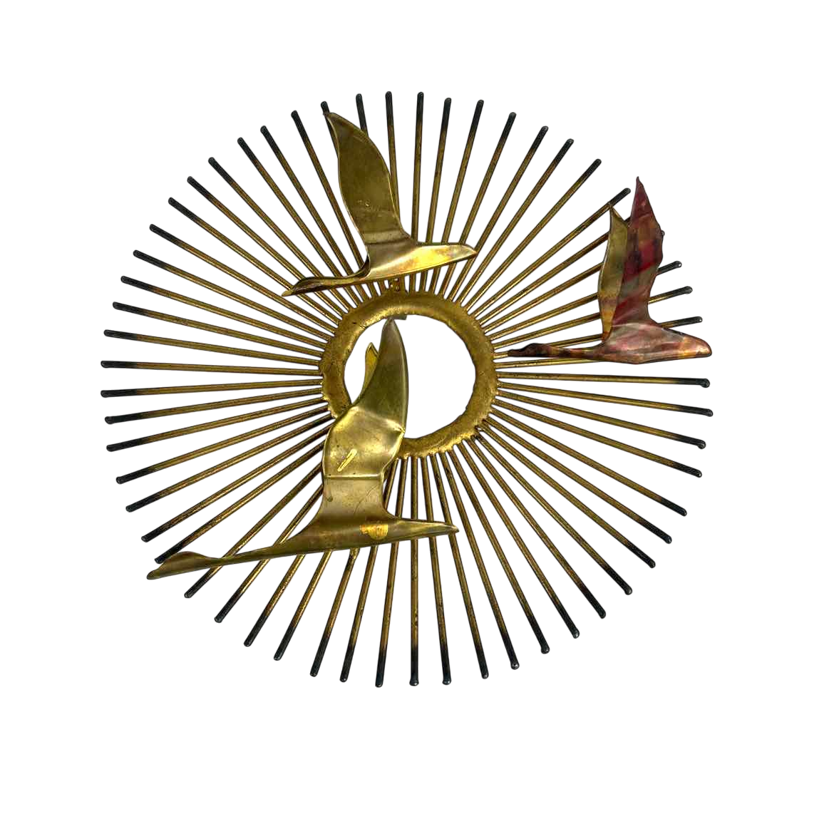 Mid-century modern mini C. Jere Sunburst Birds wall sculpture in fairly good vintage condition with some patina as shown. This mixed metals piece is perfect for someone who wants the pop of this collectible modern wall sculpture for a smaller space.