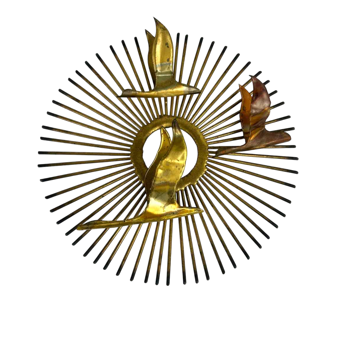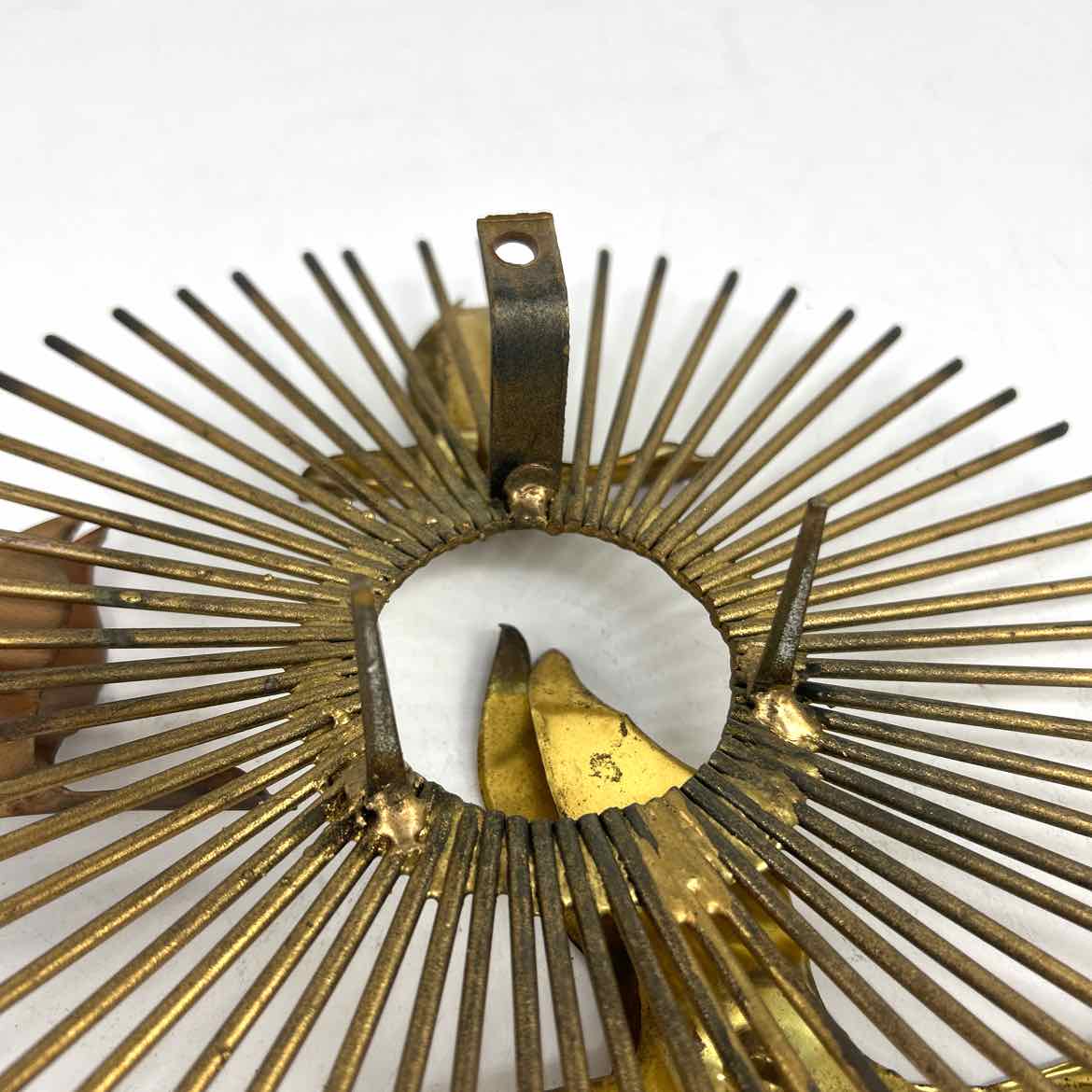 Mid-century modern mini C. Jere Sunburst Birds wall sculpture in fairly good vintage condition with some patina as shown. This mixed metals piece is perfect for someone who wants the pop of this collectible modern wall sculpture for a smaller space.