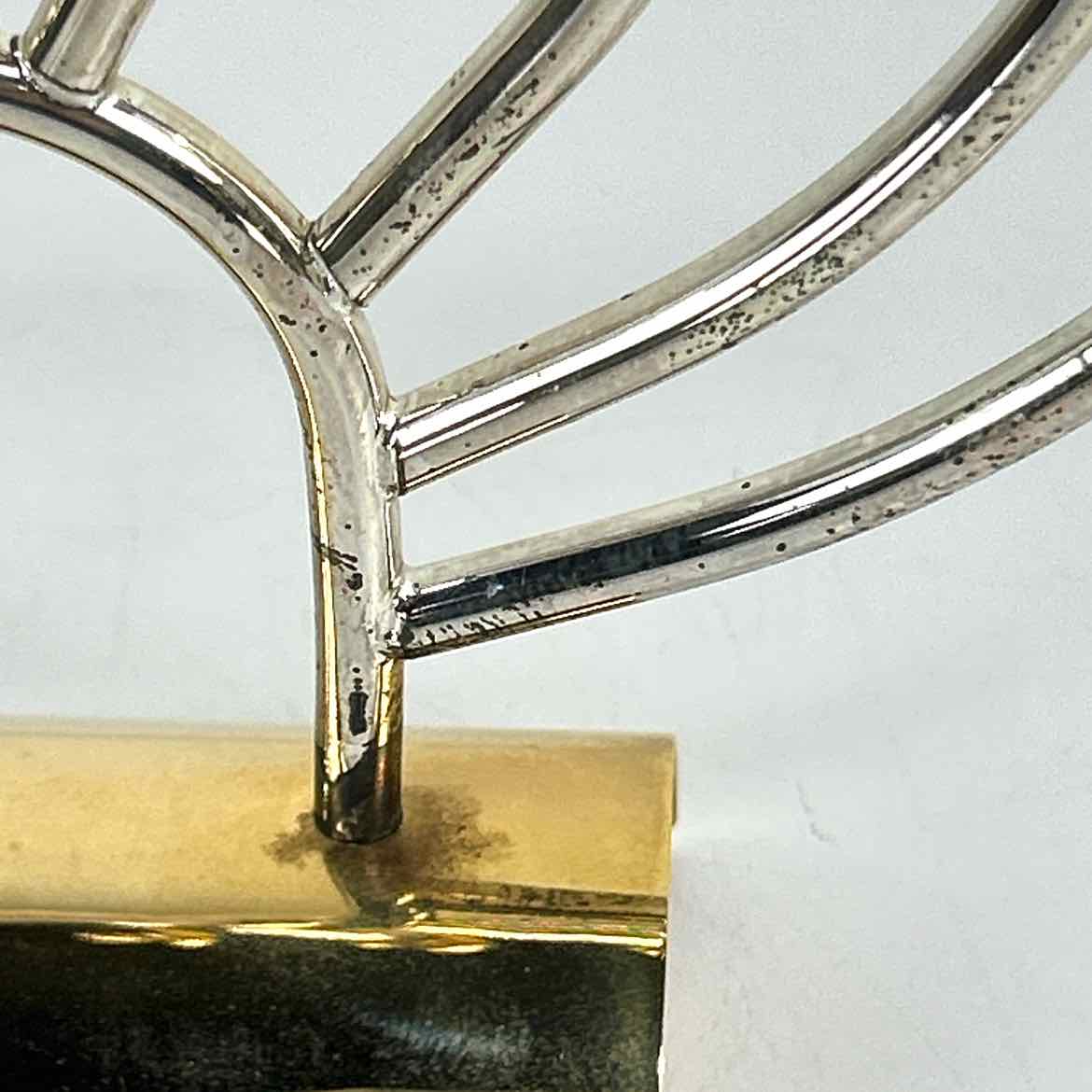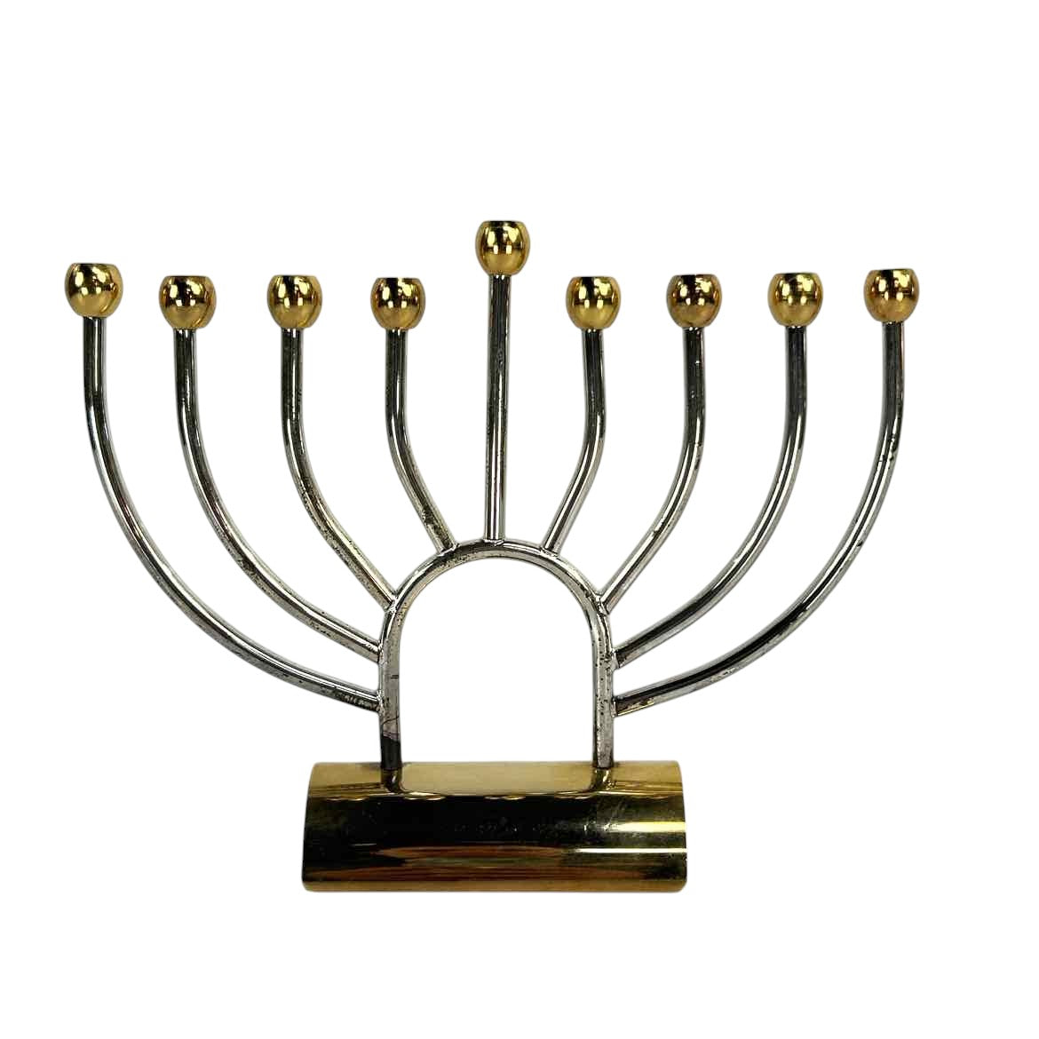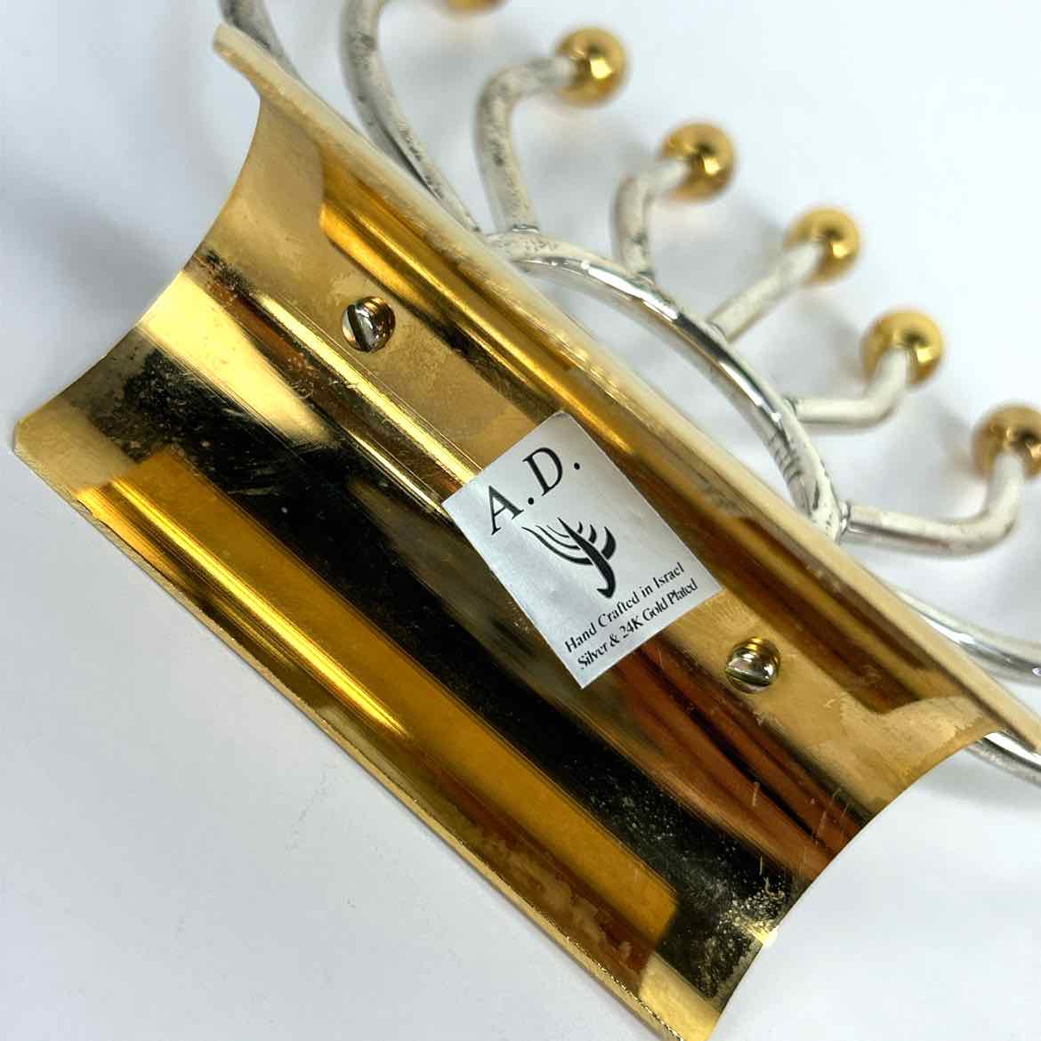 Fabulous mid-century modern menorah with a chrome and gold finish, made in Israel and in very good vintage condition with what looks like an intentional speckle patina on the chrome. Labeled silver & 24K gold plated.