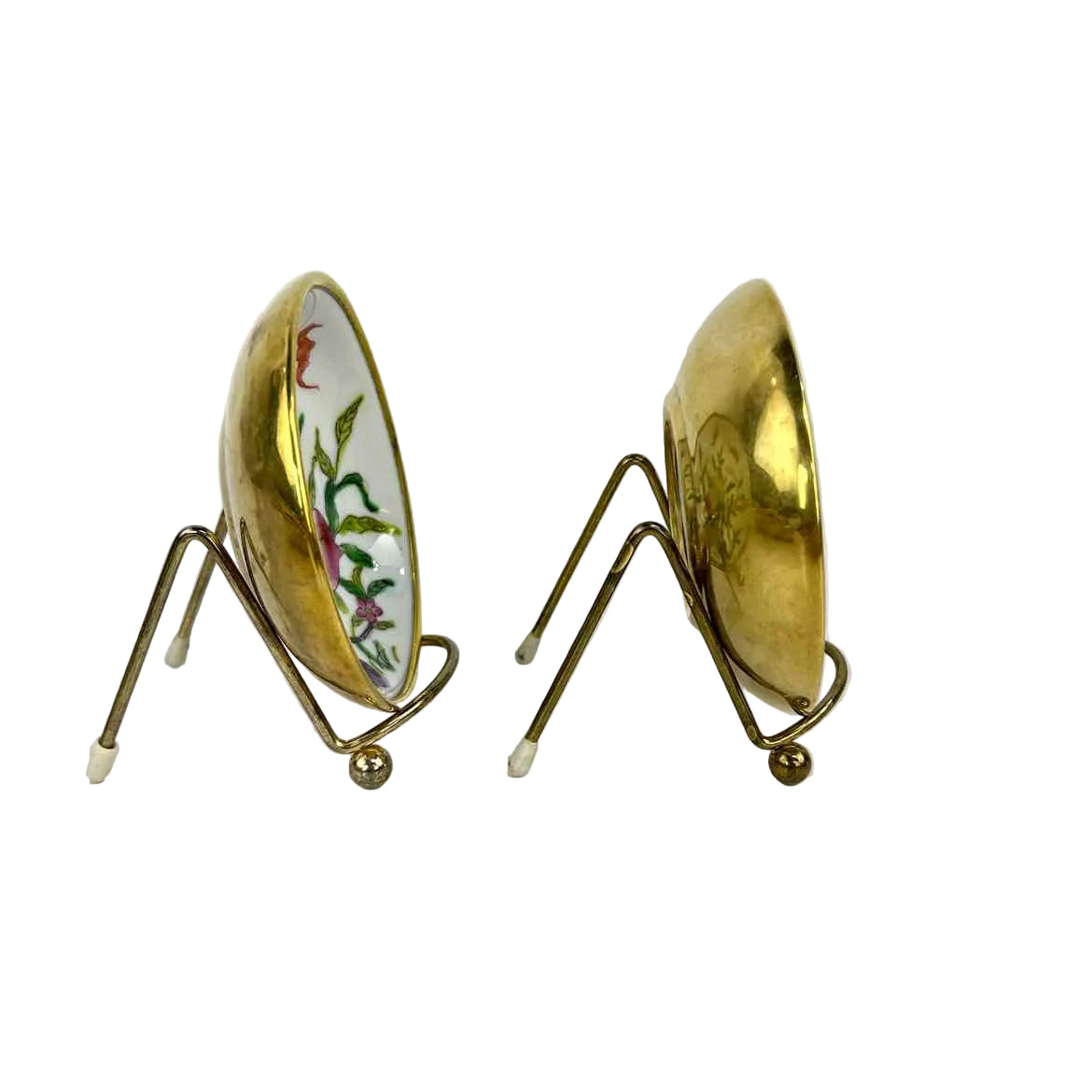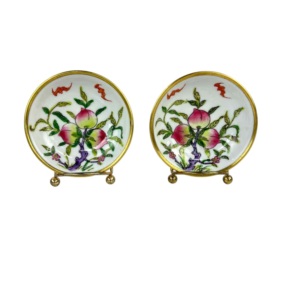 PAIR small brass clad porcelain plates with hand painted three peach designs. Small brass easels included. In very good vintage condition, see photos.