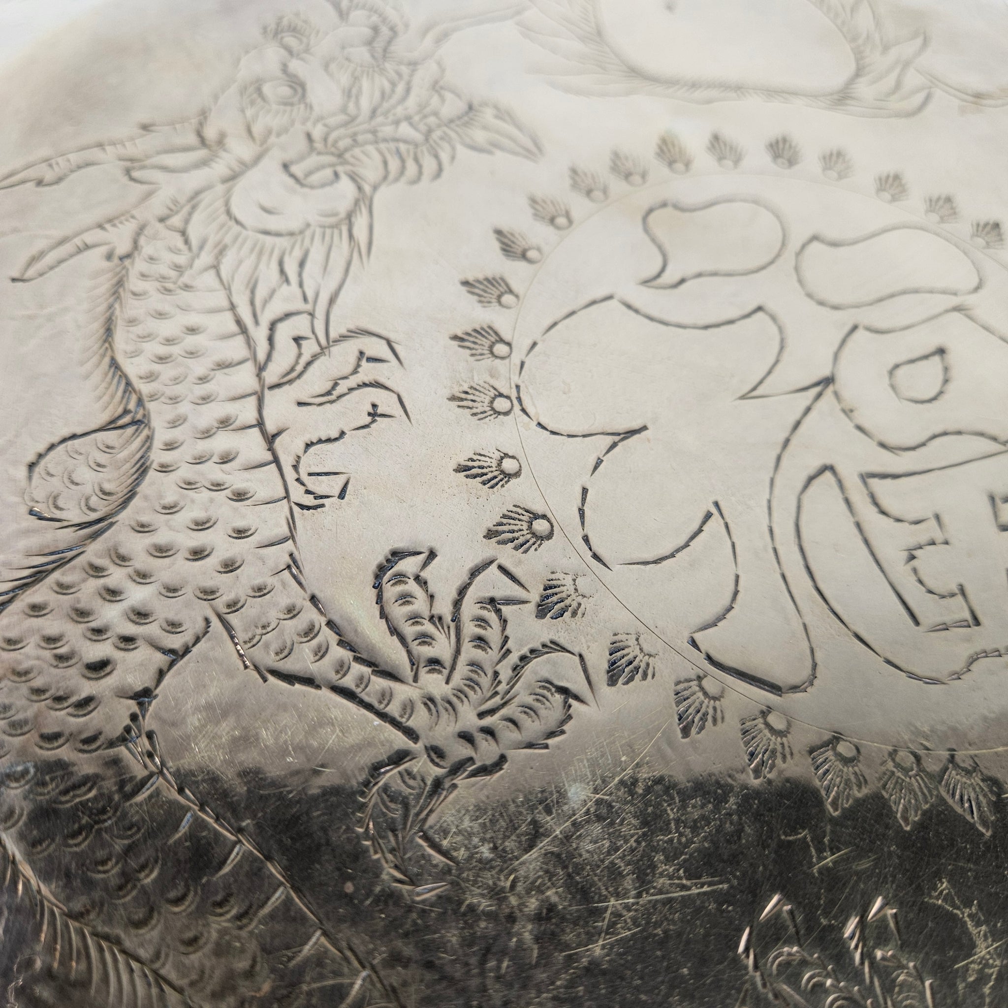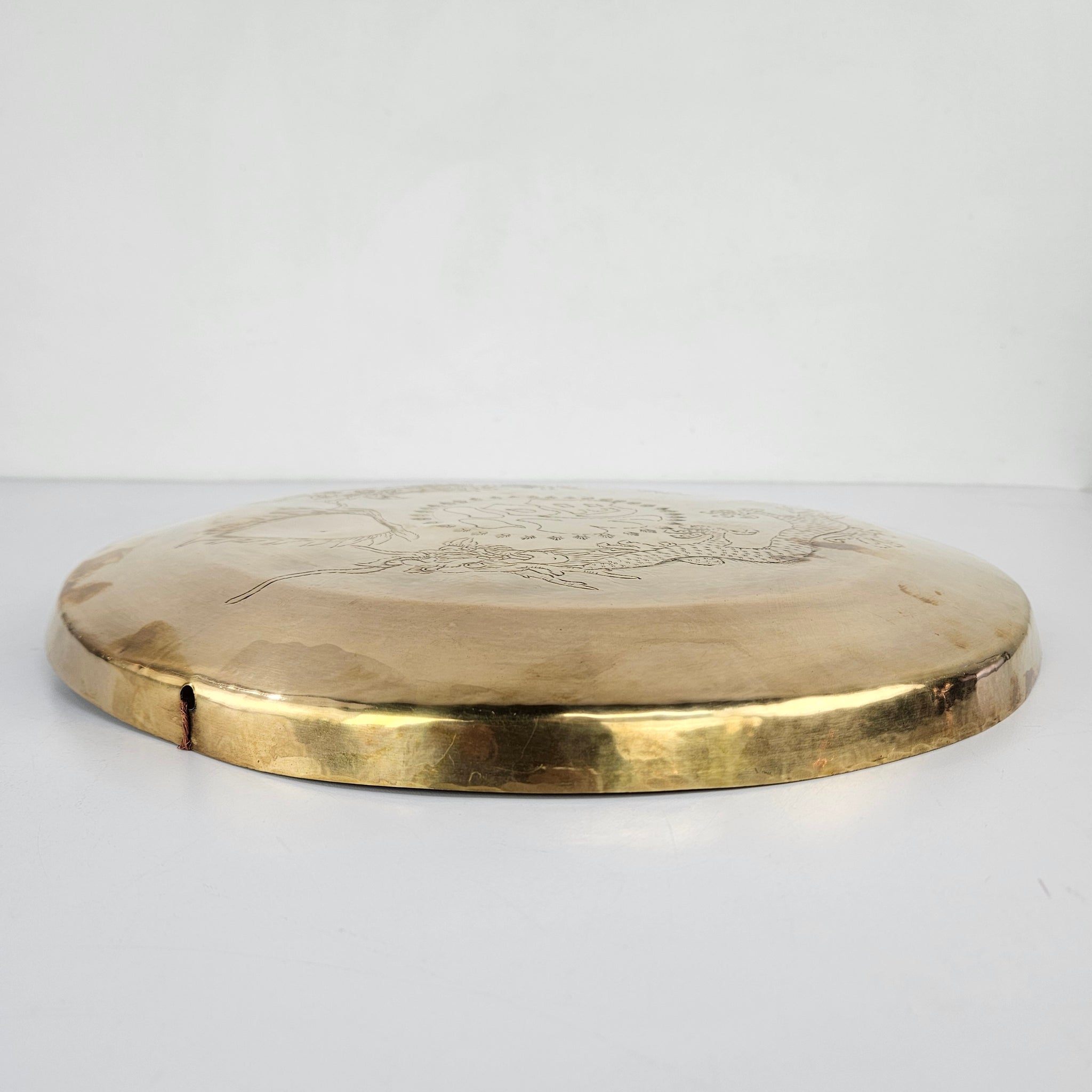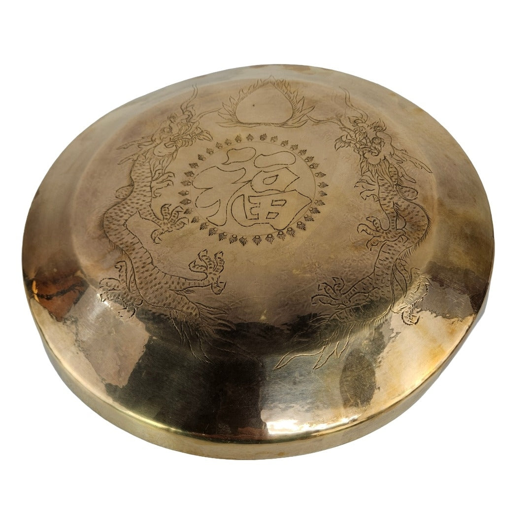 This wall hanging might be a gong, or just a wall hanging. I guess you'll have to whack it to be sure. Engraved with dragons and symbols, it is in good vintage condition with a wire for hanging and a bright gold patina.