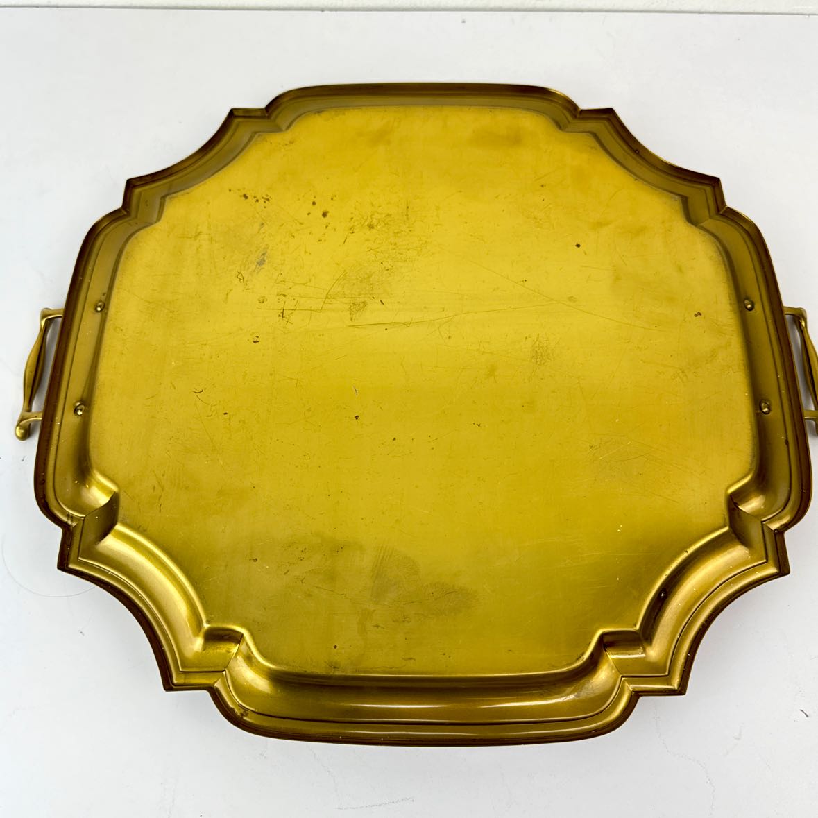 Large solid brass tray with a nice shape and sculpted handles, in very good vintage condition with original patina and some surface scratches. Perfect for serving or organizing smaller items on a surface like a coffee table.