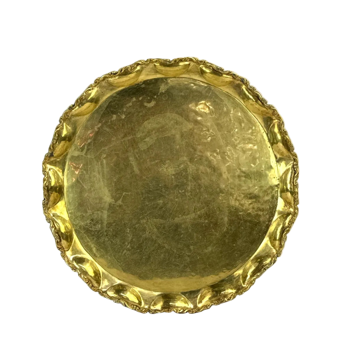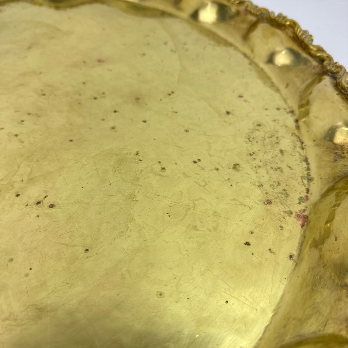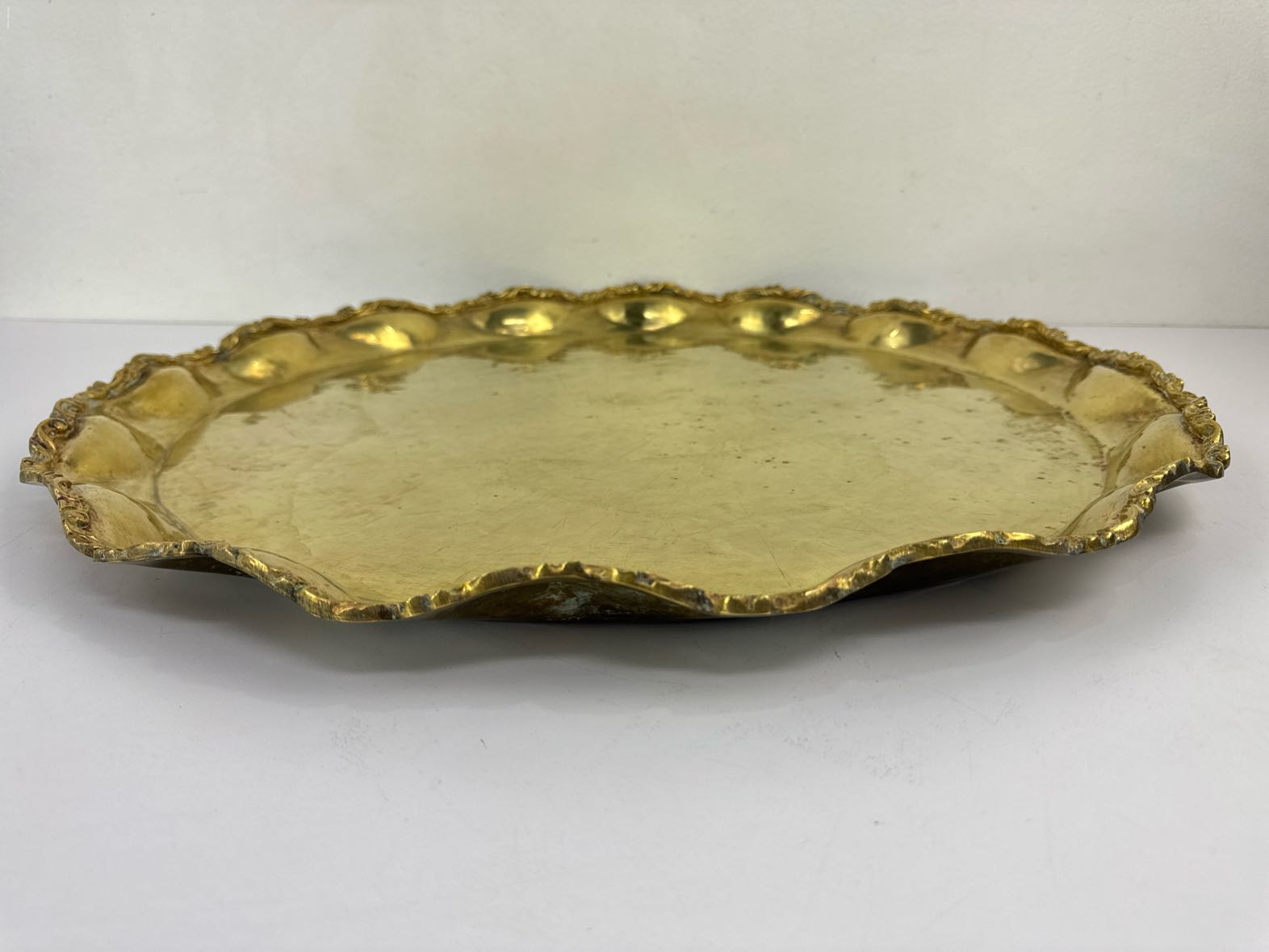 Large brass tray with an ornately detailed wavy rim, perfect for a centerpiece. In very good vintage condition with a bright finish that could be polished.