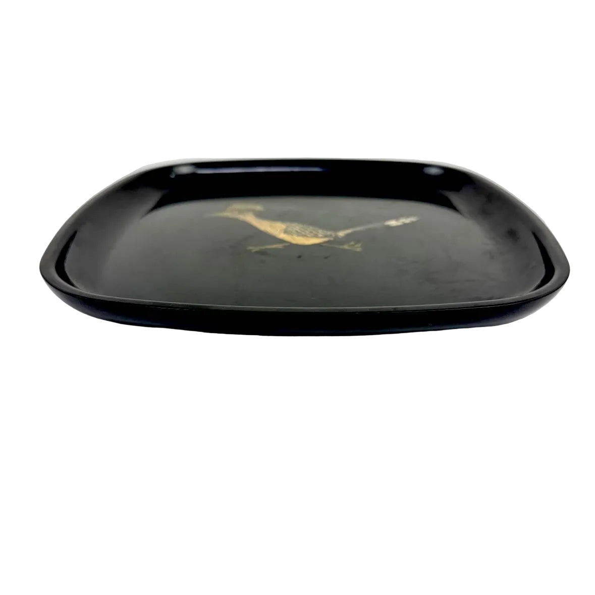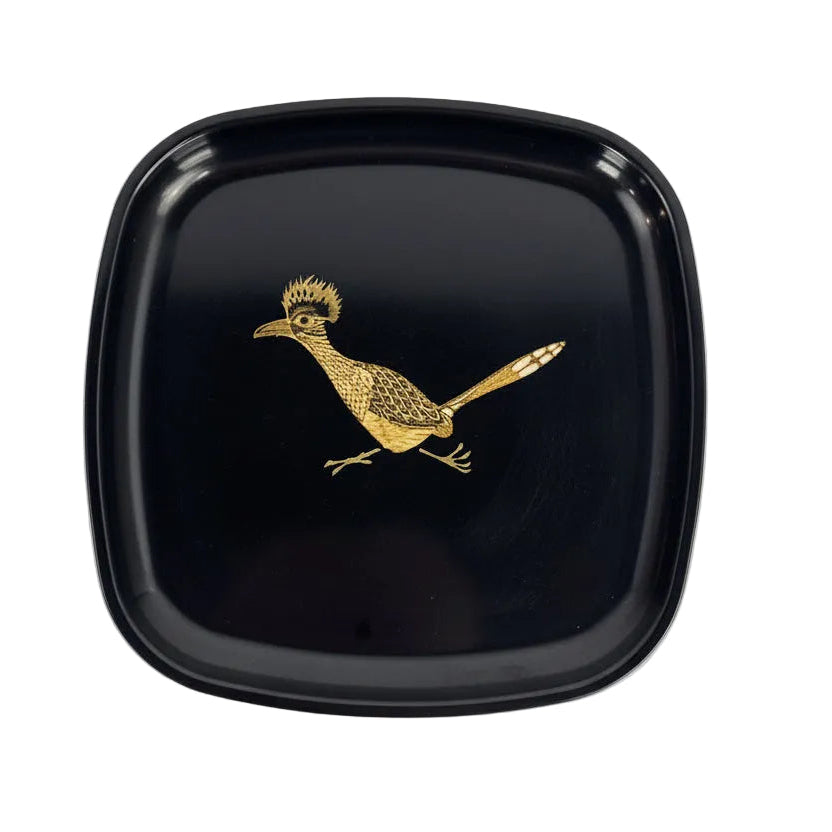 Square collectible Couroc tray with rounded corners and an inlaid running roadrunner design. In good vintage condition with some scuffing from age as shown.