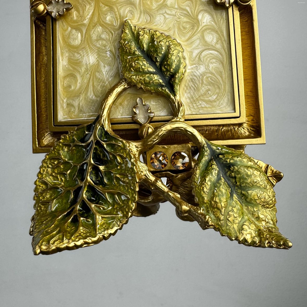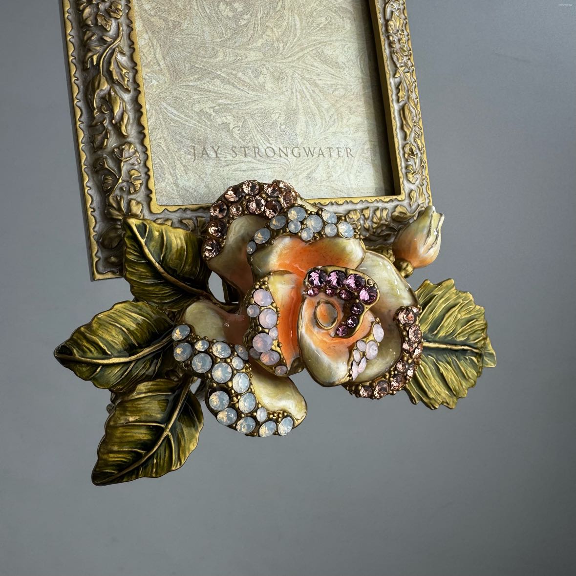 Cast in pewter, finished in 14K Gold, the frame itself is washed in a thin layer of cream enamel to allow the gold floral pattern to shine through. The rose is painted in layers of translucent pale pink enamels and sparkles with opal shaded crystals from Swarovski.