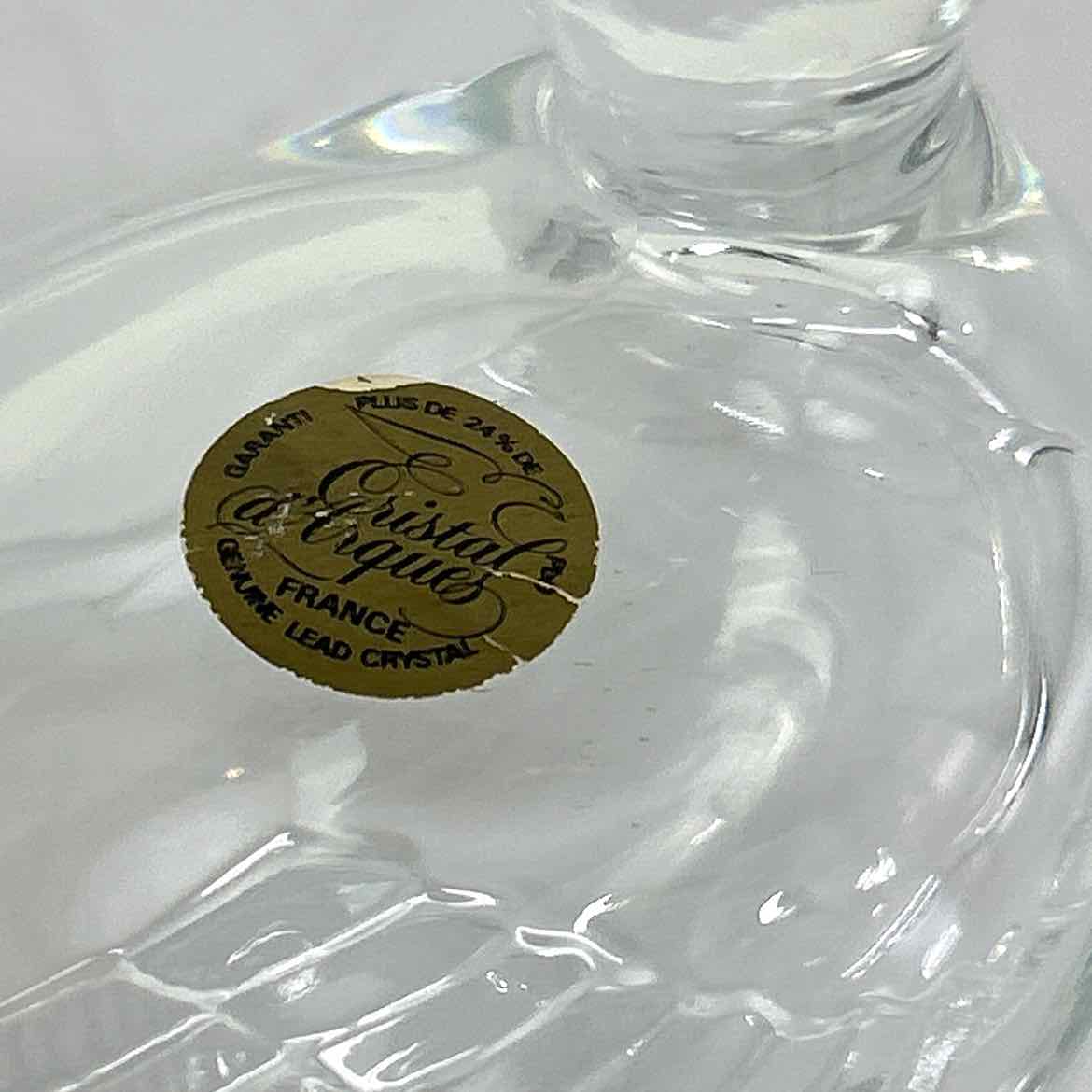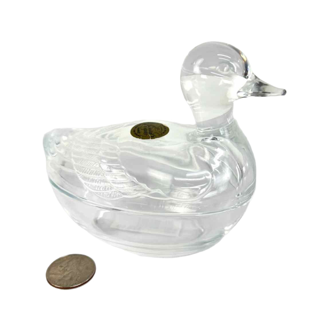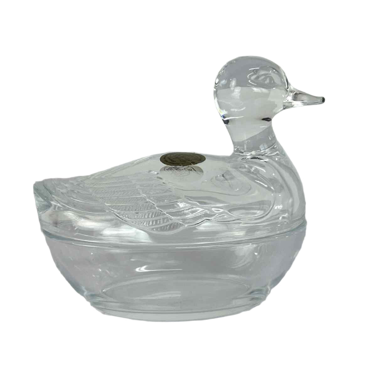 French crystal box in the shape of a duck with delicate wing details and original sticker. In excellent vintage condition.
