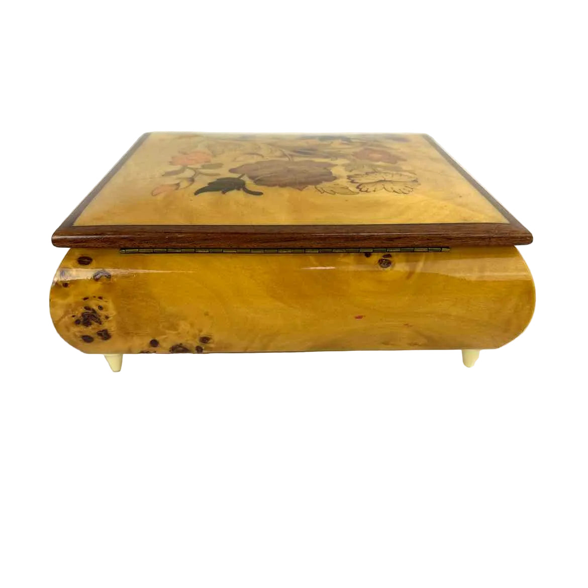Italian mid-century burl wood marquetry jewelry box with fine wooden inlay details, a Swiss musical movement, & and what look like ivory bakelite feet. The original key is not included, although it is intended to lock. Very good vintage condition.