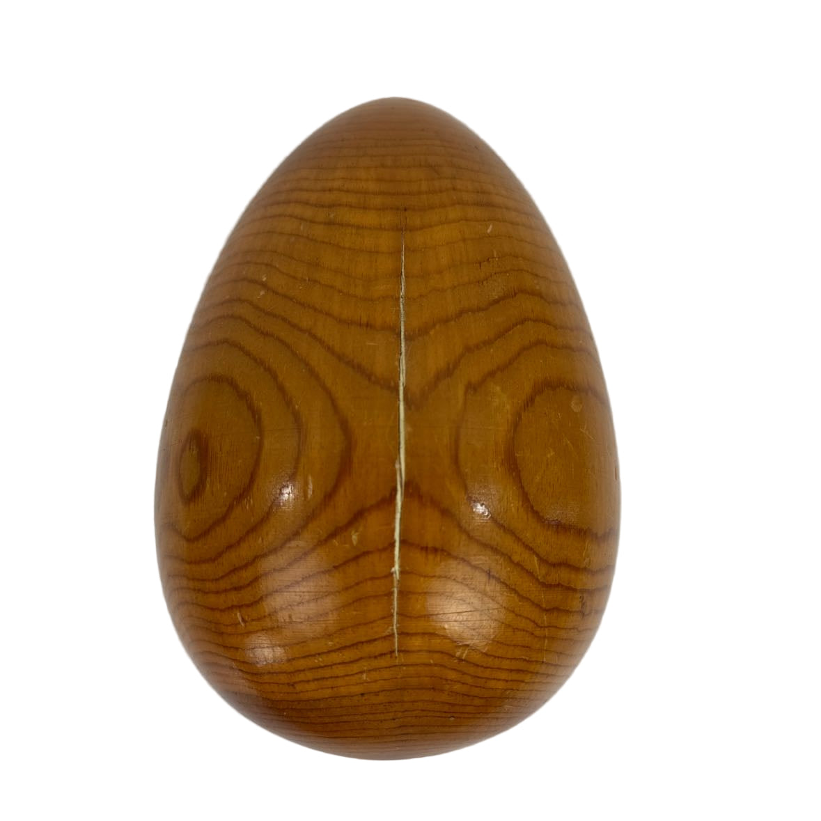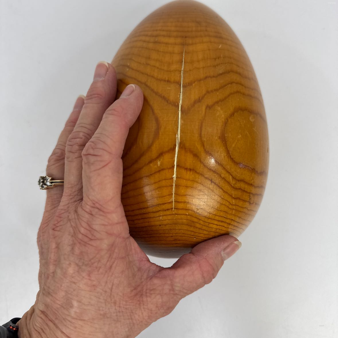 Large hand turned birch wooden egg, with a few dings and a crack on one side from age. In otherwise good vintage condition, a nice warm and natural piece to add to a bookshelf.