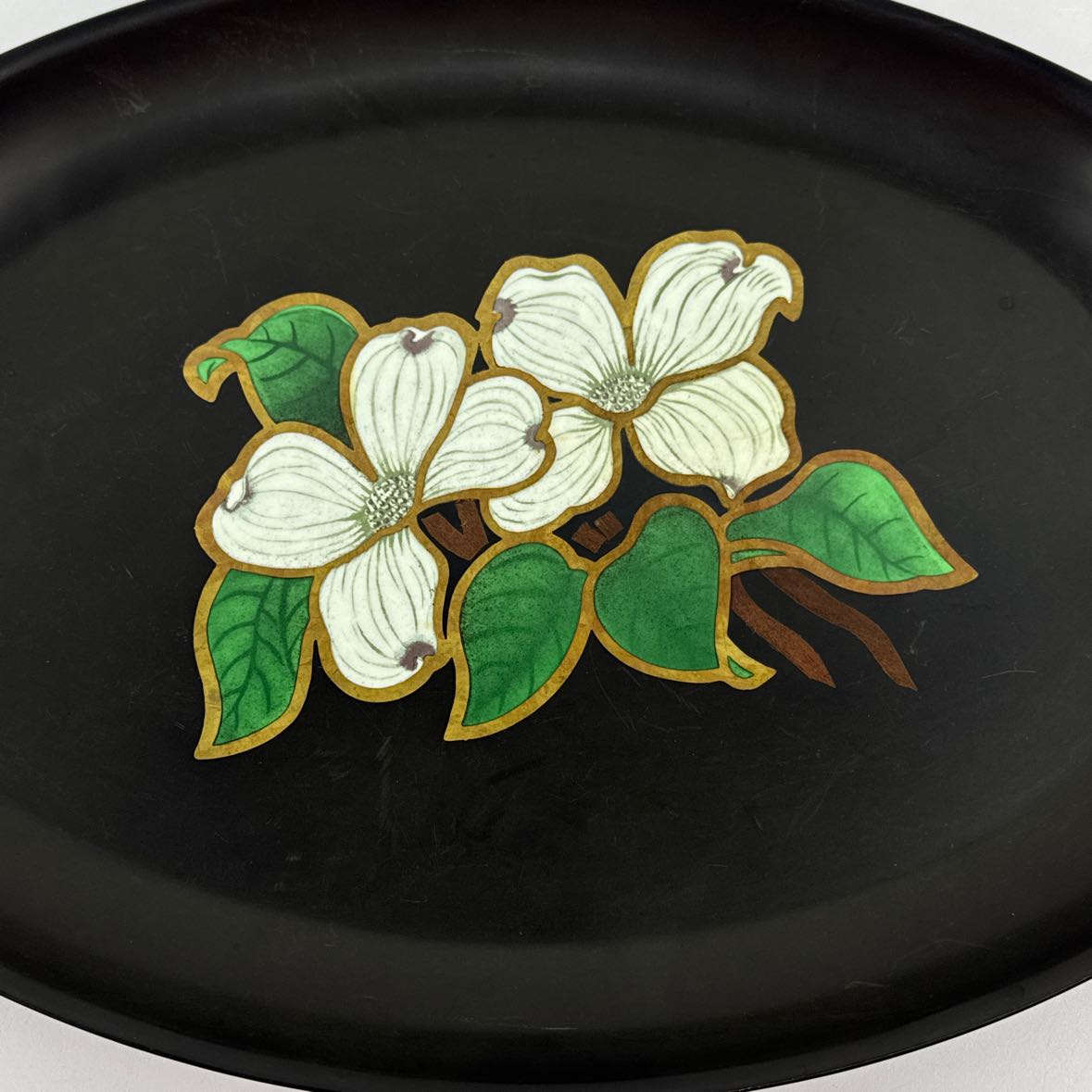 Mid-century Couroc of California brass inlay magnolias or dogwood flowers floral tray with oval shape. In very good vintage condition with light scuffs from age.