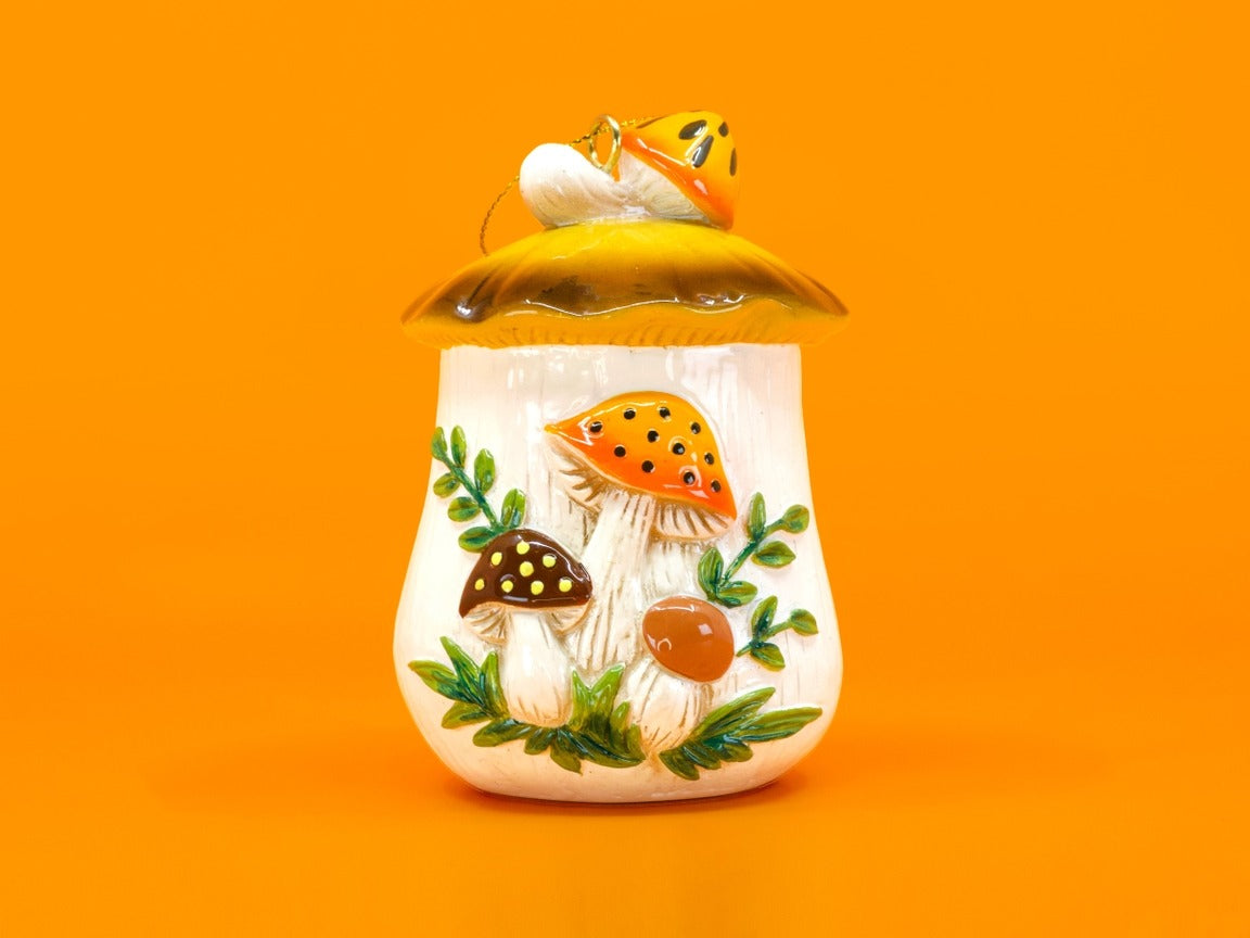 Merry Mushroom | Vintage Sears canisters inspired ornament | Sculpted resin with metal hook & gold string | Ships in a box with molded styrofoam for protection.