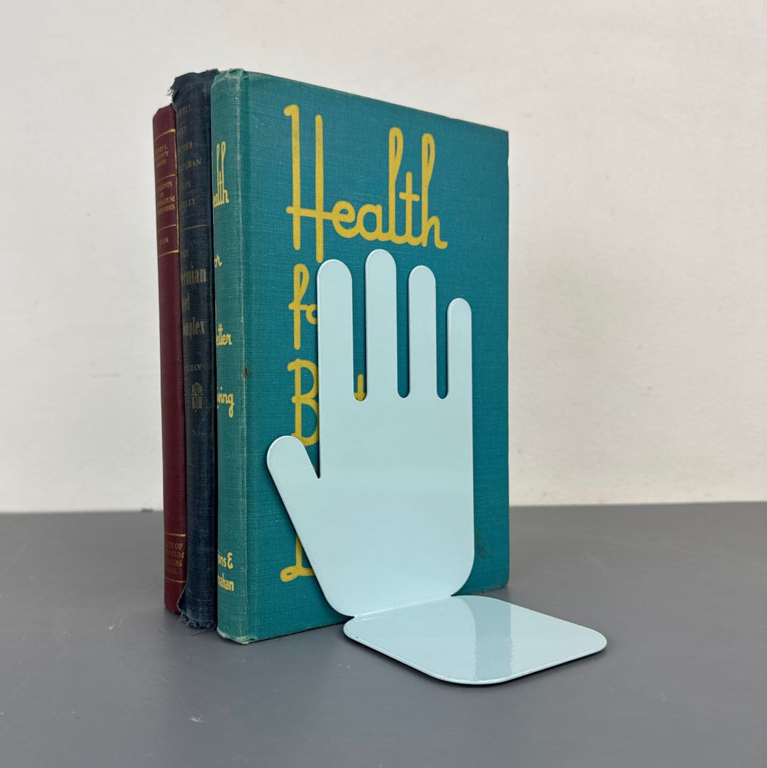 SINGLE rare discontinued pale blue-gray hand metal bookend designed by Jonathan Adler for Barnes & Noble. In excellent vintage condition with a foam rubber underside.