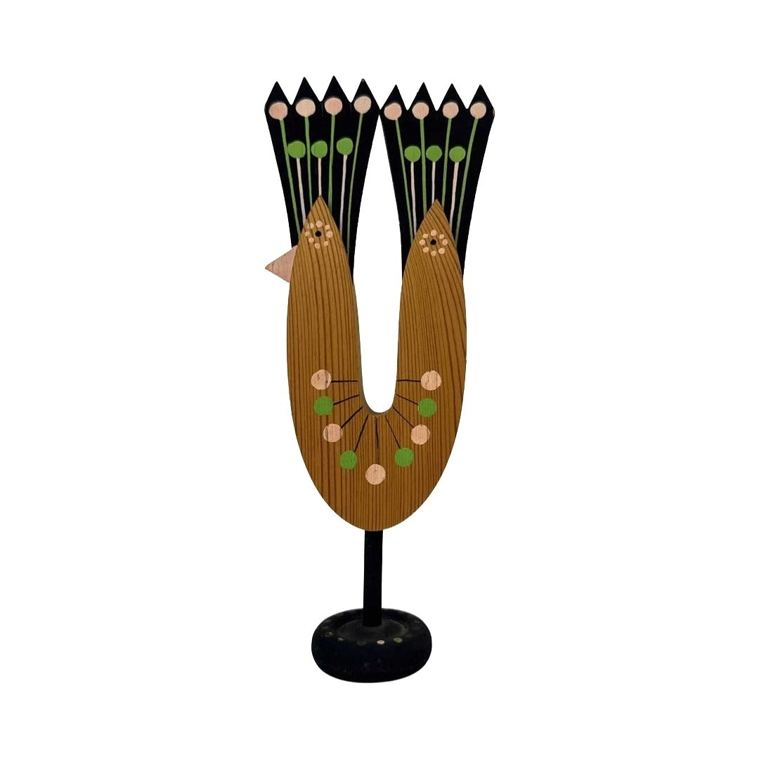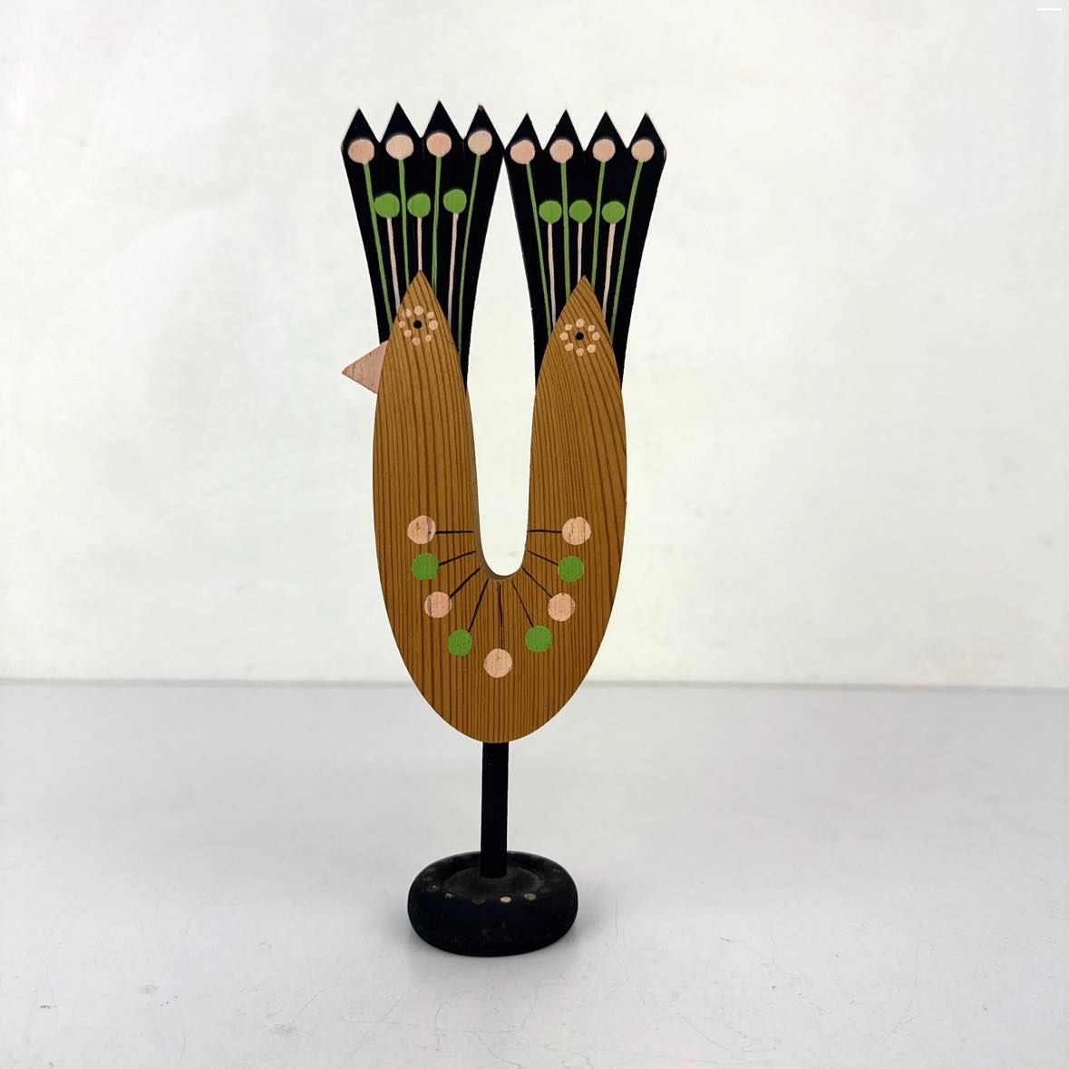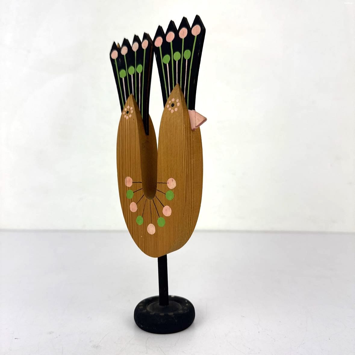 Handmade and painted Norwegian modern bird, made in Midland, Texas by a local artisan of Norwegian heritage. In very good vintage condition with a repaired beak as shown. Colors are pale pink, green & black with old growth pine wood.