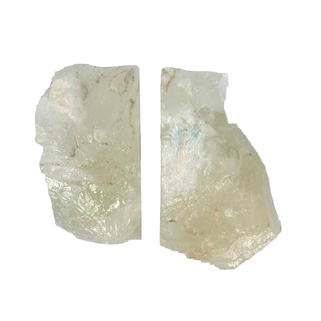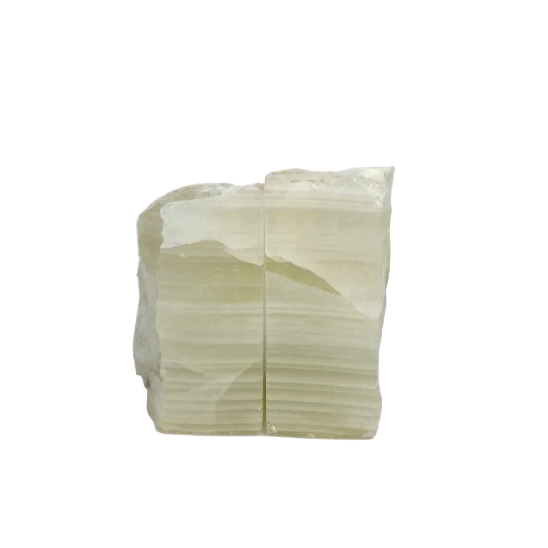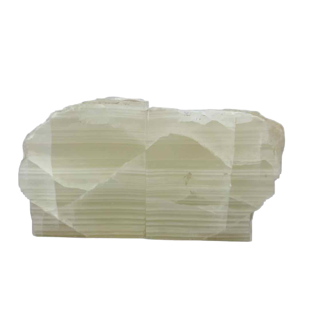 PAIR heavy onyx stone bookends with nice striations. They have cut and polished edges as well as rough ones, and add a nice natural element and light color to a bookshelf.