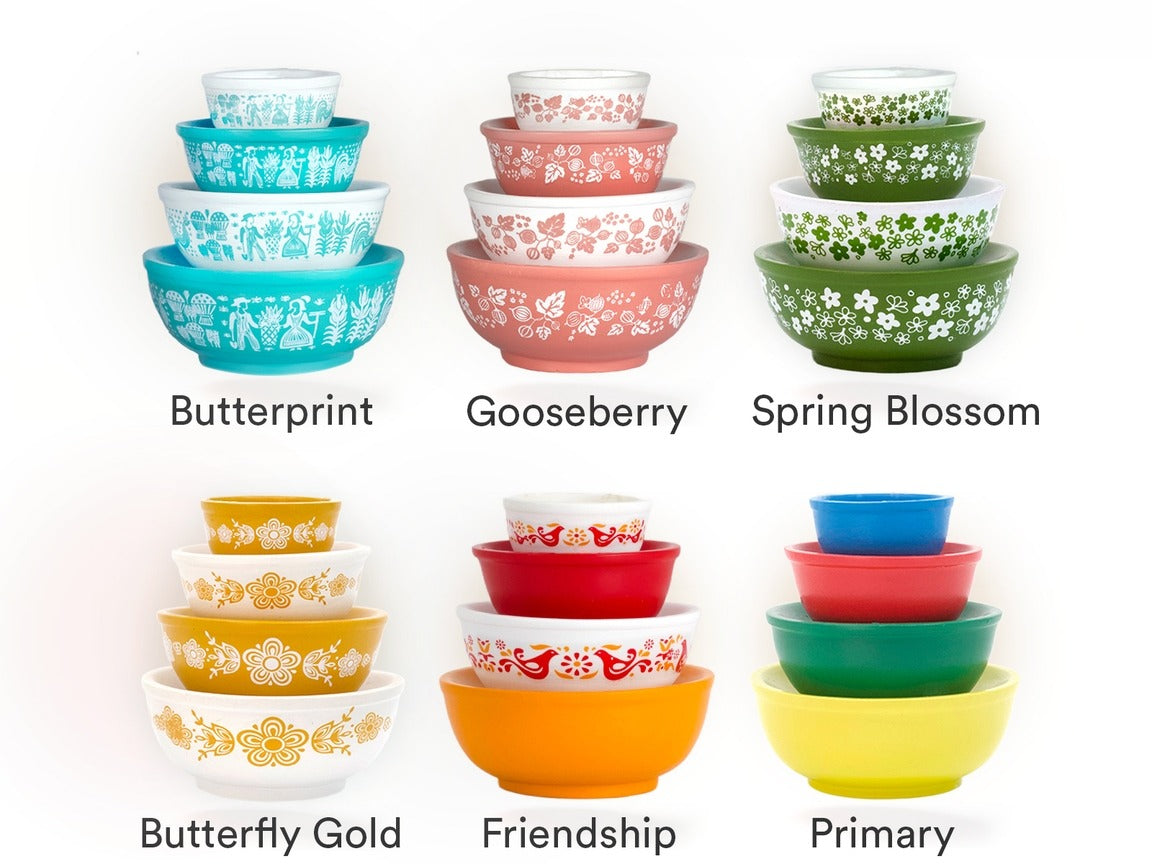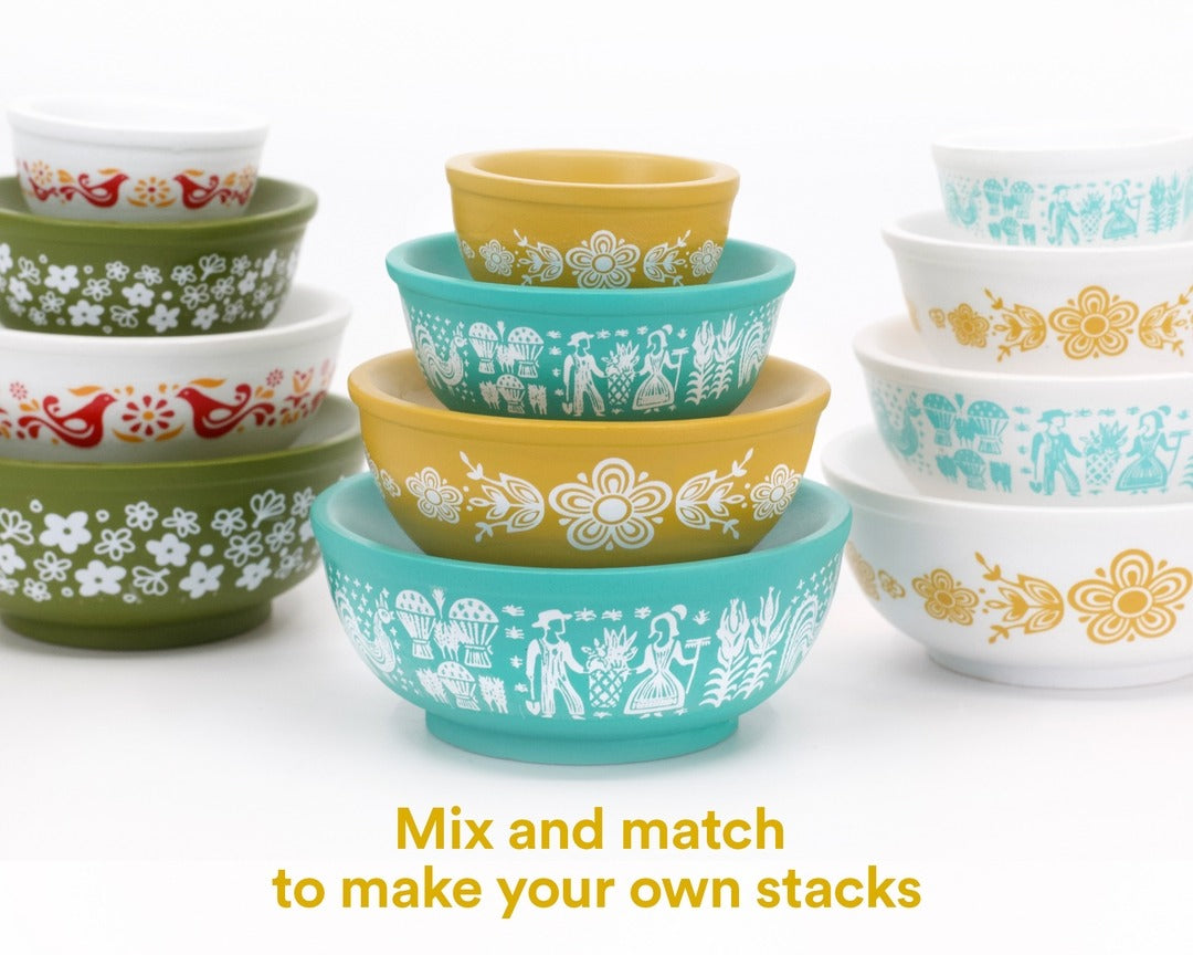 Stackable miniature Pyrex-inspired mixing bowls. These charming mini bowls capture the iconic patterns and vibrant colors of classic pyrex designs, perfectly sized to complement your collection.