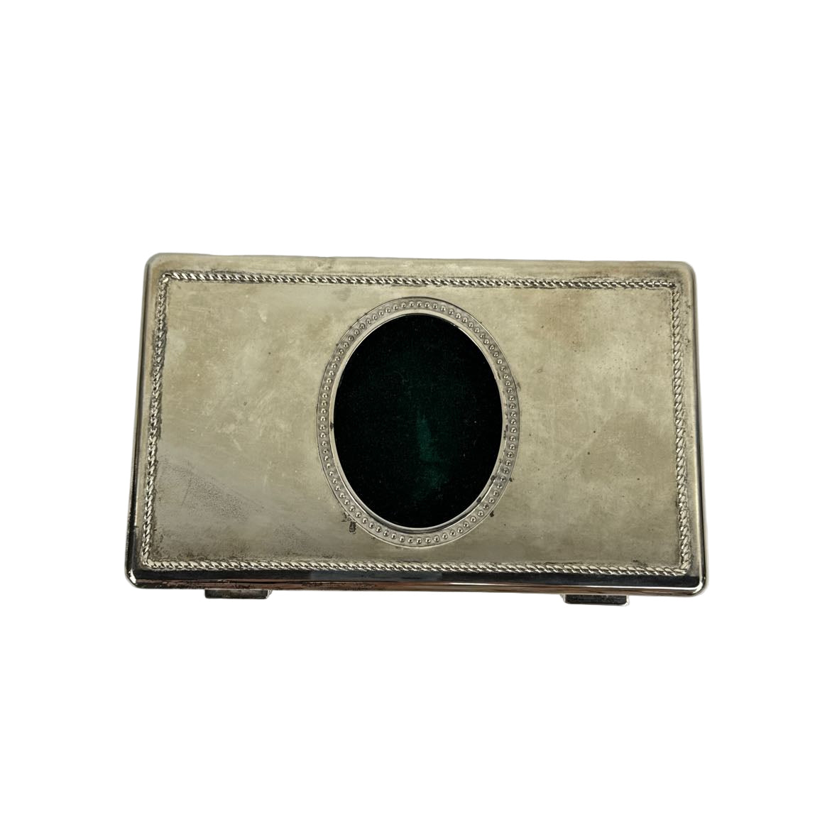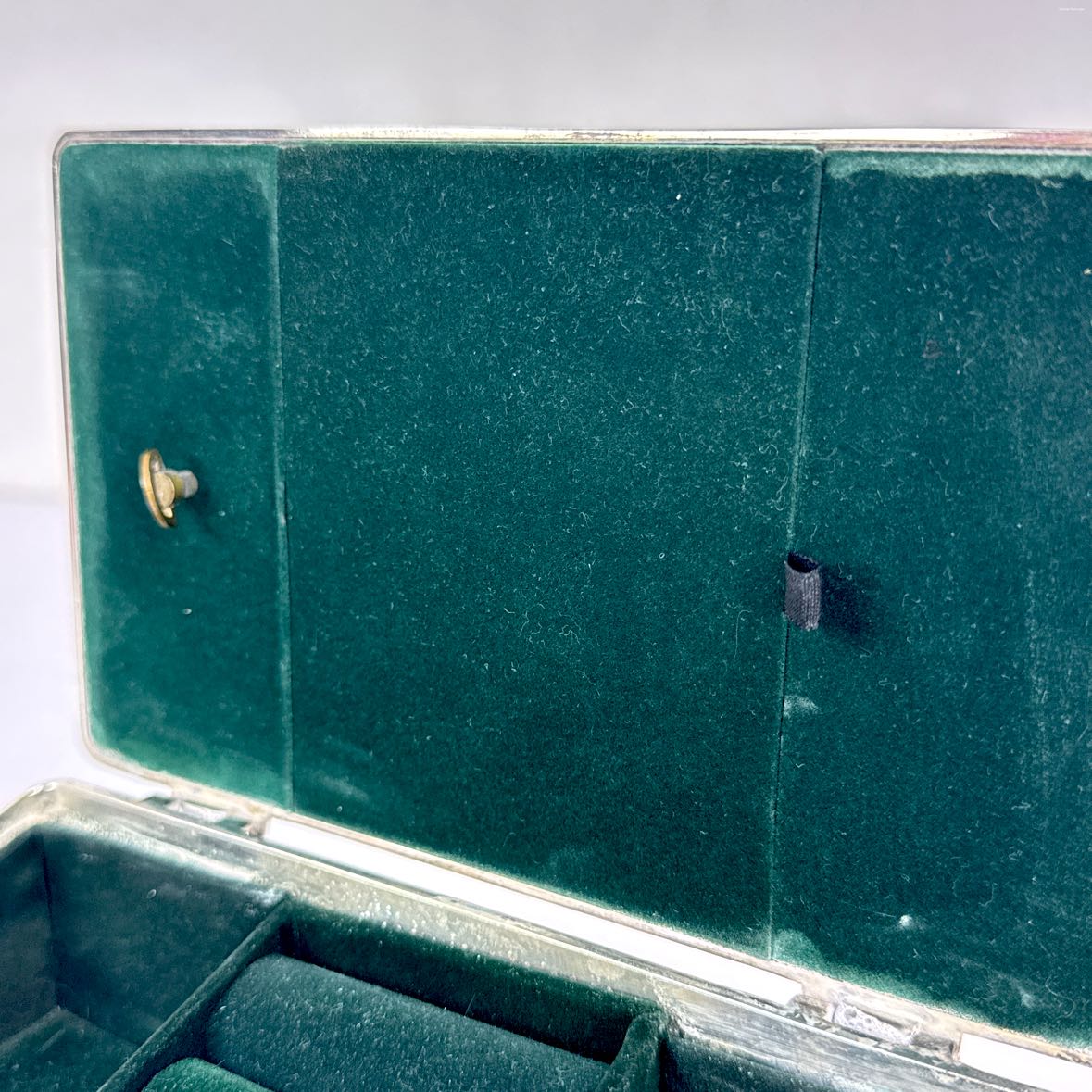 Vintage silver plated or toned jewelry box with oval cutout picture frame holder on the lid and music box. Lined with green velvet, it is in very good vintage condition with a bit of wear and patina from age.